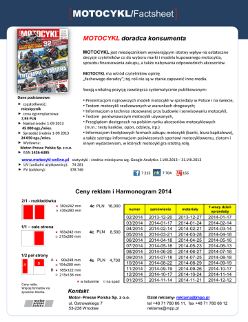 [MOTOCYKL/Factsheet] MOTOCYKL doradca konsumenta MOTOCYKL jest miesięcznikiem wywierającym istotny wpływ na ostateczne decyzje czytelników co do wyboru marki i modelu kupowanego motocykla, sposobu finansowania zakupu, a także nabywania odpowiednich akcesoriów. MOTOCYKL ma wśród czytelników opinię „fachowego doradcy”; tej roli nie są w stanie zapewnić inne media. Swoją unikalną pozycję zawdzięcza systematycznie publikowanym: Dane podstawowe: • Prezentacjom najnowszych modeli motocykli w sprzedaży w Polsce i na świecie, • Testom motocykli realizowanych w warunkach drogowych; • Informacjom o technice stosowanej przy budowie i serwisowaniu motocykli, • Testom porównawczym motocykli używanych, • Przeglądom dostępnych na polskim rynku akcesoriów motocyklowych (m.in.: testy kasków, opon, odzieży, itp.) • Informacjom kredytowych formach zakupu motocykli (banki, biura kapitałowe), a także szeregu informacjom poświeconych sportowi motocyklowemu, zlotom i innym wydarzeniom, w których motocykl gra istotną rolę. częstotliwość: miesięcznik cena egzemplarzowa: 7,95 PLN Nakład średni 1-09 2013 45 000 egz./mies. Sprzedaż średnia 1-09 2013 24 050 egz./mies. Wydawca: Motor-Presse Polska Sp. z o.o. ISSN 1426-6385 www.motocykl-online.pl statystyki : średnia miesięczna wg. Google Analytics 1.VIII.2013 – 31.VIII.2013 UV (unikalni użytkownicy): 74 281 PV (odsłony): 378 746 7 215 7 704 155 Ceny reklam i Harmonogram 2014 2/1 - rozkładówka 392x242 mm 430x280 mm 4c PLN 16,000 1/1 – cała strona 183x242 mm 215x280 mm 4c PLN 8,500 A 90x248 mm 104x280 mm 4c PLN 4,700 B 185x122 mm 215x138 mm 1/2 pół strony A B B Ceny netto. Więcej formatów na życzenie klienta. w kolumnie na spad numer zamówienie materiały 1-wszy dzień sprzedaży 02/2014 03/2014 04/2014 05/2014 06/2014 07/2014 08/2014 09/2014 10/2014 11/2014 12/2014 01/2015 2013-12-20 2014-01-17 2014-02-14 2014-03-21 2014-04-18 2014-05-16 2014-06-20 2014-07-18 2014-08-22 2014-09-19 2014-10-17 2014-11-14 2013-12-27 2014-01-24 2014-02-21 2014-03-28 2014-04-25 2014-05-23 2014-06-27 2014-07-25 2014-08-29 2014-09-26 2014-10-24 2014-11-21 2014-01-17 2014-02-14 2014-03-14 2014-04-18 2014-05-16 2014-06-13 2014-07-18 2014-08-18 2014-09-19 2014-10-17 2014-11-14 2014-12-12 Kontakt Motor- Presse Polska Sp. z o.o. ul. Ostrowskiego 7 53-238 Wrocław Dział reklamy- [email protected] tel +48 71 780 66 11, fax +48 71 780 66 12 [email protected] [MOTOCYKL/Czytelnik] ROZKŁAD PŁCI kobiety 10% mężczyźni 90% 90% czytelników to aktywni i mający wielką satysfakcję z jazdy motocyklem mężczyźni. STRUKTURA WIEKOWA do 24 lat 14,5% 25 – 39 lat 58,7% 40 + lat 26,7% ROCZNY PRZEBIEG 0-4 tys. km 22,6% 4 -6 tys. km 25,8% 6 - 8 tys. km 15,5% 8 tys.+ km 36,1% blisko 59% czytelników to to ludzie w wieku najwyższej aktywności zawodowej. Osoby będące „na swoim”, dla których jazda motocyklem to wspaniały sposób spędzania wolnego czasu. Średnio czytelnicy Motocykla przejeżdżają rocznie 7800 km. Prawie 26% czytelników przejeżdża rocznie między 4 a 6 tysięcy kilometrów, a ponad 36% przejeżdża dystans powyżej 8 tys. km i więcej. POSIADANIE MOTOCYKLI posiada motocykl 85,3% kupiony jako nowy 14,8% Jak wynika z przeprowadzonych badań 85,3% naszych czytelników posiada motocykl. 14,8% posiada maszyny o pojazdy kupione jako nowe. PLANY ZAKUPOWE CZYTELNIKÓW uniwersalne 13,8% nakedy 23,4% skutery 1,7% choppery & cruisery 47,7% naszych czytelników deklaruje chęć zakupu motocykla w ciągu najbliższych 24 miesięcy. Czytelnicy najczęściej wskazują zainteresowanie nakedami 23% 7,9% enduro & supermoto 16,5% sportowe Na motocykle uniwersalne, enduro i sportowe przypada podobna ilość około 15% deklaracji zakupowych. 15,1% turystyczne 6,2% 0% 5% 10% 15% 20% 25% 30% Dane opracowane na podstawie badania „BEST BIKES 2013”