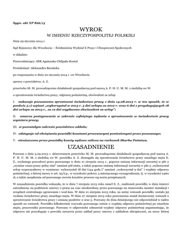 Sygn. akt XP 826/13 WYROK W IMIENIU RZECZYPOSPOLITEJ POLSKIEJ Dnia 29 stycznia 2014 r. Sąd Rejonowy dla Wrocławia – Śródmieścia Wydział X Pracy i Ubezpieczeń Społecznych w składzie: Przewodniczący: SSR Agnieszka Chlipała-Kozioł Protokolant: Aleksandra Barańska po rozpoznaniu w dniu 20 stycznia 2014 r. we Wrocławiu sprawy z powództwa: A. Z. przeciwko M. M. prowadzącemu działalność gospodarczą pod nazwą A. P. H. U. M. M. z siedzibą we W. o sprostowanie świadectwa pracy, odprawę pośmiertną, ekwiwalent za urlop I. nakazuje pozwanemu sprostować świadectwo pracy z dnia 14.08.2013 r. w ten sposób, że w punkcie 5.1) wpisać „wykorzystał w 2013 r. 5 dni urlopu za 2012 r. oraz 6 dni z przysługujących 18 dni urlopu za 2013 r., za 12 dni wypłacono ekwiwalent za urlop”; II. umarza postępowanie w zakresie cofniętego żądania o sprostowanie w świadectwie pracy wymiaru pracy; III. w pozostałym zakresie powództwo oddala; IV. odstępuje od obciążania powódki kosztami procesowymi poniesionymi przez pozwanego; V. nieuiszczone przez powódkę koszty sądowe zalicza na rachunek Skarbu Państwa. UZASADNIENIE Pozwem z dnia 5.09.2013 r. skierowanym przeciwko M. M. prowadzącemu działalność gospodarczą pod nazwą A. P. H. U. M. M. z siedzibą we W. powódka A. Z. domagała się sprostowania świadectwa pracy zmarłego męża E. Z., wydanego powodowi przez pozwanego w dniu 21 sierpnia 2013 r., poprzez zmianę informacji zawartej w pkt 2 „wymiar czasu pracy pełny etat” zamiast pół etatu, a także poprzez zmianę informacji zawartej w pkt 5 „wykorzystał urlop wypoczynkowy w wymiarze: wykorzystał 18 dni (144 godz.)” zamiast „wykorzystał 9 dni” i wypłaty odprawy pośmiertnej, o której mowa w art. 93 k.p., w wysokości połowy 3 miesięcznego wynagrodzenia, tj. w wysokości 2460 zł, a także zasądzenia od pozwanego zwrotu kosztów procesu wg norm przepisanych. W uzasadnieniu powódka wskazała, że w dniu 7 sierpnia 2013 roku zmarł E. Z., małżonek powódki, w dniu śmierci zatrudniony na podstawie umowy o pracę na czas nieokreślony przez pozwanego na stanowisku monter instalacji i urządzeń centralnego ogrzewania i wod-kan. W dniu 21 sierpnia 2013 roku, na ustny wniosek powódki, zostało jej wydane świadectwo pracy zmarłego męża. W dniu 27 sierpnia 2013 roku pozwanemu został dostarczony wniosek o sprostowanie świadectwa pracy i zmianę punktów 2 oraz 5. Pozwany do dnia dzisiejszego nie odpowiedział w żaden sposób na wniosek. Powódka kilkakrotnie wzywała pozwanego ustnie o wypłatę odprawy pośmiertnej po zmarłym mężu, pracowniku pozwanego. Pozwany w odpowiedzi odmawiał wypłaty odprawy pośmiertnej argumentując, że odprawa nie przysługuje z powodu zawarcia przez zakład pracy umowy z zakładem ubezpieczeń, na mocy której ubezpieczył pracowników na życie. Powódka jednak uważa te argumenty za niezasadne z powodu nie opłacania przez pozwanego pracodawcę całości składki ubezpieczeniowej. Z obowiązku wypłaty odprawy pośmiertnej w trybie art. 93 § 1 k.p. nie zwalnia fakt wypłaty odszkodowania z ubezpieczenia, w ramach którego pracownik pokrywa koszty związane z odprowadzeniem składki wraz z pracodawcą. W takiej sytuacji wypłata tego typu odszkodowania może być zdaniem powódki traktowana wyłącznie jako dodatkowe świadczenie należne uprawnionym podmiotom w związku ze śmiercią pracownika, którego wypłacenie nie wyłącza ani nie ogranicza prawa do odprawy pośmiertnej z art. 93 § 1 KP. W konsekwencji, należność z tytułu odszkodowania z umowy ubezpieczenia, którego kapitał współfinansowany był przez pracownika, nie podlega zaliczeniu na poczet odprawy pośmiertnej. Dokładnie takie samo stanowisko przedstawia Ministerstwo Pracy i Polityki Społecznej w piśmie z dnia 11 marca 2011 roku, nr SPS-023-21116/11: „Powołane przepisy art. 93 § 1 KP nie obejmują sytuacji, gdy pracodawca zawarł z zakładem ubezpieczeń umowę o tzw. ubezpieczenie grupowe pracowników, w ramach którego pracownicy dobrowolnie deklarują wysokość wpłacanych przez nich składek, które są potrącane przez pracodawcę z wynagrodzenia pracowników’ W odpowiedzi na pozew pozwany domagał się oddalenia powództwa w całości i zasądzenia na jego rzecz kosztów procesu według norm przepisanych. W uzasadnieniu wskazał, że E. Z. przez cały okres zatrudnienia u pozwanego pracował w pełnym wymiarze czasu pracy, tj. na pełen etat, i taka też informacja została przez pozwanego podana w świadectwie pracy zmarłego pracownika. Pozwany zakwestionował prawdziwość twierdzeń powódki dotyczących wymiaru urlopu wypoczynkowego wykorzystanego przez E. Z.. Wskazał, że zmarły E. Z. w roku kalendarzowym 2013 r. wykorzystał łącznie 11 dni urlopu wypoczynkowego. Z uwagi na fakt, że w roku kalendarzowym 2012 przysługujący urlop wypoczynkowy nie został przez męża powódki wykorzystany w pełnym wymiarze, na poczet 11-dniowego urlopu udzielonego w roku 2013 zostało zaliczone 5 dni urlopu wypoczynkowego, których zmarły nie wykorzystał w roku poprzednim. Z uwagi na okoliczność, że w dniu 7 sierpnia 2013 r. E. Z. zmarł – wymiar urlopu wypoczynkowego przysługującego mu w roku kalendarzowym 2013 wyniósł 18 dni (tj. został skrócony proporcjonalnie do przepracowanego w danym roku okresu; por. art. 1551 k.p.). Mając na uwadze powyższe stwierdzić należy, że mąż powódki wykorzystał 6 z 18 dni urlopu wypoczynkowego przysługującego mu w roku 2013, ekwiwalent z tytułu niewykorzystanego urlopu wypoczynkowego przysługiwał zatem za 12 dni (ekwiwalent ten został wypłacony powódce przez pracodawcę), co zostało potwierdzone w ust. 5 pkt 1 świadectwa pracy. Należy zatem stwierdzić, że także w tym zakresie żądanie powódki dotyczące sprostowania informacji zawartych w świadectwie pracy nie znajduje uzasadnienia. Odnosząc się do zawartego w pozwie żądania powódki wypłaty odp