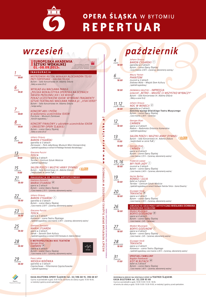 październik wrzesień EUROPEJSKA AKADEMIA SZTUKI WOKALNEJ 01.-08.09.2013r. 1 18:00 Mistrzowski recital wokalny ALEKSANDRA TELIGI przy fortepianie – Halina Teliga Bytom – Sala Koncertowa im. Adama Didura Johann Strauss piątek 18:00 Dofinansowano ze Ârodków Narodowego Centrum Kultury w ramach Programu Narodowego Centrum Kultury – Kultura – Interwencje Inauguracja niedziela 4 piątek 19:30 6 Maury Yeston niedziela 18:00 Wykład dra Wacława Panka: „Polska wokalistyka operowa na scenach świata przełomu XIX i XX wieku”; pokaz uczestników IEASW: Wybrane fragmenty sztuki teatralnej Wacława Panka pt. „VIVA VERDI” /wstęp wolny/ sobota 18:00 niedziela 18:00 18:00 11,12 Koncert arii i pieśni w wykonaniu uczestników IEASW 18:00 Koncert finałowy z udziałem uczestników IEASW i orkiestry Opery Śląskiej 12 sobota 18:00 Bytom – scena Opery Śląskiej piątek 19:00 operetka w 3 aktach Żarnowiec – Park zabytkowy Muzeum Marii Konopnickiej /spektakl wyjazdowy w ramach IX Polskiego Festiwalu Narodowego/ 13 piątek 19:00 opera w 3 aktach Tarnów – Centrum Sztuki Mościce SALON POEZJI I MUZYKI ANNY DYMNEJ 21 Maria Stuarda III opera w 2 aktach Bytom – scena Opery Śląskiej /Czas trwania: 2,15 h – 1 przerwa; abonamenty ważne/ 22 niedziela 18:00 poniedziałek 18:00 15,16 Johann Strauss Baron cygański 18:00 środa 18:00 19 sobota 19:00 sobota 18:00 I operetka w 3 aktach Bytom – scena Opery Śląskiej Giacomo Puccini Tosca 20 18:00 Gaetano Donizetti Maria Stuarda opera w 2 aktach Sanok – Sanocki Dom Kultury 4 M ETR O P O LITALNA N O C TEATR Ó W Georges Bizet VI opera w 4 aktach Bytom – scena Opery Śląskiej /czas trwania: 3,15 h – 3 przerwy; abonamenty ważne/ 29 niedziela 18:00 I Franz Lehar WESOŁA WDÓWKA operetka w 3 aktach Częstochowa – Filharmonia Częstochowska / spektakl wyjazdowy/ KASA BILETOWA OPERY ŚL ĄSKIEJ te l. 3 2/3 9 6 6 8 15 , 3 9 6 6 8 87 Czynna: w poniedziałki w godz. 8.00-16.00, od wtorku do soboty w godz. 10.00-18.00, w niedzielę 2 godziny przed spektaklem. Frederick Loewe MY FAIR LADY I musical w 2 aktach Bytom – scena Opery Śląskiej Hector Berlioz Romeo i Julia balet w 2 aktach Tarnów – Centrum Sztuki Mościce Giuseppe Verdi Traviata III opera w 4 aktach Bytom – scena Opery Śląskiej /czas trwania: 2,45 h – 2 przerwy, abonamenty ważne/ 26 sobota 18:00 opera w 3 aktach Katowice – scena Teatru Śląskiego Carmen Carmen /spektakl wyjazdowy w ramach Festiwalu Teatrów Tańca – Scena Otwarta/ Jubileusz 55-lecia pracy artystycznej WIESŁAWA OCHMANA W z n ow i e n i e s c e n i c z n e Modest Musorgski VI BORYS GODUNOW opera w 4 aktach Bytom – scena Opery Śląskiej /czas trwania: 2,45 – 1 przerwa/ 27 niedziela 18:00 /spektakl wyjazdowy w ramach XXIII Festiwalu im. Adama Didura/ 28 SALON POEZJI I MUZYKI ANNY DYMNEJ /czas trwania: 2,40 h – 1 przerwa; abonamenty ważne/ /spektakl wyjazdowy; czas trwania: 2,30 h – 2 przerwy; abonamenty ważne/ 25 opera w 4 aktach Radom – Radomska Orkiestra Kameralna /czas trwania: 3,15 h – 3 przerwy; abonamenty ważne/ niedziela /czas trwania: 2,50 h – 2 przerwy; abonamenty ważne/ 23 Carmen Georges Bizet wtorek, środa I n au g u r a c j a 6 9 . s e z o n u a rt ys t y c z n e g o Gaetano Donizetti 18:00 Georges Bizet 18:00 TOSCA Bytom – Sala Koncertowa im. Adama Didura /wejściówki w cenie 1 zł / sobota operetka w 2 aktach Gościnny występ Gliwickiego Teatru Muzycznego Bytom – scena Opery Śląskiej opera w 4 aktach Bytom – scena Opery Śląskiej niedziela 11:00 II Noc w Wenecji 11:00 Giacomo Puccini /spektakl wyjazdowy/ 15 Johann Strauss Bytom – Sala Koncertowa im. Adama Didura /wejściówki w cenie 1 zł / niedziela Baron cygański wybaczy” /spektakl wyjazdowy/ 13 Johann Strauss ZASMAKUJ MUZYKI – Impressja Koncert „Retro – miłość ci wszystko Bytom – Sala Koncertowa im. Adama Didura /czas trwania: 2,30 h – 1 przerwa/ Pszczyna – Muzeum Zamkowe /bilety w cenie 20 zł/ 6 musical w 2 aktach Stalowa Wola – Miejski Dom Kultury /Bilety w cenie 10 zł/ piątek, sobota /koncert wyjazdowy / 8 Phantom /spektakl wyjazdowy/ Bytom – Sala Koncertowa im. Adama Didura 7 operetka w 3 aktach Bytom – scena Opery Śląskiej /sczas trwania: 2,50 h – 2 przerwy; abonamenty ważney/ /bilety w cenie 20 zł/ 6 I Baron cygański Modest Musorgski I BORYS GODUNOW opera w 4 aktach Bytom – scena Opery Śląskiej /czas trwania: 2,45 – 1 przerwa; abonamenty ważne/ 28 poniedziałek 18:00 Giuseppe Verdi Traviata opera w 4 aktach Katowice – scena Teatru Śląskiego /spektakl wyjazdowy; czas trwania: 2,45 h – 2 przerwy, abonamenty ważne/ 31 czwartek 17:00 Spektakl familijny Bogdan Pawłowski Kot w butach VI balet w 2 aktach Bytom – scena Opery Śląskiej /czas trwania: 1,40 h – 1 przerwa; abonamenty ważne/ rezerwacja miejsc na spektakle Opery w KASA BILETOWA tel. 32/ 259 93 60 Teatrz e Śląski m : Czynna w poniedziałki w godz. 10.00-13.00 i 13.30- 18.00, od wtorku do soboty w godz. 10.00-13.00 i 13.30-19.00, w niedzielę 2 godziny przed spektaklem.