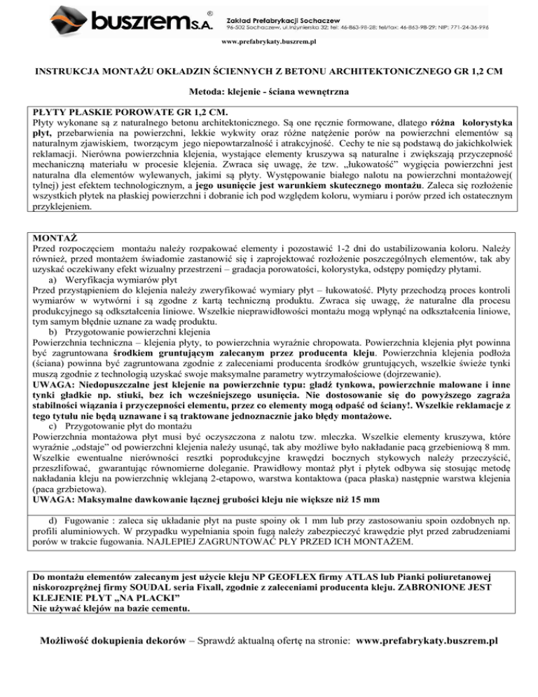 Nie można obecnie wy świetlić tego obrazu. www.prefabrykaty.buszrem.pl INSTRUKCJA MONTAŻU OKŁADZIN ŚCIENNYCH Z BETONU ARCHITEKTONICZNEGO GR 1,2 CM Metoda: klejenie - ściana wewnętrzna PŁYTY PŁASKIE POROWATE GR 1,2 CM. Płyty wykonane są z naturalnego betonu architektonicznego. Są one ręcznie formowane, dlatego różna kolorystyka płyt, przebarwienia na powierzchni, lekkie wykwity oraz różne natężenie porów na powierzchni elementów są naturalnym zjawiskiem, tworzącym jego niepowtarzalność i atrakcyjność. Cechy te nie są podstawą do jakichkolwiek reklamacji. Nierówna powierzchnia klejenia, wystające elementy kruszywa są naturalne i zwiększają przyczepność mechaniczną materiału w procesie klejenia. Zwraca się uwagę, że tzw. „łukowatość” wygięcia powierzchni jest naturalna dla elementów wylewanych, jakimi są płyty. Występowanie białego nalotu na powierzchni montażowej( tylnej) jest efektem technologicznym, a jego usunięcie jest warunkiem skutecznego montażu. Zaleca się rozłożenie wszystkich płytek na płaskiej powierzchni i dobranie ich pod względem koloru, wymiaru i porów przed ich ostatecznym przyklejeniem. MONTAŻ Przed rozpoczęciem montażu należy rozpakować elementy i pozostawić 1-2 dni do ustabilizowania koloru. Należy również, przed montażem świadomie zastanowić się i zaprojektować rozłożenie poszczególnych elementów, tak aby uzyskać oczekiwany efekt wizualny przestrzeni – gradacja porowatości, kolorystyka, odstępy pomiędzy płytami. a) Weryfikacja wymiarów płyt Przed przystąpieniem do klejenia należy zweryfikować wymiary płyt – łukowatość. Płyty przechodzą proces kontroli wymiarów w wytwórni i są zgodne z kartą techniczną produktu. Zwraca się uwagę, że naturalne dla procesu produkcyjnego są odkształcenia liniowe. Wszelkie nieprawidłowości montażu mogą wpłynąć na odkształcenia liniowe, tym samym błędnie uznane za wadę produktu. b) Przygotowanie powierzchni klejenia Powierzchnia techniczna – klejenia płyty, to powierzchnia wyraźnie chropowata. Powierzchnia klejenia płyt powinna być zagruntowana środkiem gruntującym zalecanym przez producenta kleju. Powierzchnia klejenia podłoża (ściana) powinna być zagruntowana zgodnie z zaleceniami producenta środków gruntujących, wszelkie świeże tynki muszą zgodnie z technologią uzyskać swoje maksymalne parametry wytrzymałościowe (dojrzewanie). UWAGA: Niedopuszczalne jest klejenie na powierzchnie typu: gładź tynkowa, powierzchnie malowane i inne tynki gładkie np. stiuki, bez ich wcześniejszego usunięcia. Nie dostosowanie się do powyższego zagraża stabilności wiązania i przyczepności elementu, przez co elementy mogą odpaść od ściany!. Wszelkie reklamacje z tego tytułu nie będą uznawane i są traktowane jednoznacznie jako błędy montażowe. c) Przygotowanie płyt do montażu Powierzchnia montażowa płyt musi być oczyszczona z nalotu tzw. mleczka. Wszelkie elementy kruszywa, które wyraźnie „odstaje” od powierzchni klejenia należy usunąć, tak aby możliwe było nakładanie pacą grzebieniową 8 mm. Wszelkie ewentualne nierówności resztki poprodukcyjne krawędzi bocznych stykowych należy przeczyścić, przeszlifować, gwarantując równomierne doleganie. Prawidłowy montaż płyt i płytek odbywa się stosując metodę nakładania kleju na powierzchnię wklejaną 2-etapowo, warstwa kontaktowa (paca płaska) następnie warstwa klejenia (paca grzbietowa). UWAGA: Maksymalne dawkowanie łącznej grubości kleju nie większe niż 15 mm d) Fugowanie : zaleca się układanie płyt na puste spoiny ok 1 mm lub przy zastosowaniu spoin ozdobnych np. profili aluminiowych. W przypadku wypełniania spoin fugą należy zabezpieczyć krawędzie płyt przed zabrudzeniami porów w trakcie fugowania. NAJLEPIEJ ZAGRUNTOWAĆ PŁY PRZED ICH MONTAŻEM. Do montażu elementów zalecanym jest użycie kleju NP GEOFLEX firmy ATLAS lub Pianki poliuretanowej niskorozprężnej firmy SOUDAL seria Fixall, zgodnie z zaleceniami producenta kleju. ZABRONIONE JEST KLEJENIE PŁYT „NA PLACKI” Nie używać klejów na bazie cementu. Możliwość dokupienia dekorów – Sprawdź aktualną ofertę na stronie: www.prefabrykaty.buszrem.pl