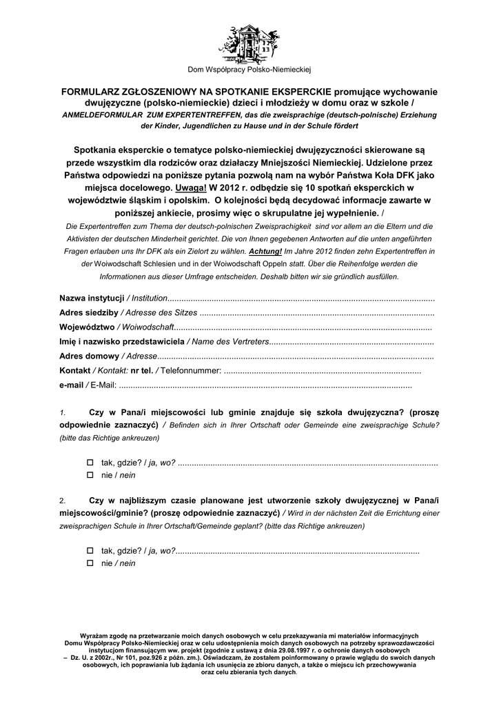 Dom Współpracy Polsko-Niemieckiej FORMULARZ ZGŁOSZENIOWY NA SPOTKANIE EKSPERCKIE promujące wychowanie dwujęzyczne (polsko-niemieckie) dzieci i młodzieży w domu oraz w szkole / ANMELDEFORMULAR ZUM EXPERTENTREFFEN, das die zweisprachige (deutsch-polnische) Erziehung der Kinder, Jugendlichen zu Hause und in der Schule fördert Spotkania eksperckie o tematyce polsko-niemieckiej dwujęzyczności skierowane są przede wszystkim dla rodziców oraz działaczy Mniejszości Niemieckiej. Udzielone przez Państwa odpowiedzi na poniższe pytania pozwolą nam na wybór Państwa Koła DFK jako miejsca docelowego. Uwaga! W 2012 r. odbędzie się 10 spotkań eksperckich w województwie śląskim i opolskim. O kolejności będą decydować informacje zawarte w poniższej ankiecie, prosimy więc o skrupulatne jej wypełnienie. / Die Expertentreffen zum Thema der deutsch-polnischen Zweisprachigkeit sind vor allem an die Eltern und die Aktivisten der deutschen Minderheit gerichtet. Die von Ihnen gegebenen Antworten auf die unten angeführten Fragen erlauben uns Ihr DFK als ein Zielort zu wählen. Achtung! Im Jahre 2012 finden zehn Expertentreffen in der Woiwodschaft Schlesien und in der Woiwodschaft Oppeln statt. Über die Reihenfolge werden die Informationen aus dieser Umfrage entscheiden. Deshalb bitten wir sie gründlich ausfüllen. Nazwa instytucji / Institution................................................................................................................... Adres siedziby / Adresse des Sitzes ..................................................................................................... Województwo / Woiwodschaft............................................................................................................... Imię i nazwisko przedstawiciela / Name des Vertreters....................................................................... Adres domowy / Adresse....................................................................................................................... Kontakt / Kontakt: nr tel. / Telefonnummer: ..................................................................................... e-mail / E-Mail: .............................................................................................................................. 1. Czy w Pana/i miejscowości lub gminie znajduje się szkoła dwujęzyczna? (proszę odpowiednie zaznaczyć) / Befinden sich in Ihrer Ortschaft oder Gemeinde eine zweisprachige Schule? (bitte das Richtige ankreuzen) tak, gdzie? / ja, wo? ................................................................................................................ nie / nein 2. Czy w najbliższym czasie planowane jest utworzenie szkoły dwujęzycznej w Pana/i miejscowości/gminie? (proszę odpowiednie zaznaczyć) / Wird in der nächsten Zeit die Errichtung einer zweisprachigen Schule in Ihrer Ortschaft/Gemeinde geplant? (bitte das Richtige ankreuzen) tak, gdzie? / ja, wo?......................................................................................................... nie / nein Wyrażam zgodę na przetwarzanie moich danych osobowych w celu przekazywania mi materiałów informacyjnych Domu Współpracy Polsko-Niemieckiej oraz w celu udostępnienia moich danych osobowych na potrzeby sprawozdawczości instytucjom finansującym ww. projekt (zgodnie z ustawą z dnia 29.08.1997 r. o ochronie danych osobowych – Dz. U. z 2002r., Nr 101, poz.926 z późn. zm.). Oświadczam, że zostałem poinformowany o prawie wglądu do swoich danych osobowych, ich poprawiania lub żądania ich usunięcia ze zbioru danych, a także o miejscu ich przechowywania oraz celu zbierania tych danych. 3. W jakim wymiarze godzin jest prowadzona nauka języka niemieckiego na terenie Pana/i miejscowości/gminy (proszę odpowiednie zaznaczyć i uzupełnić) / In welchem Stundenausmaß wird der Deutschunterricht auf dem Gebiet Ihrer Ortschaft/Gemeinde geführt? (bitte das Richtige ankreuzen) 3 godziny tygodniowo / 3 Stunden pro Woche więcej niż 3 godziny, ile? / mehr als 3 Stunden, wie viel?..................................................... Inna forma, jaka? / andere Form, welche?............................................................................. 4. Czy w Pana/i gminie aktywnie promuje się język niemiecki jako mniejszości niemieckiej? / Wird in Ihrer Ortschaft/Gemeinde Deutsch als Minderheitensprache aktiv gefördert? tak / ja nie / nein Jeżeli tak, to w jaki sposób? Wenn ja, dann auf welche Art und Weise?................................... 5. Czy Pana/i koło DFK jest w jakiś sposób zaangażowane w życie szkoły w swojej gminie? (proszę odpowiednie zaznaczyć) / Ist Ihr DFK irgendwie im Schulleben in Ihrer Gemeinde engagiert? (bitte das Richtige ankreuzen) Szkoła uczestniczy w spotkaniach wigilijnych, wielkanocnych, Dniach Matki itd. / Die Schule nimmt am Heiligen-Abend-Treffen, Ostertreffen, Muttertag usw. teil Przedstawiciel DFK uczestniczy w oficjalnych uroczystościach, wykładach, dniach szkoły itp / Der Vertreter des DFK nimmt an den offiziellen Feierlichkeiten, Vorträgen, Schultagen usw. teil nie jesteśmy zapraszani nas jakiekolwiek przedsięwzięcia organizowane przez szkołę / Wir werden auf keine, durch die Schule organisierten Veranstaltungen eingeladen 6. Czy Pana/i koło DFK ma kontakt z nauczycielami j. niemieckiego lub innymi nauczycie- lami ze szkoły? (proszę odpowiednie zaznaczyć) / Hat Ihr DFK mit den Deutschlehrern oder mit den anderen Lehrern aus der Schule einen Kontakt? (bitte das Richtige ankreuzen) tak, są to nauczyciele wywodzący się ze środowiska mniejszości niemieckiej / Ja, das sind die Lehrer aus der Umgebung der deutschen Minderheit tak, są to nauczyciele z większości polskiej, pozytywnie nastawieni do dwujęzyczności polsko-niemieckiej / Ja, das sind die Lehrer aus der polnischen Mehrheit, die positiv auf die deutsch-polnische Zweisprachigkeit eingestellt sind tak, mamy kontakt z nauczycielami i