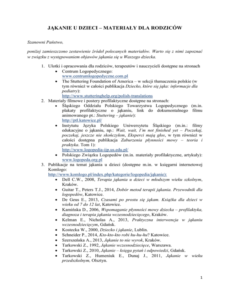 JĄKANIE U DZIECI – MATERIAŁY DLA RODZICÓW Szanowni Państwo, poniżej zamieszczono zestawienie źródeł polecanych materiałów. Warto się z nimi zapoznać w związku z występowaniem objawów jąkania się u Waszego dziecka. 1. Ulotki i opracowania dla rodziców, terapeutów i nauczycieli dostępne na stronach Centrum Logopedycznego: www.centrumlogopedyczne.com.pl The Stuttering Foundation of America – w sekcji tłumaczenia polskie (w tym również w całości publikacja Dziecko, które się jąka: informacje dla pediatry): http://www.stutteringhelp.org/polish-translations 2. Materiały filmowe i postery profilaktyczne dostępne na stronach: Śląskiego Oddziału Polskiego Towarzystwa Logopedycznego (m.in. plakaty profilaktyczne o jąkaniu, link do dokumentalnego filmu animowanego pt.: Stuttering – jąkanie): http://ptl.katowice.pl/ Instytutu Języka Polskiego Uniwersytetu Śląskiego (m.in.: filmy edukacyjne o jąkaniu, np.: Wait, wait, I’m not finished yet – Poczekaj, poczekaj, jeszcze nie skończyłem, Eksperci mają głos, w tym również w całości dostępna publikacja Zaburzenia płynności mowy – teoria i praktyka. Tom 1): http://www.logopedia-ijp.us.edu.pl/ Polskiego Związku Logopedów (m.in. materiały profilaktyczne, artykuły): www.logopeda.org.pl 3. Publikacje na temat jąkania u dzieci (dostępne m.in. w księgarni internetowej Komlogo: http://www.komlogo.pl/index.php/kategorie/logopedia/jąkanie): Dell C.W., 2008, Terapia jąkania u dzieci w młodszym wieku szkolnym, Kraków. Guitar T., Peters T.J., 2014, Dobór metod terapii jąkania. Przewodnik dla logopedów, Katowice. De Geus E., 2013, Czasami po prostu się jąkam. Książka dla dzieci w wieku od 7 do 12 lat, Katowice. Kamińska D., 2006, Wspomaganie płynności mowy dziecka – profilaktyka, diagnoza i terapia jąkania wczesnodziecięcego, Kraków. Kelman E., Nicholas A., 2013, Praktyczna interwencja w jąkaniu wczesnodziecięcym, Gdańsk. Kostecka W., 2000, Dziecko i jąkanie, Lublin. Schneider P., 2014, Kto-kto-kto robi hu-hu-hu? Katowice. Szerszeńska A., 2013, Jąkanie to nie wyrok, Kraków. Tarkowski Z., 1992, Jąkanie wczesnodziecięce, Warszawa. Tarkowski Z., 2010, Jąkanie – księga pytań i odpowiedzi, Gdańsk. Tarkowski Z., Humeniuk E., Dunaj J., 2011, Jąkanie w wieku przedszkolnym, Olsztyn. 1 Węsierska K., Jeziorczak B., 2011, Czy moje dziecko się jąka? Przewodnik dla rodziców małych dzieci, które mają problem z płynnym mówieniem, Katowice. 4. Rzetelne informacje w języku angielskim (w tym książki, ulotki i filmy) można znaleźć na stronach: International Stuttering Association: www.isastutter.org/ Stuttering Home Page: http://www.mnsu.edu/comdis/kuster/stutter.html International Fluency Association: www.theifa.org National Stuttering Association: www.westutter.org British Stammering Association: www.stammering.org Stuttering Foundation of America: www.stutteringhelp.org 2 Ratunku – małe dziecko się jąka!1 Niepłynność w mowie małego dziecka to problem, który dotyka całą rodzinę. W jego skutecznym przezwyciężaniu powinni zatem wraz z dzieckiem brać udział jego najbliżsi. To przede wszystkim wsparcie udzielone rodzicom przez logopedę i dziecku przez świadomych rodziców przesądza o tym, że maluch znowu będzie mówić płynnie! Jeśli rodzice/opiekunowie obawiają się, że dziecko się jąka, to znaczy, że prawdopodobnie zaobserwowali u niego, szczególnie w sytuacjach ekscytujących lub stresujących, następujące zachowania: nie potrafi wypowiedzieć niektórych dźwięków, np. [b], [k], powtarza wyrazy, sylaby lub dźwięki, np. bo-bo-boję się, przedłuża dźwięki, np. maam misia, używa dodatkowych słów, które ułatwiają mu rozpoczęcie wypowiedzi, ma problem z oddechem, gdy chce coś powiedzieć, zaczyna zdawać sobie sprawę ze swoich kłopotów z mówieniem, wzrasta u niego napięcie mięśniowe, zwłaszcza w obrębie twarzy, wykonuje dodatkowe gesty (tzw. współruchy) związane z usilną próbą wypowiedzenia się, rozmawia mniej chętnie niż dawniej. Co powinni zrobić rodzice/opiekunowie w takiej sytuacji? Oswoić lęk, czyli dowiedzieć się jak najwięcej o jąkaniu! I. • Około 5% małych dzieci jąka się przez około 6 miesięcy lub dłużej w okresie wczesnego dzieciństwa. Trzy czwarte spośród nich upora się z niepłynnością samodzielnie, zanim pójdzie do szkoły. • Jąkanie częściej występuje u chłopców niż u dziewcząt. Dziewczęta częściej również „wychodzą z jąkania” bez interwencji terapeutycznej. 1 Tekst jest adaptacją artykułu Ratunku, moje dziecko się jąka! autorstwa Anny Chrostek, Barbary Jeziorczak i Katarzyny Węsierskiej, który został opublikowany w listopadzie roku 2011 na portalu: www.egodziecka.pl. Artykuł w powyższej wersji jest również dostępny na stronie Centrum Logopedycznego: www.centrumlogopedyczne.com.pl. 3 • Pierwsze objawy jąkania pojawiają się zazwyczaj pomiędzy 2. a 5. rokiem życia (średnio około 34. miesiąca życia). • Powody jąkania nie są jeszcze do końca znane. Nie ma jednej prostej przyczyny i nie ma jednej prostej metody terapii jąkania. • Jąkanie u małych dzieci jest różnorodne i zmienne, może przychodzić i odchodzić. • Terapia logopedyczna w przypadku jąkania u małych dzieci jest skuteczna. • Wczesna interwencja logopedyczna z aktywnym udziałem rodziców jest kluczem do sukcesu, jakim jest płynność w mowie dziecka. Dać sobie pomóc, poszukać specjalistycznego wsparcia! II. Pierwsze najważniejsze kroki rodzica to: 1. Spokój: Nie panikuję! 2. Wzmocnienie i uświadomienie: Wiem, co robić! 3. Zmotywowanie: Działam, współpracuję z logopedą! Rodzice/opiekunowie powinni wiedzieć o tym, że logopedzi udzielają bezpłatnej pomocy w placówkach oświatowych (przedszkolach, poradniach psychologiczno-pedagogicznych) i w placówkach służby zdrowia. Pracują również w prywatnych gabinetach. Terapia niepłynności 