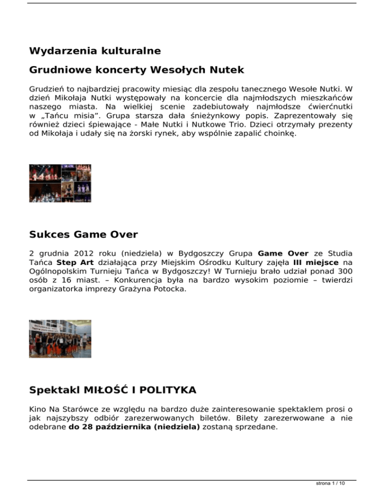 Wydarzenia kulturalne Grudniowe koncerty Wesołych Nutek Grudzień to najbardziej pracowity miesiąc dla zespołu tanecznego Wesołe Nutki. W dzień Mikołaja Nutki występowały na koncercie dla najmłodszych mieszkańców naszego miasta. Na wielkiej scenie zadebiutowały najmłodsze ćwierćnutki w „Tańcu misia”. Grupa starsza dała śnieżynkowy popis. Zaprezentowały się również dzieci śpiewające - Małe Nutki i Nutkowe Trio. Dzieci otrzymały prezenty od Mikołaja i udały się na żorski rynek, aby wspólnie zapalić choinkę. Sukces Game Over 2 grudnia 2012 roku (niedziela) w Bydgoszczy Grupa Game Over ze Studia Tańca Step Art działająca przy Miejskim Ośrodku Kultury zajęła III miejsce na Ogólnopolskim Turnieju Tańca w Bydgoszczy! W Turnieju brało udział ponad 300 osób z 16 miast. – Konkurencja była na bardzo wysokim poziomie – twierdzi organizatorka imprezy Grażyna Potocka. Spektakl MIŁOŚĆ I POLITYKA Kino Na Starówce ze względu na bardzo duże zainteresowanie spektaklem prosi o jak najszybszy odbiór zarezerwowanych biletów. Bilety zarezerwowane a nie odebrane do 28 października (niedziela) zostaną sprzedane. strona 1 / 10 Niech nam żyją Misie! 14 października to dzień urodzin Książkowego Misia. Tradycyjnie, z tej okazji w Oddziale dla Dzieci Biblioteki Centralnej oraz w Filiach bibliotecznych odbyły się huczne przyjęcia urodzinowe. W Oddziale w przyjęciach na cześć solenizanta uczestniczyło 72 przedszkolaków. Nabór do spektaklu w Rebusie Teatr „Dzieci-Dzieciom” ogłasza nabór do spektaklu „Dzieciom”, który odbędzie się w czwartki: 20, 27 września o godz. 16:00 w klubie „Rebus”. Należy przygotować 1 wiersz z polskiej literatury dziecięcej. Pogaduchy w języku angielskim Filia nr 7 Miejskiej Biblioteki Publicznej w Żorach oraz Tower School of English serdecznie zapraszają na pierwsze powakacyjne spotkanie z cyklu „Chatting with tea”. Spotkanie odbędzie się 7 września br. o godz. 18.00 w Filii nr 7, ul. Klimka 7. strona 2 / 10 Informator wakacyjny Lipcowy dodatek do Kuriera Żorskiego nt. Akcji Lato w mieście: Kluby i świetlice MOK zapraszają, Wakacje na sportowo z MOSiRem, Festiwal Teatrów i Widowisk Ulicznych TeatrOn, Zieloną linią na basen, Tańsze bilety dla dojeżdżających na basen na rowerze, Duża Rodzina - zniżka na basen MOSiR, Zostań młodszym ratownikiem, Kino dla dzieci, Wakacje w bibliotece, Galeria pod Chmurką, Lato z tańcem, Żorski Plener Fotograficzny. Wakacje w mieście nie muszą być nudne! Myślisz o przyjemnych i interesujących wakacjach? Sądzisz, że aby dobrze się bawić trzeba pojechać w góry, nad morze lub za granicę? Nic bardziej mylnego wcale nie musisz wyjeżdżać z Żor! Miasto Żory przygotowało, pod tradycyjną nazwą „Akcja Lato 2012”, wiele atrakcji, które przyciągną każdego, niezależnie od wieku i zainteresowań. Dzień Dziecka w klubie Rebus strona 3 / 10 W dniu 1 czerwca 2012 r. w klubie Rebus w dzielnicy Księcia Władysława odbyła się impreza z okazji Dnia Dziecka 2012. Zapraszamy do galerii. Relacja z Benefisu Lothara Dziwoki w TVP 740-lecie Miasta Żory, 50-lecie działalności artystycznej Lothara Dziwoki oraz 10-lecie Żorskiej Orkiestry Rozrywkowej – z tych okazji 24 lutego 2012 r. w Scenie Na Starówce wystąpili znakomici artyści. Relację z Benefisu będzie można zobaczyć w wielkanocny poniedziałek, 9 kwietnia, o godz. 17.30 w TVP 3. Serdecznie zapraszamy! Koncert Krzysztofa Krawczyka Miejski Ośrodek Kultury - Scena Na Starówce zaprasza na koncert Krzysztofa Krawczyka „Złote przeboje. Bo jesteś TY!", który odbędzie się 15 kwietnia o godz. 17:00. Bilety do nabycia w kasie Sceny Na Starówce w cenie: 50 zł normalny, 40 zł - ulgowy. strona 4 / 10 Niezwykła noc w Bibliotece „W cieniu egipskich piramid” pod takim hasłem odbędzie się Noc z Andersenem organizowana przez Miejską Bibliotekę Publiczną w Żorach. Już 30 marca br. o godz. 18.30 w Bibliotece Centralnej na zaproszonych gości czeka moc atrakcji związanych z baśniami Andersena oraz egipskimi motywami. Zapraszamy do świętowania 740. Urodzin Miasta Żory to jedno z najstarszych miast Górnego Śląska. W tym roku miasto obchodzi 740-lecie nadania praw miejskich. Z tej okazji przez cały rok w mieście organizowanych jest wiele ciekawych wydarzeń. Zapraszamy do uczestnictwa! 740-lecie miasta Żory w Bibliotece Zapraszamy do zobaczenia jak w Miejskiej Bibliotece Publicznej obchodzone jest 740-lecie naszego miasta. Elementem obchodów miejskiego jubileuszu jest m.in. wystawa „Żorscy Artyści”, wystawka okolicznościowa pt. „Żorscy patroni ulic” oraz konkurs z nagrodami pt: „Mówię Ojczyna, myślę Żory”. strona 5 / 10 Taniec nowoczesny w Rebusie Miejski Ośrodek Kultury – Klub REBUS zaprasza dziewczęta w wieku od 9 do 15 lat na zajęcia tańca nowoczesnego w czwartki o godzinie 17:00. Miejsce: os. Księcia Władysława PU-1, tel. 32 434 60 31. Zajęcia prowadzi pani Monika Gluza. PROJEKT EDUKACYJNY - MIGRUJĄCY ŚWIAT Od 01 lutego do 30 czerwca Muzeum Miejskie zaprasza na projekt edukacyjny MIGRUJĄCY ŚWIAT. W ramach projektu Muzeum oferuje m.in. dwie wystawy – multimedialną oraz fotograficzną. Przygotowano wiele ciekawych zajęć dla dzieci i młodzieży – od przedszkolaków, przez uczniów szkół podstawowych, gimnazja, po szkoły ponadgimnazjalne – m.in. lekcję interaktywną, warsztaty teatralne i plastyczne, lekcje historyczne o migracjach i wędrówkach ludów. BIBLIOTEKA – INTERAKTYWNY PLAC ZABAW! W ofercie żorskiej Biblioteki pojawiła się nie lada gratka dla interaktywnych. miłośników gier strona 6 / 10 Klub Miłośników Dobrej Książki Serdecznie zapraszamy miłośników dobrej literatury na spotkania. Wyniki XV Wojewódzkiego Festiwalu Pieśni "Bóg się rodzi" strona 7 / 10 Przesłuchania konkursowe trwały trzy dni 11 – 13.01.2011 r. Grudniowe Marzenia - taneczne show Wesołych Nutek i ich goś