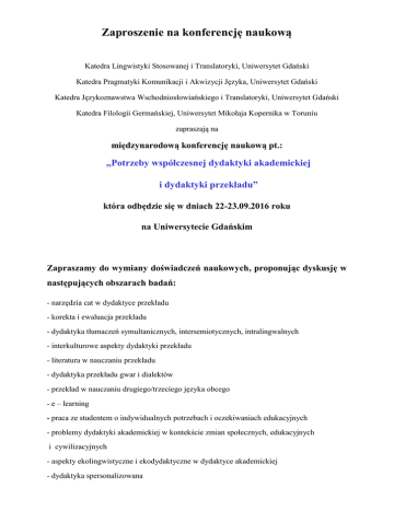 Zaproszenie na konferencję naukową Katedra Lingwistyki Stosowanej i Translatoryki, Uniwersytet Gdański Katedra Pragmatyki Komunikacji i Akwizycji Języka, Uniwersytet Gdański Katedra Językoznawstwa Wschodniosłowiańskiego i Translatoryki, Uniwersytet Gdański Katedra Filologii Germańskiej, Uniwersytet Mikołaja Kopernika w Toruniu zapraszają na międzynarodową konferencję naukową pt.: „Potrzeby współczesnej dydaktyki akademickiej i dydaktyki przekładu” która odbędzie się w dniach 22-23.09.2016 roku na Uniwersytecie Gdańskim Zapraszamy do wymiany doświadczeń naukowych, proponując dyskusję w następujących obszarach badań: - narzędzia cat w dydaktyce przekładu - korekta i ewaluacja przekładu - dydaktyka tłumaczeń symultanicznych, intersemiotycznych, intralingwalnych - interkulturowe aspekty dydaktyki przekładu - literatura w nauczaniu przekładu - dydaktyka przekładu gwar i dialektów - przekład w nauczaniu drugiego/trzeciego języka obcego - e – learning - praca ze studentem o indywidualnych potrzebach i oczekiwaniach edukacyjnych - problemy dydaktyki akademickiej w kontekście zmian społecznych, edukacyjnych i cywilizacyjnych - aspekty ekolingwistyczne i ekodydaktyczne w dydaktyce akademickiej - dydaktyka spersonalizowana Komitet Naukowy Konferencji Komitet Organizacyjny Konferencji prof. UG, dr hab. Józef Grabarek dr Magdalena Grabowska dr hab. Hadrian Lankiewicz, UG dr Jolanta Hinc prof. dr hab. G. Łopuszańska dr Adam Jarosz prof. UG, dr hab. Alicja Pstyga dr Magdalena Jaszczewska prof. UG, dr hab. Monika Rzeczycka dr Ewa Konefał prof. UG, Żanna Sładkiewicz dr Joanna Mampe prof. UMK dr hab. Lech Zieliński dr Renata Rozalowska-Źądło ___________________________________________________________________________ Językami konferencji są język polski, niemiecki, angielski oraz rosyjski. Zgłoszenia udziału w konferencji wraz z abstraktem w języku wystąpienia (200 – 300) prosimy przesyłać na adres mailowy [email protected] Termin nadsyłania zgłoszeń upływa 15 maja 2016 roku. Decyzję o przyjęciu referatu otrzymacie Państwo do 31 maja 2016 roku. Opłata konferencyjna wynosi 400 zł. Prosimy o wpłaty na podany poniżej numer konta do 10 czerwca 2016 roku. W tytule przelewu prosimy obok nazwiska dopisać: KF71-16 59 1240 1271 1111 0010 4368 2415 Podsumowaniem konferencji będzie publikacja monograficzna. Serdecznie zapraszamy do Gdańska! Hotele W bezpośrednim sąsiedztwie Uniwersytetu Gdańskiego Hotel ** Olivia Aleja Grunwaldzka 470 80-309 Gdańsk (+48) 58 343 31 00 http://www.domsportowca.org.pl Dom Gości Zakon Najświętszego Zbawiciela Św. Brygidy 80-308 Gdańsk, ul. Polanki 124 tel.: +48 58 552 12 98 tel./fax: +48 58 552 13 10 http://www.brigidine.org/ Nad morzem Związek Rzemiosła Polskiego Dom Wypoczynkowy „RZEMIEŚLNIK” ul. Piastowska 206 80-341 Gdańsk Jelitkowo tel. (+48) 58 553 00 57 tel. kom. +48 669 505 118 www.rzemieslnik.eu Novotel Gdańsk Marina ul. Jelitkowska 20 80-342 Gdańsk Tel. (+48) 58 558 91 00 www.novotel.com W centrum Gdańska Stay Inn Hotel http://www.stayinngdansk.com W Gdańsku Wrzeszczu (hotele przy dworcu SKM) Smart Hotel http://www.hotelsmart.pl/pl/ Villa Vrest http://villa-vrest.pl/site/kontakt Hotel Szydłowski http://www.szydlowski.pl/ Hotel Logos http://hotellogos-gdansk.pl/