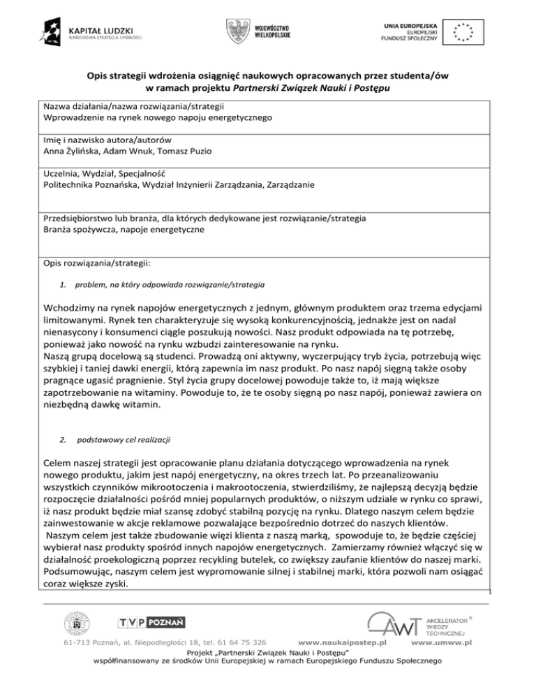 Opis strategii wdrożenia osiągnięć naukowych opracowanych przez studenta/ów w ramach projektu Partnerski Związek Nauki i Postępu Nazwa działania/nazwa rozwiązania/strategii Wprowadzenie na rynek nowego napoju energetycznego Imię i nazwisko autora/autorów Anna Żylioska, Adam Wnuk, Tomasz Puzio Uczelnia, Wydział, Specjalnośd Politechnika Poznaoska, Wydział Inżynierii Zarządzania, Zarządzanie Przedsiębiorstwo lub branża, dla których dedykowane jest rozwiązanie/strategia Branża spożywcza, napoje energetyczne Opis rozwiązania/strategii: 1. problem, na który odpowiada rozwiązanie/strategia Wchodzimy na rynek napojów energetycznych z jednym, głównym produktem oraz trzema edycjami limitowanymi. Rynek ten charakteryzuje się wysoką konkurencyjnością, jednakże jest on nadal nienasycony i konsumenci ciągle poszukują nowości. Nasz produkt odpowiada na tę potrzebę, ponieważ jako nowośd na rynku wzbudzi zainteresowanie na rynku. Naszą grupą docelową są studenci. Prowadzą oni aktywny, wyczerpujący tryb życia, potrzebują więc szybkiej i taniej dawki energii, którą zapewnia im nasz produkt. Po nasz napój sięgną także osoby pragnące ugasid pragnienie. Styl życia grupy docelowej powoduje także to, iż mają większe zapotrzebowanie na witaminy. Powoduje to, że te osoby sięgną po nasz napój, ponieważ zawiera on niezbędną dawkę witamin. 2. podstawowy cel realizacji Celem naszej strategii jest opracowanie planu działania dotyczącego wprowadzenia na rynek nowego produktu, jakim jest napój energetyczny, na okres trzech lat. Po przeanalizowaniu wszystkich czynników mikrootoczenia i makrootoczenia, stwierdziliśmy, że najlepszą decyzją będzie rozpoczęcie działalności pośród mniej popularnych produktów, o niższym udziale w rynku co sprawi, iż nasz produkt będzie miał szansę zdobyd stabilną pozycję na rynku. Dlatego naszym celem będzie zainwestowanie w akcje reklamowe pozwalające bezpośrednio dotrzed do naszych klientów. Naszym celem jest także zbudowanie więzi klienta z naszą marką, spowoduje to, że będzie częściej wybierał nasz produkty spośród innych napojów energetycznych. Zamierzamy również włączyd się w działalnośd proekologiczną poprzez recykling butelek, co zwiększy zaufanie klientów do naszej marki. Podsumowując, naszym celem jest wypromowanie silnej i stabilnej marki, która pozwoli nam osiągad coraz większe zyski. 61-713 Poznań, al. Niepodległości 18, tel. 61 64 75 326 www.naukaipostep.pl www.umww.pl Projekt „Partnerski Związek Nauki i Postępu” współfinansowany ze środków Unii Europejskiej w ramach Europejskiego Funduszu Społecznego 1 Elementy innowacyjne rozwiązania/strategii (jeśli istnieją) Nasz produkt nie jest innowacyjny, natomiast w stosunku do innych marek może byd konkurencyjny. Jego konkurencyjnośd będzie się przejawiad głównie pod względem ceny. Wyróżniad się będzie też smakowymi edycjami limitowanymi oraz reklamą skierowaną przede wszystkim dla studentów. Spodziewane korzyści dla przedsiębiorstwa wdrażającego rozwiązanie/strategię Główną korzyścią z działalności przedsiębiorstwa będzie osiąganie zysków finansowych. Uderzenie w niszę rynkową stworzy możliwośd wypromowania nowej marki i zdobycie pozycji na rynku napojów energetycznych w Polsce. Stopniowe zdobywanie popularności w grupie docelowej pozwoli w przyszłości rozszerzyd ofertę o nowe produkty i zdobycie zainteresowania innych grup konsumenckich. Po osiągnięciu stabilizacji finansowej zakładamy możliwośd uderzenia w liderów rynku napojów energetycznych poprzez wprowadzanie nowych produktów dla szerszego grona klientów i zwiększenie nakładów przeznaczonych na promocję. Po umocnieniu pozycji na rynku możliwe będzie zwiększanie cen jednostkowych produktów w celu maksymalizacji zysków. Planowane działania proekologiczne odbiją się pozytywnie na wizerunku przedsiębiorstwa i sprawią, iż odbiorcy będą przychylniej spoglądad na produkt. Uczestnictwo i organizowanie imprez studenckich poza zwiększeniem rozpoznawalności marki wpłynie też na postrzeganie przedsiębiorstwa i jego pozytywny odbiór w środowisku konsumenckim. wyrażamy zgodę na przetwarzanie danych osobowych zgodnie z ustawą z dnia 29 sierpnia 1997 r. o ochronie danych osobowych z późn. zmianami przez Samorząd Województwa Wielkopolskiego i Politechnikę Poznańską w celu umieszczenia opisów osiągnięć naukowych na stronie www.naukaipostep.pl. 2 61-713 Poznań, al. Niepodległości 18, tel. 61 64 75 326 www.naukaipostep.pl www.umww.pl Projekt „Partnerski Związek Nauki i Postępu” współfinansowany ze środków Unii Europejskiej w ramach Europejskiego Funduszu Społecznego