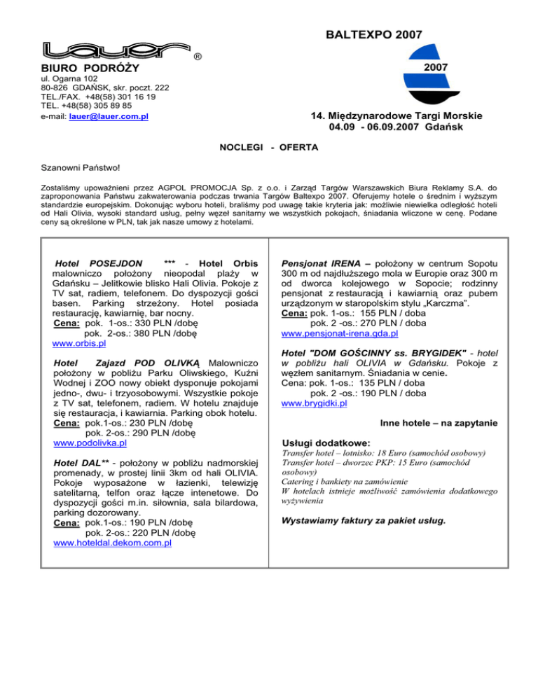 BALTEXPO 2007 ® BIURO PODRÓĩY ul. Ogarna 102 80-826 GDAēSK, skr. poczt. 222 TEL./FAX. +48(58) 301 16 19 TEL. +48(58) 305 89 85 e-mail: [email protected] 14. MiĊdzynarodowe Targi Morskie 04.09 - 06.09.2007 GdaĔsk NOCLEGI - OFERTA Szanowni PaĔstwo! ZostaliĞmy upowaĪnieni przez AGPOL PROMOCJA Sp. z o.o. i Zarząd Targów Warszawskich Biura Reklamy S.A. do zaproponowania PaĔstwu zakwaterowania podczas trwania Targów Baltexpo 2007. Oferujemy hotele o Ğrednim i wyĪszym standardzie europejskim. Dokonując wyboru hoteli, braliĞmy pod uwagĊ takie kryteria jak: moĪliwie niewielka odlegáoĞü hoteli od Hali Olivia, wysoki standard usáug, peány wĊzeá sanitarny we wszystkich pokojach, Ğniadania wliczone w cenĊ. Podane ceny są okreĞlone w PLN, tak jak nasze umowy z hotelami. Hotel POSEJDON *** - Hotel Orbis malowniczo poáoĪony nieopodal plaĪy w GdaĔsku – Jelitkowie blisko Hali Olivia. Pokoje z TV sat, radiem, telefonem. Do dyspozycji goĞci basen. Parking strzeĪony. Hotel posiada restauracjĊ, kawiarniĊ, bar nocny. Cena: pok. 1-os.: 330 PLN /dobĊ pok. 2-os.: 380 PLN /dobĊ www.orbis.pl Hotel Zajazd POD OLIVKĄ Malowniczo poáoĪony w pobliĪu Parku Oliwskiego, KuĨni Wodnej i ZOO nowy obiekt dysponuje pokojami jedno-, dwu- i trzyosobowymi. Wszystkie pokoje z TV sat, telefonem, radiem. W hotelu znajduje siĊ restauracja, i kawiarnia. Parking obok hotelu. Cena: pok.1-os.: 230 PLN /dobĊ pok. 2-os.: 290 PLN /dobĊ www.podolivka.pl Hotel DAL** - poáoĪony w pobliĪu nadmorskiej promenady, w prostej linii 3km od hali OLIVIA. Pokoje wyposaĪone w áazienki, telewizjĊ satelitarną, telfon oraz áącze intenetowe. Do dyspozycji goĞci m.in. siáownia, sala bilardowa, parking dozorowany. Cena: pok.1-os.: 190 PLN /dobĊ pok. 2-os.: 220 PLN /dobĊ www.hoteldal.dekom.com.pl Pensjonat IRENA – poáoĪony w centrum Sopotu 300 m od najdáuĪszego mola w Europie oraz 300 m od dworca kolejowego w Sopocie; rodzinny pensjonat z restauracją i kawiarnią oraz pubem urządzonym w staropolskim stylu „Karczma”. Cena: pok. 1-os.: 155 PLN / doba pok. 2 -os.: 270 PLN / doba www.pensjonat-irena.gda.pl Hotel "DOM GOĝCINNY ss. BRYGIDEK" - hotel w pobliĪu hali OLIVIA w GdaĔsku. Pokoje z wĊzáem sanitarnym. ĝniadania w cenie. Cena: pok. 1-os.: 135 PLN / doba pok. 2 -os.: 190 PLN / doba www.brygidki.pl Inne hotele – na zapytanie Usáugi dodatkowe: Transfer hotel – lotnisko: 18 Euro (samochód osobowy) Transfer hotel – dworzec PKP: 15 Euro (samochód osobowy) Catering i bankiety na zamówienie W hotelach istnieje moĪliwoĞü zamówienia dodatkowego wyĪywienia Wystawiamy faktury za pakiet usáug. ® Biuro PodróĪy BALTEXPO 2007 14. MiĊdzynarodowe Targi Morskie 04.09 – 06.09.2007 GdaĔsk Tel./fax.: 58/301 16 19 [email protected] KARTA REZERWACJI H OTELU ProszĊ o zarezerwowanie hotelu: Hotel: IloĞü i rodzaj pokoi Nazwisko i imiĊ 1 os. Lp. 2 os. Data przyjazdu Data wyjazdu Cena w PLN IloĞü noclegów Razem 1. 2. 3. 4. 5. Ogóáem w PLN: ...................................... Zleceniodawca ..................................................... .............................................................................. Adres firmy ........................................................... .............................................................................. Termin przesáania zgáoszenia do dnia 03.08.2007 na adres Biura PodróĪy LAUER. OpáatĊ okreĞloną w potwierdzeniu rezerwacji wpáacimy w wyznaczonym terminie na konto: Biuro PodróĪy LAUER ING Bank ĝląski 60 1050 1764 1000 0022 6886 4283 Tel. ............................ Fax. ................................. E-mail ................................................................... Nazwa banku........................................................ Numer konta......................................................... Pisemne potwierdzenie rezerwacji przez Biuro PodróĪy LAUER bĊdzie podstawą przyjĊcia PaĔstwa w hotelu. Akceptujemy karty kredytowe. Wystawiamy faktury VAT. Rezygnacja z zarezerwowanych pokoi moĪe nastąpiü: w przypadku zgáoszenia rezygnacji do dnia 10.08.2007 zwracamy peáną kwotĊ w przypadku zgáoszenia rezygnacji do dnia 17.08.2007 – 80% kwoty, a po 24.08.2007 – 50%. W przypadku nie odwoáania rezerwacji dwie doby wczeĞniej, bądĨ nie zgáoszenia siĊ w hotelu w zarezerwowanym terminie, zobowiązujemy siĊ pokryü wynikáe z tego tytuáu koszty. Nie wpáacenie w terminie okreĞlonej w potwierdzeniu kwoty, powoduje anulacjĊ zlecenia. ................................. dnia........................... ........................................... Gáówny KsiĊgowy ................................................... Podpis i pieczątka zgáaszającego
