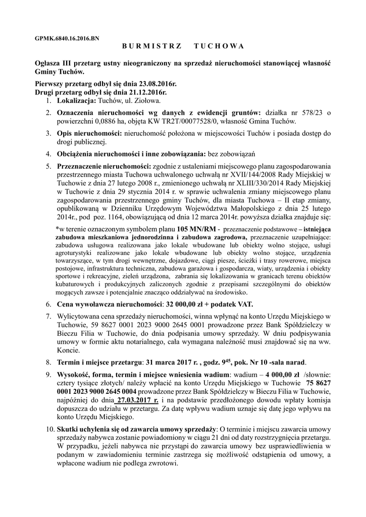 GPMK.6840.16.2016.BN BURMISTRZ T U C H O WA Ogłasza III przetarg ustny nieograniczony na sprzedaż nieruchomości stanowiącej własność Gminy Tuchów. Pierwszy przetarg odbył się dnia 23.08.2016r. Drugi przetarg odbył się dnia 21.12.2016r. 1. Lokalizacja: Tuchów, ul. Ziołowa. 2. Oznaczenia nieruchomości wg danych z ewidencji gruntów: działka nr 578/23 o powierzchni 0,0886 ha, objęta KW TR2T/00077528/0, własność Gmina Tuchów. 3. Opis nieruchomości: nieruchomość położona w miejscowości Tuchów i posiada dostęp do drogi publicznej. 4. Obciążenia nieruchomości i inne zobowiązania: bez zobowiązań 5. Przeznaczenie nieruchomości: zgodnie z ustaleniami miejscowego planu zagospodarowania przestrzennego miasta Tuchowa uchwalonego uchwałą nr XVII/144/2008 Rady Miejskiej w Tuchowie z dnia 27 lutego 2008 r., zmienionego uchwałą nr XLIII/330/2014 Rady Miejskiej w Tuchowie z dnia 29 stycznia 2014 r. w sprawie uchwalenia zmiany miejscowego planu zagospodarowania przestrzennego gminy Tuchów, dla miasta Tuchowa – II etap zmiany, opublikowaną w Dzienniku Urzędowym Województwa Małopolskiego z dnia 25 lutego 2014r., pod poz. 1164, obowiązującą od dnia 12 marca 2014r. powyższa działka znajduje się: *w terenie oznaczonym symbolem planu 105 MN/RM - przeznaczenie podstawowe – istniejąca zabudowa mieszkaniowa jednorodzinna i zabudowa zagrodowa, przeznaczenie uzupełniające: zabudowa usługowa realizowana jako lokale wbudowane lub obiekty wolno stojące, usługi agroturystyki realizowane jako lokale wbudowane lub obiekty wolno stojące, urządzenia towarzyszące, w tym drogi wewnętrzne, dojazdowe, ciągi piesze, ścieżki i trasy rowerowe, miejsca postojowe, infrastruktura techniczna, zabudowa garażowa i gospodarcza, wiaty, urządzenia i obiekty sportowe i rekreacyjne, zieleń urządzona, zabrania się lokalizowania w granicach terenu obiektów kubaturowych i produkcyjnych zaliczonych zgodnie z przepisami szczególnymi do obiektów mogących zawsze i potencjalnie znacząco oddziaływać na środowisko. 6. Cena wywoławcza nieruchomości: 32 000,00 zł + podatek VAT. 7. Wylicytowana cena sprzedaży nieruchomości, winna wpłynąć na konto Urzędu Miejskiego w Tuchowie, 59 8627 0001 2023 9000 2645 0001 prowadzone przez Bank Spółdzielczy w Bieczu Filia w Tuchowie, do dnia podpisania umowy sprzedaży. W dniu podpisywania umowy w formie aktu notarialnego, cała wymagana należność musi znajdować się na ww. Koncie. 8. Termin i miejsce przetargu: 31 marca 2017 r. , godz. 945, pok. Nr 10 -sala narad. 9. Wysokość, forma, termin i miejsce wniesienia wadium: wadium – 4 000,00 zł /słownie: cztery tysiące złotych/ należy wpłacić na konto Urzędu Miejskiego w Tuchowie 75 8627 0001 2023 9000 2645 0004 prowadzone przez Bank Spółdzielczy w Bieczu Filia w Tuchowie, najpóźniej do dnia 27.03.2017 r. i na podstawie przedłożonego dowodu wpłaty komisja dopuszcza do udziału w przetargu. Za datę wpływu wadium uznaje się datę jego wpływu na konto Urzędu Miejskiego. 10. Skutki uchylenia się od zawarcia umowy sprzedaży: O terminie i miejscu zawarcia umowy sprzedaży nabywca zostanie powiadomiony w ciągu 21 dni od daty rozstrzygnięcia przetargu. W przypadku, jeżeli nabywca nie przystąpi do zawarcia umowy bez usprawiedliwienia w podanym w zawiadomieniu terminie zastrzega się możliwość odstąpienia od umowy, a wpłacone wadium nie podlega zwrotowi. 11. Warunki dodatkowe : uczestnicy przetargu winni posiadać dowód osobisty, dowód wpłaty wadium. 12. Wadium zwraca się niezwłocznie po odwołaniu lub zamknięciu przetargu, nie później niż przed upływem trzech dni od dnia, odpowiednio: - odwołania przetargu; -zamknięcia przetargu; -unieważnienia przetargu; -zakończenia przetargu wynikiem negatywnym. W przypadku gdy nabywany grunt miałby stanowić wspólność małżeńską, do przetargu winny stawić się obydwoje małżonkowie. 13. O wysokości postąpienia decydują uczestnicy przetargu, z tym, że postąpienie nie może wynosić mniej niż 1% ceny wywoławczej w zaokrągleniu w górę do pełnych dziesiątek złotych. 14. Uczestnik przetargu, w terminie 7 dni od ogłoszenia wyniku przetargu (w tym przypadku od dnia przetargu), może zaskarżyć czynności przetargowe do Burmistrza Tuchowa. 15. Koszty notarialne, opłat sądowych ponosi nabywca. 16. Zastrzega się prawo odwołania lub unieważnienia przetargu z ważnej dla Gminy Tuchów przyczyny. 17. Kontakt: 14 6525 474 wew. 19. Treść ogłoszenia podaje się do wiadomości na stronie internetowej www.tuchow.pl, BIP UM Tuchów (zamówienia publiczne i ogłoszenia), na tablicy ogłoszeń UM oraz tablicach samorządów mieszkańców w Tuchowie. Tuchów, dnia 6.02.2017 r.