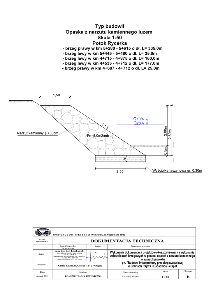 Typ budowli Opaska z narzutu kamiennego luzem Skala 1:50 Potok Rycerka - brzeg prawy w km 5+280 - 5+615 o dł. L= 335,0m - brzeg lewy w km 5+445 - 5+480 o dł. L= 35,0m - brzeg lewy w km 4+715 - 4+875 o dł. L= 160,0m - brzeg lewy w km 4+535 - 4+712 o dł. L= 177,0m - brzeg prawy w km 4+687 - 4+712 o dł. L= 25,0m 1,50 Narzut kamienny φ >80cm ,5 2,00m 2.50m 1 :1 Q10% Q20% 30 0.5m Fn=5,0m2/mb Wyściółka faszynowa gr. 0,30m 2,50 EKOBOWIR Firma "E K O B O W I R" Sp. z o.o. 30-404 Kraków, ul. Cegielniana 18/42 Nazwa opracowania DOKUMENTACJA TECHNICZNA Imię i Nazwisko Nr uprawnień Podpis mgr inż. Jan Liszkowski Autor Inwestor Specjalność melioracje wodne, Nr 701/71/ KR Specjalność instalacyjno- inżynieryjna, Nr RP- Upr/337/91 Rzeczoznawca NOT Nr 2134 Gmina Rajcza, ul. Górska 1, 34-370 Rajcza Nazwa opracowania Wykonania dokumentacji projektowo-kosztorysowej na wykonanie zabezpieczeń brzegowych w postaci opasek z narzutu kamiennego w ramach projektu pn. "Budowa infrastruktury przeciwpowodziowej w Gminach Rajcza i Ośćadnica - etap II. Data Stadium Nazwa rysunku: styczeń 2015 DOKUMENTACJA TECHNICZNA Szkic-typ budowli Skala Rys.nr: 1 : 50 6