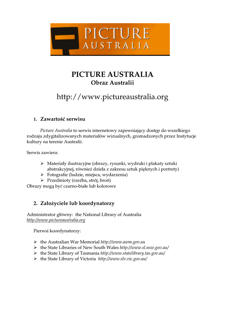 PICTURE AUSTRALIA Obraz Australii http://www.pictureaustralia.org 1. Zawartość serwisu Picture Australia to serwis internetowy zapewniający dostęp do wszelkiego rodzaju zdygitalizowanych materiałów wizualnych, gromadzonych przez Instytucje kultury na terenie Australii. Serwis zawiera: Materiały ilustracyjne (obrazy, rysunki, wydruki i plakaty sztuki abstrakcyjnej, równieŜ dzieła z zakresu sztuk pięknych i portrety) Fotografie (ludzie, miejsca, wydarzenia) Przedmioty (rzeźba, strój, broń) Obrazy mogą być czarno-białe lub kolorowe 2. ZałoŜyciele lub koordynatorzy Administrator główny: the National Library of Australia http://www.pictureaustralia.org Pierwsi koordynatorzy: the Australian War Memorial http://www.awm.gov.au the State Libraries of New South Wales http://www.sl.nsw.gov.au/ the State Library of Tasmania http://www.statelibrary.tas.gov.au/ the State Library of Victoria http://www.slv.vic.gov.au/ 3. Krótka historia projektu PictureAustralia rozpoczął swą działalność w 1998 roku jako pilotaŜowy projekt tzw. ImageSearch (wyszukiwanie obrazów). W pierwszej fazie działalności opierał się na współpracy następujących instytucji: the Australian War Memorial, the National Library of Australia, the State Libraries of New South Wales, Tasmania and Victoria. Biorąc pod uwagę współpracę ośrodków, duŜe zainteresowanie projektem i nieustanny rozwój podjęto decyzję o przekształceniu ImageSearch w nowy, niezaleŜny serwis zrzeszający więcej bibliotek, galerii, muzeów i archiwów. Oficjalna inauguracja działalności PictureAustralia miała miejsce 4 września 2000 roku w Narodowej Bibliotece Australii. Otwarcia dokonał Bruce Scott. Z czasem do PictureAustralia dołączyły: The National Archives of Australia oraz Uniwersytecka Biblioteka w Queensland. Serwis jest zdobywcą Australijskiej Internetowej Nagrody the Australian Financial Review w kategorii sztuka 28 listopada 2000 roku. 4. Kolekcje – elektroniczne Katalogi i Bazy Danych Serwis zawiera kolekcje związane z szeroko pojętą kulturą kontynentu australijskiego. Prowadzi dostęp do materiałów ilustrowanych od 19 wieku do czasów współczesnych obejmujących zarówno lokalną historię jak i narodowe wydarzenia. Całość kolekcji organizowana jest według podziału na 12 kategorii tematycznych: Architektura Sztuka i literatura Środowisko Historia Lokalna sztuka i taniec Zbrojenia i wojna Społeczeństwo Miejsca Polityka i rząd Sport Handel i przemysł PodróŜe W obrębie wymienionych bloków tematycznych występuje podział na mniejsze jednostki. 5. Interfejs interfejs jednojęzyczny: angielski złoŜone operacje wyszukiwania (tytuł, autor, przedmiot, data lub miejsce, opis, wydawca, numer, format, kolekcja, prawa) wyszukiwanie według indywidualnej instytucji (46 jednostek w bazie) wyszukiwanie wg warunków AND, OR, NOT pomiędzy atrybutami wyszukiwanie wg warunków AND, OR w obrębie jednego atrybutu listy wartości atrybutów - przeglądanie występujących w bazie wartości atrybutów i dodawanie ich do formularza zapytania. przeglądanie listy wyników w postaci skróconej lub przeglądanie pełnych rekordów moŜliwość wyboru ilości rekordów wyświetlonych na stronie: 10, 30, 50 lub 100 Źródło: http://www.pictureaustralia.org/apps/pictureaustralia przeglądanie bazy - funkcja „browse” (wg. tytułu, autora, przedmiotu, daty wydania lub miejsca ) Źródło: http://www.pictureaustralia.org/apps/pictureaustralia;jsessionid=DEB33531F9C3902C0FA0DC920F 302BAC?action=PABrows 6. Metadane Stosowany system metadanych - Dublin Core (DC) W opisie (równieŜ wielokrotnie), mogą być obecne następujące elementy: 1. Title (tytuł) 2. Creator (twórca) 3. Subject and Keywords (temat i słowa kluczowe) 4. Description (opis) 5. Publisher (wydawca) 6. Contributor (współtwórca) 7. Date (data) 8. Resource Type (typ zasobu) 9. Format (format) 10. Resource Identifier (identyfikator zasobu) 11. Source (źródło) 12. Language (język) 13. Relation (odniesienie) 14. Coverage (zakres) 15. Rights Management (zarządzanie prawami) 7. Format zasobów cyfrowych - Formaty prezencyjne w jakich biblioteka udostępnia zasoby: Formą zapisu jest format JPG. Źródło: http://nla.gov.au/nla.pic-an2323658 8. Osobliwości i atrakcje Treasures Trail – kolekcja unikatów zawierająca materiały z the National Treasures from Australia's Great Libraries (Skarby Narodowe z kolekcji największych Bibliotek ) 2006-2007. 9. Wykorzystane źródła PICTURE AUSTRALIA http://www.pictureaustralia.org [2007-06-06] the National Library of Australia http://www.pictureaustralia.org [2007-0608] Iwona Huber Kraków: 2007-06-08 Zgadzam się na publikację mego tekstu w sieci Internet