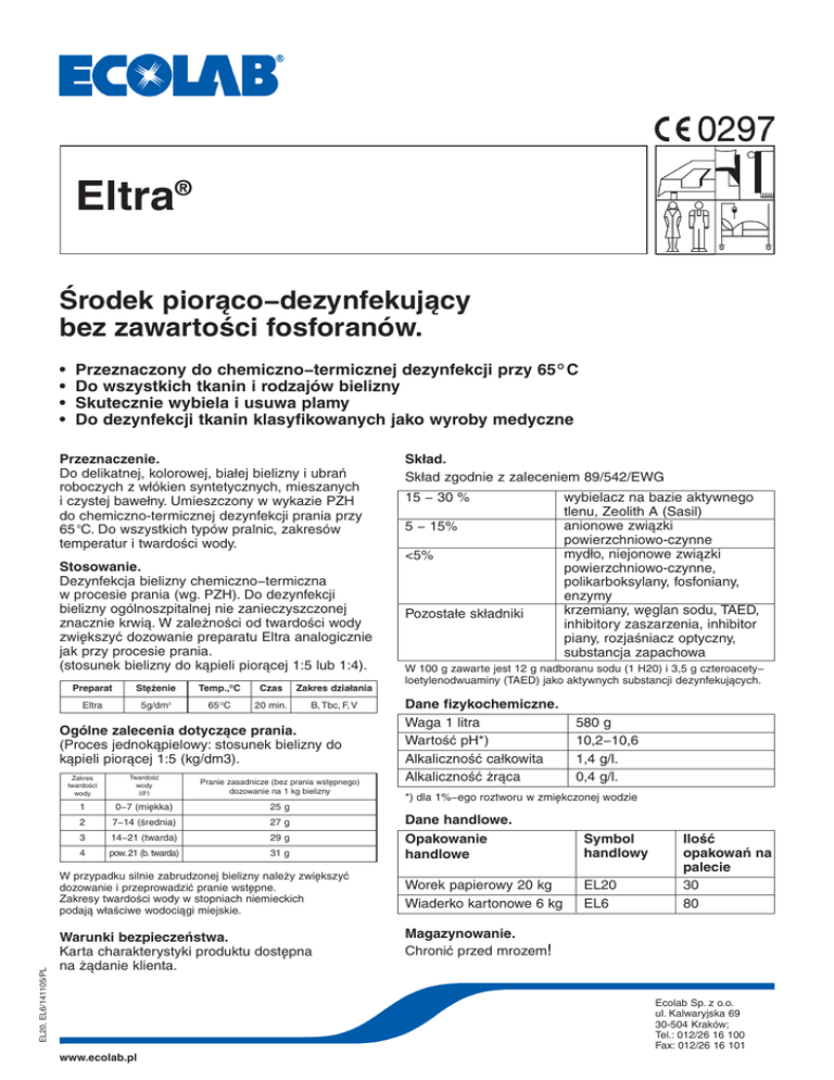 Eltra® Środek piorąco−dezynfekujący bez zawartości fosforanów. • • • • Przeznaczony do chemiczno−termicznej dezynfekcji przy 65 O C Do wszystkich tkanin i rodzajów bielizny Skutecznie wybiela i usuwa plamy Do dezynfekcji tkanin klasyfikowanych jako wyroby medyczne Przeznaczenie. Do delikatnej, kolorowej, białej bielizny i ubrań roboczych z włókien syntetycznych, mieszanych i czystej bawełny. Umieszczony w wykazie PZH do chemiczno-termicznej dezynfekcji prania przy 65 oC. Do wszystkich typów pralnic, zakresów temperatur i twardości wody. Stosowanie. Dezynfekcja bielizny chemiczno−termiczna w procesie prania (wg. PZH). Do dezynfekcji bielizny ogólnoszpitalnej nie zanieczyszczonej znacznie krwią. W zależności od twardości wody zwiększyć dozowanie preparatu Eltra analogicznie jak przy procesie prania. (stosunek bielizny do kąpieli piorącej 1:5 lub 1:4). Preparat Stężenie Temp.,OC Czas Zakres działania Eltra 5g/dm3 65 OC 20 min. B, Tbc, F, V Ogólne zalecenia dotyczące prania. (Proces jednokąpielowy: stosunek bielizny do kąpieli piorącej 1:5 (kg/dm3). Zakres twardości wody Twardość wody (do) Pranie zasadnicze (bez prania wstępnego) dozowanie na 1 kg bielizny 1 0−7 (miękka) 25 g 2 7−14 (średnia) 27 g 3 14−21 (twarda) 29 g 4 pow. 21 (b. twarda) 31 g EL20, EL6/141105/PL W przypadku silnie zabrudzonej bielizny należy zwiększyć dozowanie i przeprowadzić pranie wstępne. Zakresy twardości wody w stopniach niemieckich podają właściwe wodociągi miejskie. Warunki bezpieczeństwa. Karta charakterystyki produktu dostępna na żądanie klienta. Skład. Skład zgodnie z zaleceniem 89/542/EWG 15 − 30 % 5 − 15% <5% Pozostałe składniki wybielacz na bazie aktywnego tlenu, Zeolith A (Sasil) anionowe związki powierzchniowo-czynne mydło, niejonowe związki powierzchniowo-czynne, polikarboksylany, fosfoniany, enzymy krzemiany, węglan sodu, TAED, inhibitory zaszarzenia, inhibitor piany, rozjaśniacz optyczny, substancja zapachowa W 100 g zawarte jest 12 g nadboranu sodu (1 H20) i 3,5 g czteroacety− loetylenodwuaminy (TAED) jako aktywnych substancji dezynfekujących. Dane fizykochemiczne. Waga 1 litra Wartość pH*) Alkaliczność całkowita Alkaliczność żrąca 580 g 10,2−10,6 1,4 g/l. 0,4 g/l. *) dla 1%−ego roztworu w zmiękczonej wodzie Dane handlowe. Opakowanie handlowe Symbol handlowy Worek papierowy 20 kg Wiaderko kartonowe 6 kg EL20 EL6 Ilość opakowań na palecie 30 80 Magazynowanie. Chronić przed mrozem! Ecolab Sp. z o.o. ul. Kalwaryjska 69 30-504 Kraków; Tel.: 012/26 16 100 Fax: 012/26 16 101 www.ecolab.pl