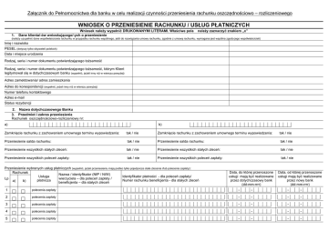 Załącznik do Pełnomocnictwa dla banku w celu realizacji czynności przeniesienia rachunku oszczędnościowo – rozliczeniowego WNIOSEK O PRZENIESIENIE RACHUNKU / USŁUG PŁATNICZYCH 1. Wniosek należy wypełnić DRUKOWANYMI LITERAMI. Właściwe pola Dane klienta/-ów wnioskującego/-ych o przeniesienie należy zaznaczyć znakiem „x” (należy uzupełnić dane współwłaściciela rachunku w przypadku rachunku wspólnego, jeśli do rozwiązania umowy rachunku, zgodnie z umową rachunku, wymagana jest wspólna zgoda jego współwłaścicieli) Imię i nazwisko PESEL (dotyczy tylko obywateli polskich) Data i miejsce urodzenia Rodzaj, seria i numer dokumentu potwierdzającego tożsamość Rodzaj, seria i numer dokumentu potwierdzającego tożsamość, którym Klient legitymował się w dotychczasowym banku (wypełnić, jeżeli inny niż w wierszu powyżej) Adres zameldowania/ adres zamieszkania Adres do korespondencji (wypełnić, jeżeli inny niż w wierszu powyżej) Numer telefonu kontaktowego Adres e-mail Status rezydencji 2. Nazwa dotychczasowego Banku 3. Przedmiot i zakres przeniesienia Rachunek oszczędnościowo-rozliczeniowy nr: a) b) Zamknięcie rachunku z zachowaniem umownego terminu wypowiedzenia: tak / nie Zamknięcie rachunku z zachowaniem umownego terminu wypowiedzenia: tak / nie Przeniesienie salda rachunku: tak / nie Przeniesienie salda rachunku: tak / nie Przeniesienie wszystkich stałych zleceń: tak / nie Przeniesienie wszystkich stałych zleceń: tak / nie Przeniesienie wszystkich poleceń zapłaty: tak / nie Przeniesienie wszystkich poleceń zapłaty: tak / nie Przeniesienie wybranych usług płatniczych (wypełnić, jeżeli przeniesieniu mają podlec tylko pojedyncze stałe zlecenia i/lub polecenia zapłaty): Rachunek Nazwa / identyfikator (NIP / NIW) Usługa Identyfikator płatności - dla poleceń zapłaty/ Lp wierzyciela – dla poleceń zapłaty / płatnicza Numer rachunku beneficjenta - dla stałych zleceń a) b) beneficjenta – dla stałych zleceń 1 ! ! 2 ! ! 3 ! ! 4 ! ! 5 ! ! Data, do której przenoszone usługi mają być realizowane przez dotychczasowy bank (dd-mm-rrrr) Data, od której przenoszone usługi mają być realizowane przez nowy bank (dd-mm-rrrr) polecenia zapłaty - - - - polecenia zapłaty - - - - polecenia zapłaty - - - - polecenia zapłaty - - - - polecenia zapłaty - - - - 6 7 stałego zlecenia ! ! ! 8 ! ! 9 ! ! 10 ! ! 11 ! ! 12 ! ! 13 ! ! 14 15 ! - - - - stałego zlecenia - - - - stałego zlecenia - - - - stałego zlecenia - - - - stałego zlecenia - - - - stałego zlecenia - - - - stałego zlecenia - - - - stałego zlecenia - - - - stałego zlecenia - - - - stałego zlecenia - - - - ! ! ! ! 4. Dane nowego banku 1) Nazwa banku 5. Instytucje, które mają zostać powiadomione o zmianie rachunku bankowego przez klienta Nazwa i adres instytucji 6. 2) Numer rachunku w nowym banku 1) ……………………………………………………………………………………………………………………………............................................................................................. 2) ……………………………………………………………………………………………………………………………............................................................................................ 3) ……………………………………………………………………………………………………………………………............................................................................................ Data i podpis/podpisy Klienta/ów * * podpis/ podpisy klienta/-ów zgodny/-e z kartą wzorów podpisów w dotychczasowym banku 7. Data i podpis za Bank Tożsamość sprawdzono, zaakceptowano do realizacji 2 3