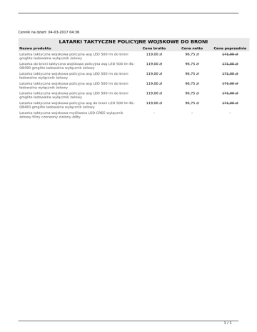 Cennik na dzień: 04-03-2017 04:36 LATARKI TAKTYCZNE POLICYJNE WOJSKOWE DO BRONI Nazwa produktu Cena brutto Cena netto Cena poprzednia Latarka taktyczna wojskowa policyjna asg LED 500 lm do broni gmglite ładowalna wyłącznik żelowy 119,00 zł 96,75 zł 171,00 zł Latarka do broni taktyczna wojskowa policyjna asg LED 500 lm BLQ8490 gmglite ładowalna wyłącznik żelowy 119,00 zł 96,75 zł 171,00 zł Latarka taktyczna wojskowa policyjna asg LED 500 lm do broni ładowalna wyłącznik żelowy 119,00 zł 96,75 zł 171,00 zł Latarka taktyczna wojskowa policyjna asg LED 500 lm do broni ładowalna wyłącznik żelowy 119,00 zł 96,75 zł 171,00 zł Latarka taktyczna wojskowa policyjna asg LED 500 lm do broni gmglite ładowalna wyłącznik żelowy 119,00 zł 96,75 zł 171,00 zł Latarka taktyczna wojskowa policyjna asg do broni LED 500 lm BLQ8483 gmglite ładowalna wyłącznik żelowy 119,00 zł 96,75 zł 171,00 zł - - - Latarka taktyczna wojskowa myśliwska LED CREE wyłącznik żelowy filtry czerwony zielony żółty 1/1 Powered by TCPDF (www.tcpdf.org)