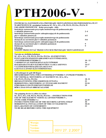 1 PTH2006-VINSTRUKCJA ZASTOSOWANIA PRZYRZĄDU MONTAŻOWEGO DO PODNOSZENIA PŁYT WARSTWOWYCH metalplast Isotherm SC, SCw, SCs, CH, PLUS, PLUSw, PLUSs W UKŁADZIE PIONOWYM. Kolor przyrządu - żółty Instrukcja zastosowania przyrządu montażowego do podnoszenia płyt w układzie pionowym 2–4 Instrukcja zastosowania pasów zabezpieczających do podnoszenia płyt w układzie pionowym 4-5 Instrukcja zastosowania przyrządu montażowego do podnoszenia dociętych na szerokości płyt w układzie poziomym 5-8 Instrukcja zastosowania pasów zabezpieczających do podnoszenia dociętych na szerokości płyt w układzie poziomym 9 Deklaracja Zgodności 9 UWAGA: NALEŻY PRZECZYTAĆ PRZED UŻYCIEM PRZYRZĄDU MONTAŻOWEGO! Tarrain on väriltään keltainen SC, SCw, SCs, CH, PLUS, PLUSs, PLUSw -ELEMENTTIEN PYSTYASENNUSNOSTOTARRAIMEN KÄYTTÖSELOSTE, (TYYPPIKOODI PTH2006-V) VARMISTAVAN NOSTOLIINAN KÄYTTÖOHJE HALKISAHATTUJEN ELEMENTTIEN VAAKA-ASENNUS VAATIMUKSENMUKAISUUSVAKUUTUS LUETTAVA ENNEN KÄYTTÖÖNOTTOA 10 - 13 14 14-17 17 Lyftredskapet är gult till färgen BRUKSBESKRIVNING FÖR LYFTREDSKAP PTH2006-V (TYPKOD PTH2006-V) VID VERTIKAL MONTERING AV ELEMENT SC, SCw, SCs, CH, PLUS, PLUSs, PLUSw 18- 21 BRUKSANVISNING FÖR SÄKRINGSLYFTLINA 22 HORISONTELL MONTERING AV ITUSÅGADE ELEMENT 22-24 FÖRSÄKRAN OM ÖVERENSSTÄMMELSE 25 BÖR LÄSAS INNAN IBRUKTAGANDE The gripping device is yellow in colour SC, SCw, SCs, CH, PLUS, PLUSs, PLUSw - –INSTRUCTIONS FOR USE OF THE ELEMENT VERTICAL LIFTER PTH2006-V-, (TYPE CODE PTH2006-V-) INSTRUCTIONS FOR USE OF THE SECURING LIFTING STRAP HORIZONTAL INSTALLATION OF THE CUT ELEMENTS DECLARATION OF CONFORMITY TO BE READ BEFORE USING THE EQUIPMENT Wersja: Versio: Version: Version: 001/ 27. 2.2007 26-29 30 30-32 33 2 Przyrząd montażowy PTH 2006-V- używany jest do podnoszenia płyt warstwowych metalplast Isotherm produkowanych przez Ruukki Construction Polska Sp. z o.o. Płyty metalplast Isotherm zbudowane są z dwóch okładzin metalowych oraz rdzenia konstrukcyjnego w postaci pianki poliuretanowej (SC, CH, PLUS), twardej wełny mineralnej (SCw, PLUSw) lub styropianu (SCs, PLUSs). Przyrząd montażowy używany jest na etapie montażu płyt warstwowych. Czynności związane z dostosowaniem szerokości przyrządu montażowego należy przeprowadzić każdorazowo dla każdej grubości płyty warstwowej. Stosowanie przyrządu montażowego do podnoszenia płyt innych niż w/w lub stosowanie go niezgodnie z jego przeznaczeniem i instrukcją obsługi jest ZABRONIONE. Przyrząd montażowy oraz wszystkie jego części musi być zwrócony na niżej podany adres celem przeglądu i ewentualnych napraw najpóźniej przed datą inspekcji zaznaczoną na przyrządzie (adres zwrotny: Ruukki Construction Polska Sp. z o.o., ul. Łukowska 7/9, 64-600 Oborniki Wielkopolskie). Jeżeli w trakcie użytkowania przyrządu zauważone zostaną jakiekolwiek oznaki zmęczenia materiału, z którego przyrząd jest wykonany, musi on zostać niezwłocznie zwrócony. Zabrania się dokonywania samodzielnych napraw przyrządu. Przyrząd montażowy może być jedynie przystosowywany przez użytkownika do różnych grubości płyt warstwowych przy użyciu dostarczonych części. Przyrząd montażowy nie może być używany do podnoszenia innych niż w/w płyt warstwowych metalplast Isotherm łączonych technologią pióro-wpust. Rys. nr 1. Części przyrządu: 1 – rama; 2 – tuleja regulacyjna; 3 – klamry chwytające; 5 – element blokujący. 4 – dźwignia; Stosowanie przyrządu montażowego. Rozstaw ramy przyrządu montażowego należy ustawiać każdorazowo przy pomocy tulei regulacyjnych odpowiednio do grubości podnoszonej płyty warstwowej. Przy pomocy dostarczonego klucza należy odkręcić śruby łączące obie części ramy przyrządu i dobierając odpowiednią długość tulei regulacyjnej zamontować ją do przyrządu dokręcając wcześniej odkręcone śruby. Czynność tę należy wykonać kładąc wcześniej przyrząd na wypoziomowanej powierzchni. Po zamontowaniu tulei regulacyjnej należy sprawdzić czy klamry (poz. 3) znajdują się w tej samej płaszczyźnie co elementy blokujące (poz. 5). W przeciwnym razie prawidłowe zakleszczenie się okładzin płyty pomiędzy klamrami chwytającymi a elementami blokującymi przyrządu nie zostanie osiągnięte. Mocowanie oraz stan techniczny wszystkich części przyrządu a także jego funkcjonowanie musi być każdorazowo sprawdzane przed jego użyciem. Przyrządu nie można użyć jeżeli w trakcie sprawdzenia pojawią się jakiekolwiek podejrzenia jego wadliwego działania. 3 Tuleje regulacyjne dla poszczególnych grubości płyt warstwowych Grubość płyty [mm] 80 100 120 140 160 180 200 250 Kolor identyfikacyjny tulei regulacyjnej Niebieski Zielony Czarny Żółty Biały Czerwony Metaliczny Miedziany Długość śruby M12 [mm] Kolor tulei 65 90 110 130 150 170 190 240 Niebieski Zielony Czarny Żółty Biały Czerwony Metaliczny Miedziany Przyrząd montażowy mocowany jest do czoła płyty warstwowej przy pomocy łączenia zaciskowego. Przed zamocowaniem przyrządu do płyty warstwowej należy ją ostrożnie wysunąć z pakietu w celu podłożenia pod jej krawędź elementu ochronnego (np. przekładki drewnianej). Ma to na celu zabezpieczenie przed uszkodzeniem powierzchni płyty znajdującej się pod spodem płyty podejmowanej z pakietu. Następnie płytę, która ma być podnoszona należy wysunąć z pakietu w przeciwległym kierunku na długość pozwalającą na zamontowanie przyrządu do czoła płyty warstwowej. Należy unikać niepotrzebnego przesuwania płyty podnoszonej aby uniknąć zarysowań lub podobnych uszkodzeń powierzchni kolejnej płyty. Przy podnoszeniu z pakietu długich płyt przeznaczonych do montażu pionowego, należy asekurować dźwiganie w sposób eliminujący ewentualne uszkodzenia krawędzi płyty podnoszonej oraz płyt pozostających w pakiecie, a w szczególności ugięć przekraczających dopuszcza