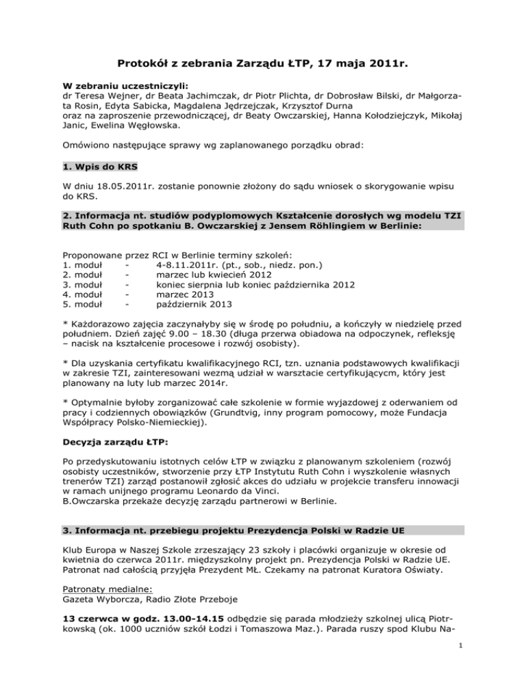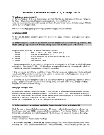 Protokół z zebrania Zarządu ŁTP, 17 maja 2011r. W zebraniu uczestniczyli: dr Teresa Wejner, dr Beata Jachimczak, dr Piotr Plichta, dr Dobrosław Bilski, dr Małgorzata Rosin, Edyta Sabicka, Magdalena Jędrzejczak, Krzysztof Durna oraz na zaproszenie przewodniczącej, dr Beaty Owczarskiej, Hanna Kołodziejczyk, Mikołaj Janic, Ewelina Węgłowska. Omówiono następujące sprawy wg zaplanowanego porządku obrad: 1. Wpis do KRS W dniu 18.05.2011r. zostanie ponownie złożony do sądu wniosek o skorygowanie wpisu do KRS. 2. Informacja nt. studiów podyplomowych Kształcenie dorosłych wg modelu TZI Ruth Cohn po spotkaniu B. Owczarskiej z Jensem Röhlingiem w Berlinie: Proponowane 1. moduł 2. moduł 3. moduł 4. moduł 5. moduł przez - RCI w Berlinie terminy szkoleń: 4-8.11.2011r. (pt., sob., niedz. pon.) marzec lub kwiecień 2012 koniec sierpnia lub koniec października 2012 marzec 2013 październik 2013 * Każdorazowo zajęcia zaczynałyby się w środę po południu, a kończyły w niedzielę przed południem. Dzień zajęć 9.00 – 18.30 (długa przerwa obiadowa na odpoczynek, refleksję – nacisk na kształcenie procesowe i rozwój osobisty). * Dla uzyskania certyfikatu kwalifikacyjnego RCI, tzn. uznania podstawowych kwalifikacji w zakresie TZI, zainteresowani wezmą udział w warsztacie certyfikującycm, który jest planowany na luty lub marzec 2014r. * Optymalnie byłoby zorganizować całe szkolenie w formie wyjazdowej z oderwaniem od pracy i codziennych obowiązków (Grundtvig, inny program pomocowy, może Fundacja Współpracy Polsko-Niemieckiej). Decyzja zarządu ŁTP: Po przedyskutowaniu istotnych celów ŁTP w związku z planowanym szkoleniem (rozwój osobisty uczestników, stworzenie przy ŁTP Instytutu Ruth Cohn i wyszkolenie własnych trenerów TZI) zarząd postanowił zgłosić akces do udziału w projekcie transferu innowacji w ramach unijnego programu Leonardo da Vinci. B.Owczarska przekaże decyzję zarządu partnerowi w Berlinie. 3. Informacja nt. przebiegu projektu Prezydencja Polski w Radzie UE Klub Europa w Naszej Szkole zrzeszający 23 szkoły i placówki organizuje w okresie od kwietnia do czerwca 2011r. międzyszkolny projekt pn. Prezydencja Polski w Radzie UE. Patronat nad całością przyjęła Prezydent MŁ. Czekamy na patronat Kuratora Oświaty. Patronaty medialne: Gazeta Wyborcza, Radio Złote Przeboje 13 czerwca w godz. 13.00-14.15 odbędzie się parada młodzieży szkolnej ulicą Piotrkowską (ok. 1000 uczniów szkół Łodzi i Tomaszowa Maz.). Parada ruszy spod Klubu Na1 uczyciela, po spotkaniu z poseł. J. Skrzydlewską, zakończy się pod UMŁ wystąpieniem Prezydent MŁ. Cele projektu: 1. Promowanie wśród młodzieży szkolnej oraz wśród mieszkańców Łodzi członkostwa Polski w Unii Europejskiej i jej roli podczas Prezydencji. 2. Wzbogacenie programu kulturalnego Prezydencji Polski. Uczestniczące szkoły i placówki oraz zaplanowane przez nie działania: Lp. 1. Data 20.04.2011 Szkoła/ placówka SP nr 149 Działanie WIELKANOC W EUROPIE CELE: · popularyzacja wiedzy o integrującej się Europie · poszerzenie wiedzy o krajach członkowskich w powiązaniu z tradycjami kulturowymi i obyczajowymi · kształtowanie postawy szacunku dla dziedzictwa kulturowego · rozwijanie umiejętności poszukiwania, selekcjonowania i wykorzystania informacji z różnych źródeł · kształtowanie umiejętności współdziałania w zespole i pracy w grupie · rozwijanie umiejętności rozwiązywania problemów w sposób twórczy Osoba do kontaktu Marzanna Gąsieniec [email protected] ETAPY PRACY każda klasa przygotuje informacje na temat zwyczajów wielkanocnych wylosowanego państwa Unii Europejskiej, przygotuje „stoisko” i prezentację zdobytych informacji w dowolny sposób, efekty pracy zespołów klasowych oceni jury 2. 9.05.2011 ZSO nr 9 Prezentacje krajów UE „Dzień Europy” – nowe kraje UE (obyczaje, kuchnia, główne zabytki, galeria znanych postaci) Małgorzata Dziedziurska m_dziedziurska @poczta.onet.pl Marzanna Gąsieniec [email protected] 3. 9.05.2011 SP nr 149 ŻYJMY ZDROWO, ROZWIJAJMY SIĘ SPORTOWO W UE W zabawie weźmie udział około 350 dzieci z przedszkoli i szkół podstawowych. 9 00 Rozpoczęcie (na boisku) 9 15 Konkurencje na boisku boks na wesoło konkurs wiedzy o zdrowym życiu „Zdrowy styl życia” żonglerka rzut beretem na odległość bieg w kaloszach bieg na czas z rakietą do tenisa stołowego konkurs „Co wiesz o krajach w UE” rzuty do kosza 10 00 – 11 00 Sztafety przedszkolaków (PM. 221, 137) 11 10 gry i zabawy dla uczniów szkół podstawowych SP. 149, SP. 193, SP 174. 4. 12.05.2011 SP nr 35 I. Bałuckie Dyktando Ortograficzne z języka angielskiego dla uczniów kl. V. 10 szkół z dzielnicy Bałuty. Impreza pod honorowym patronatem Konsula Brytyjskiego w Łodzi. Krzysztof Durnaś [email protected] 5. 13.05.2011 SP nr 35 Tanecznym krokiem po Europie. Poznajemy tańce Krzysztof 2 krajów UE. Impreza szkolna dla uczniów klas I-III (ok. 200 osób). Prezentacje klas. Durnaś [email protected] Elżbieta Bednarek [email protected] 42 648 41 70 Elżbieta Bednarek [email protected] 42 648 41 70 6. 19.05.2011 SP nr 202 Uroczystość na okoliczność Prezydencji Polski w UE ( prezentacja multimedialna, referat na temat Prezydencji, taniec, występ chóru). 7. 20.05.2011 SP nr 202 Happening – wykonanie prac plastycznych na temat: Kraje UE. 8. 24.05.2011 SP nr 153 Happening 1. Każda grupa otrzymuje wagon, na którym wykonuje collage, prezentujący wylosowany kraj. 2. Dorota Maciejewska [email protected] Gotowe 25 wagonów zostaje połączonych w pociąg i przyczepionych do lokomotywy w barwach europejskich. Na koniec uczestnicy wspólnie recytują (czytają) wiersz „Euromotywa” 9. 27.05.2011 SP nr 35 Dzień Prezydencji Polski w SP35 apel (prezentacja multimedialna, przedstawienie) dla klas IV-VI (ok. 150 uczniów) Finał VIII Międzyszkolnego Konkursu na grafikę komputerową "Nasze dziedzictwo - czyli swoje chwa