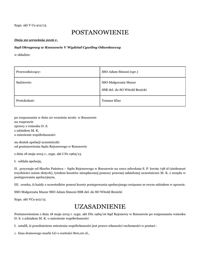 Sygn. akt V Ca 912/15 POSTANOWIENIE Dnia 20 września 2016 r. Sąd Okręgowy w Rzeszowie V Wydział Cywilny Odwoławczy w składzie: Przewodniczący: SSO Adam Simoni (spr.) Sędziowie: SSO Małgorzata Mazur SSR del. do SO Witold Benicki Protokolant: Tomasz Kluz po rozpoznaniu w dniu 20 września 2016r. w Rzeszowie na rozprawie sprawy z wniosku D. S. z udziałem M. K. o zniesienie współwłasności na skutek apelacji uczestniczki od postanowienia Sądu Rejonowego w Rzeszowie z dnia 18 maja 2015 r., sygn. akt I Ns 1969/13 I. oddala apelację, II. przyznaje od Skarbu Państwa – Sądu Rejonowego w Rzeszowie na rzecz adwokata S. P. kwotę 738 zł (siedemset trzydzieści osiem złotych), tytułem kosztów nieopłaconej pomocy prawnej udzielonej uczestniczce M. K. z urzędu w postępowaniu apelacyjnym, III. orzeka, iż każdy z uczestników ponosi koszty postępowania apelacyjnego związane ze swym udziałem w sprawie. SSO Małgorzata Mazur SSO Adam Simoni SSR del. do SO Witold Benicki Sygn. akt VCa 912/15 UZASADNIENIE Postanowieniem z dnia 18 maja 2015 r. sygn. akt INs 1969/16 Sąd Rejonowy w Rzeszowie po rozpoznaniu wniosku D. S. z udziałem M. K. o zniesienie współwłasności I. ustalił, iż przedmiotem zniesienia współwłasności jest prawo własności ruchomości w postaci : 1. kina domowego marki LG o wartości 800,00 zł., 2. sofy skórzanej koloru czarnego o wartości 3.500,00 zł., 3. fotela skórzanego, bujanego o wartości 2.000,00zł., 4. telewizora LG 42 cale o wartości 3.000,00 zł., 5. lodówki Samsung o wartości 2.500,00 zł., 6. elektronicznej wagi kuchennej o wartości 24,50 zł., 7. wagi łazienkowej o wartości 45,00 zł, 8. czajnika firmy Zelmer 17Z017 wraz z termosem inox o wartości 172,00 zł., 9. miksera Zelmer 381.7 400W wraz z kubkiem o wartości 109,00 zł. 10. kuchenki mikrofalowej Samsung MW89MST o wartości 405,00 zł., 11. 2 krzeseł barowych o wartości 222,00 zł., 12. obrazu 5 kamieni żywiołów Feng-Shui- o wartości 39,00 zł., 13. aparatu Panasonic Lumix dz3 o wartości 1.200,00 zł., 14. pralki automatycznej LG o wartości 1.200,00 zł., 15. kosza na ubrania z wikliny o wartości 80,00 zł., 16. zestawu łazienkowego składającego się z: mydelniczki, kubka, flakonu, stojaka o wartości 22,00 zł., 17. lustra przedpokojowego o wartości 150,00 zł., 18. mebli rzeźbionych składających się z: szafki, szafki- stojaka na wino, szafki- stojaka pod telefon, stołu o wartości 2.265,00., 19. krzesła, krzeseł drewno, taboretu z Indii o wartości 95,00 zł., 20. żyrandola kryształ Black Acrylic o wartości 180,00 zł., 21. łoża Sylwia wraz ze stelażem o wartości 589 zł., 22. materaca o wartości 830,00 zł., 23. żyrandola kryształ Acrylic o wartości 180,00 zł., 24. żakardowej, bawełnianej pościeli haftowanej o wartości 69,00 zł., 25. HP DESKJET F4180 o wartości 188,00 zł., 26. 500 GB WD External Elements Hi-Speed USB 2.0 7200 o wartości 207,00 zł., 27. pokrowca plandeki na samochód o wartości 59,00 zł., 28. nawigacji GPS Tom Tom ONE v3 o wartości 399,00 zł., 29. dwóch firan i jednego kompletu zasłon o łącznej wartości 300,00 zł 30. dwóch karniszy o łącznej wartości 100,00 zł, 31. półek szklanych o łącznej wartości 100,00 zł., 32. półek gipsowych o łącznej wartości 100,00 zł. 33. lampy łazienkowej o wartości 50 zł, 34. laptopa Compact o wartości 2.700 zł. II. ustalił wartość przedmiotu zniesienia współwłasności na łączną kwotę 23 879,50 zł. (dwadzieścia trzy tysiące osiemset siedemdziesiąt dziewięć złotych 50/100), III. dokonał zniesienia współwłasności poprzez przydzielenie w/w ruchomości wymienionych w p-kcie I ppkt 29 34 na rzecz wnioskodawcy D. S., natomiast pozostałych ruchomości wymienionych w p-kcie I ppkt 1-28 na rzecz uczestniczki M. K., IV. zasądził od uczestniczki M. K. na rzecz wnioskodawcy D. S. kwotę 8 589,75 zł tytułem spłaty, płatną w terminie 2 miesięcy od daty prawomocności postanowienia, V. umorzył postepowanie w przedmiocie wniosku o zniesienie współwłasności kuchenki Mastercook, VI. w pozostałej części wniosek oddalił, VII. przyznał z sum Skarbu Państwa – Sąd Rejonowy w Rzeszowie adw. S. P. – Kancelaria Adwokacka ul. (...) w R. – kwotę 2 952,00 zł ( dwa tysiące dziewięćset pięćdziesiąt dwa złote 00/100 ) tytułem wynagrodzenia pełnomocnika z urzędu, VIII. orzekł, iż każdy uczestnik ponosi koszty postepowania związane ze swym udziałem w sprawie, zasądzając od uczestniczki M. K. na rzecz wnioskodawcy D. S. kwotę 500,00 zł tytułem połowy opłaty sądowej od wniosku. Następnie postanowieniem z dnia 3 lipca 2015 r. sprostował oczywistą niedokładność w zakresie pkt III postanowienia, poprzez wpisanie w miejsce ppkt ,,27-32’’ - ,,29-34’’, a w miejsce ppkt ,,1-26’’ - ,,1-28’’/k.203/ U podstaw powyższego rozstrzygnięcia legły ustalenia faktyczne i zważania prawne zawarte w pisemnym uzasadnieniu orzeczenia / k. 189-202/, co też czyni zbędnym powtarzanie ich treści. Wnosząc apelację od powyższego postanowienia (k.207-212) uczestniczka zaskarżyła orzeczenie w części tj. pkt I, II, III, IV oraz VIII zarzucając: 1. naruszenie prawa materialnego, a to: - art. 34 krio – poprzez błędne jego zastosowanie w zakresie ustalenia przedmiotów stanowiących współwłasność stron i stworzenie w oparciu o powyższy przepis domniemania, że wszelkie ruchomości w mieszkaniu oraz darowizny rodziców stron czynione były na rzecz obu stron, a zatem stanowią przedmiot współwłasności, pomimo, że do partnerów z konkubinatu nie mogą być stosowane przepisy kroi odnoszące się do osób pozostających w związku małżeńskim - w zwłaszcza w zakresie w jakim prowadzi do uproszczenia postępowania dowodowego w zakresie wykazania, które konkretnie ruchomości zostały wspólnie nabyte przez strony, - art. 43 krio w zw. z art. 6 kc w zw. z art. 232 kpc w zw. z art. 617 kpc poprzez ich