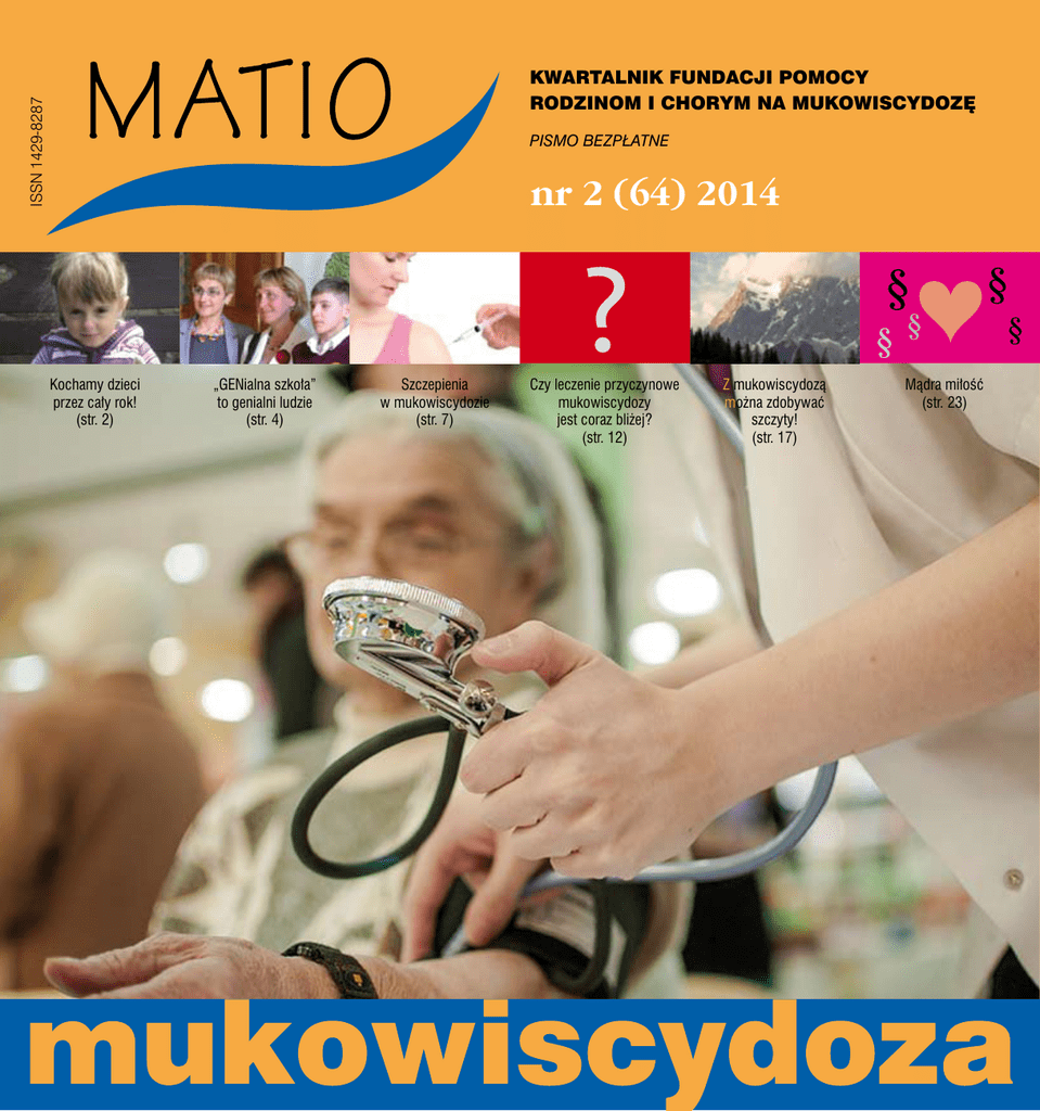 ISSN 1429-8287 KWARTALNIK FUNDACJI POMOCY RODZINOM I CHORYM NA MUKOWISCYDOZĘ PISMO BEZPŁATNE nr 2 (64) 2014 Kochamy dzieci przez cały rok! (str. 2) „GENialna szkoła” to genialni ludzie (str. 4) Szczepienia w mukowiscydozie (str. 7) Czy leczenie przyczynowe mukowiscydozy jest coraz bliżej? (str. 12) Z mukowiscydozą można zdobywać szczyty! (str. 17) Mądra miłość (str. 23) MATIO 2/2014 (64) Zespół redakcyjny: Stanisław Sitko, Paweł Wójtowicz, prof. Wojciech Cichy, Marcin Mleczko, Ewa Wróbel, Jacek Zieliński Adres redakcji: 30-507 Kraków, ul. Celna 6 tel./fax (12) 292 31 80 www.mukowiscydoza.pl e-mail: [email protected] Opracowanie graficzne: Jacek Zieliński Druk: Drukarnia Technet, Kraków Wydawca: Fundacja MATIO (nakład: 5000 egz.) Fundacja dziękuje Medycynie Praktycznej za dystrybucję czasopisma. Redakcja nie odpowiada za treść ogłoszeń i reklam. Kochamy dzieci przez cały rok! W sprawie zamieszczania reklam prosimy kontaktować się z panem Pawłem Wójtowiczem, tel. (12) 292 31 80, 887 666 555, listownie pod adresem Redakcji lub pocztą elektroniczną. Czasopismo dofinansowane ze środków PFRON w ramach celu programowego 4: zapewnienie osobom niepełnosprawnym dostępu do informacji i specjalistycznych usług. „Kochamy dzieci przez cały rok!” – to nie tylko pusty frazes. Kochamy naszych podopiecznych, choć Święta Bożego Narodzenia i Dzień Dziecka to czas szczególny, w którym każdy dorosły myśli o najmłodszych. Nasi podopieczni są bardzo bliscy naszym sercom, tak że czasami zapominamy, że weszli już w dorosłość. O tym często zapominają także ich rodzice, ale przecież nie ma nic milszego, jak drobiazg, mały prezent dany z serca – nawet gdy ma się już dowód osobisty. Dzień Dziecka sprawił, że pomieszczenia fundacji zamieniły się w wielki magazyn. Przydawały się każde ręce do pracy, choć i tak nie sposób było wysłać wszystkich prezentów w jednej chwili. Dary od naszych sponsorów Fot. na okładce: Pomiar ciśnienia podczas akcji „Dolina Mukolinków” w Szczecinie, w Centrum Handlowo-Rozrywkowym „Kupiec”. Boże, użycz mi pogody ducha, abym pogodził się z tym, czego nie mogę zmienić, odwagi, abym zmieniał to, co mogę, i mądrości, bym odróżniał jedno od drugiego. napływały partiami, ale wiedzieliśmy, że nasi podopieczni rozumieją upływ na rehabilitacji. Dla nas czerwiec stał się pięknym miesiącem – w licznej korespondencji sporo miejsca zajęły listy od dzieci i ich rodziców, nadsyłane zdjęcia – z podziękowaniami, z radością na dziecięcych buziach: 2 MATIO 2/2014 czasu. To poczucie dają dni i tygodnie w szpitalu, godziny spędzone MATIO 2/2014 „(…) Jesteśmy wdzięczni za każdy gest życzliwości kierowany w stronę naszej rodziny (…)” „(…) Nasi chłopcy byli bardzo zaskoczeni. Ich zachwyt i uśmiech na twarzy był czymś wspaniałym, nie do opisania. Obaj bawią się otrzymanymi zabawkami codziennie, a słodycze uległy konsumpcji zaraz po otwarciu paczki. ” „(…) Puzonik, bo tak nazwaliśmy po rodzinnych obradach otrzymanego od Fundacji MATIO Słonika, dotarł do nas ku WIELKIEJ radości wczoraj późnym wieczorem. Od razu za jego przywitanie wzięła się Madzia z Cześkiem (Królik, który jest od zawsze z nami i wszędzie z Madzią jeździ). Jak widać na zdjęciach, bardzo szybko się zaaklimatyzował i nie było opcji, aby nie jechał dziś z nami w Beskidy;) Tak więc wędrował po masywie Pilska:). super frajda dla niej:) – tylko Mama musi więcej pluszaków nieść w góry;)”. Przesyłam moc buziaków od Madzi… Dziękujemy za Wasze wspaniałe listy i zdjęcia – Wy też jesteście motorem naszej pracy, Wy i Wasze dzieci sprawiacie, że czasami trudne dni rozświetla uśmiech. Praca Fundacji MATIO to także żmudne, przyziemne rzeczy: przepisy i interpretacje prawne, rozmowy z darczyńcami, umowy, segregatory księgowe, protokoły i sprawozdania. Dzięki Wam możemy Madzia Kontny z Puzonikiem pamiętać, że nie jest to praca zwyczajna, że daje radość i poczucie, że pomoc ludziom stanowi o człowieczeństwie. Czasami nie jest łatwo, bo żyjemy w czasach, w których ludzie są coraz bardziej zainteresowani konsumpcją, własną przyjemnością, dbają o rozwój własnego ego. Trudno zaszczepiać ideę wolontariatu, bo coraz częściej interpretowany jest jako swoista łaska przeliczana na punkty, a nie zaszczyt. Ale na szczęście mały kamyk potrafi ruszyć lawinę – w tym wypadku lawinę dobrych uczuć: jeden młody człowiek potrafi zachęcić drugiego, ten trzeciego i stworzyć łańcuszek osób, które chcą pomóc. Nie wszyscy zostaną, by pomagać, w wielu jednak ta umiejętność zostanie na zawsze, nawet jeżeli prawdziwe owoce da po latach. Takie pozytywne postawy kształtują się także dzięki Wam – zatem wszystkie uśmiechy dzieci dedykujemy tym, którzy zechcieli nam pomagać. DK 3 Wolontariusze fundacji: Hania Baran, Wojtek Wróbel, Przemek Jakiel „GENialna szkoła” W życiu nie ma przypadków, nasze kolejne dni kształtowane są przez nas samych, choć nieraz, patrząc z szerszej perspektywy, trudno oprzeć się wrażeniu, że są wcześniej z góry ustalone, zapisane. Korespondując z laureatami naszego fundacyjnego konkursu „GENialna szkoła”, nie mogę się oprzeć wrażeniu, że jego pomysł przyszedł z głębokiego przeświadczenia, że dobrych ludzi ze świeczką szukać na świeczniku, że stoją gdzieś skromnie z boku i dziwią się, gdy ktoś im mówi, że są wspaniali. Oni nie zatracili tego, co w człowieku najcenniejsze – serca, zrozumienia, instynktu bezinteresownej pomocy. Wielu z nas widzi, jak te cechy są sukcesywnie spychane do lamusa. Dzisiaj ceni się tzw. kreatywność, koniecznie eksponowaną na forum publicznym, blichtr, egocentryzm ubrany w szatki sztucznej empatii. Bez eksponowania własnych zasług (prawdziwych lub „wykreowanych”) pomału przestajemy istnieć, a więc zn