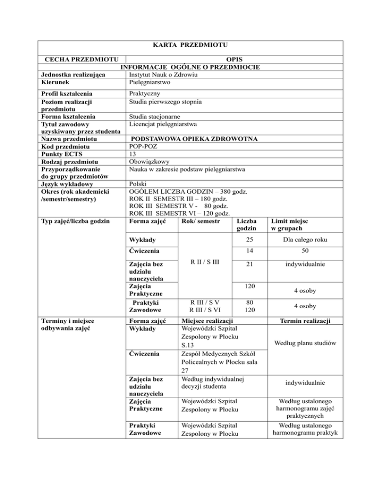 Przedmiot: Podstawowa opieka zdrowotna Zajęcia praktyczne: 45