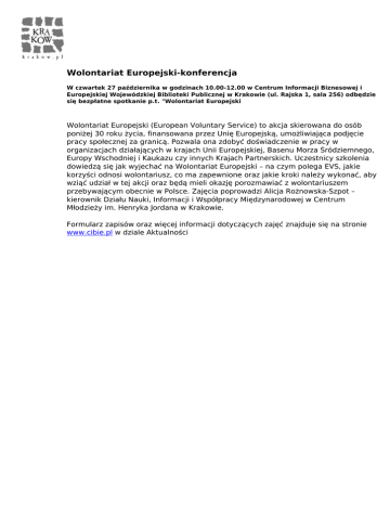 Wolontariat Europejski-konferencja W czwartek 27 października w godzinach 10.00-12.00 w Centrum Informacji Biznesowej i Europejskiej Wojewódzkiej Biblioteki Publicznej w Krakowie (ul. Rajska 1, sala 256) odbędzie się bezpłatne spotkanie p.t. "Wolontariat Europejski Wolontariat Europejski (European Voluntary Service) to akcja skierowana do osób poniżej 30 roku życia, finansowana przez Unię Europejską, umożliwiająca podjęcie pracy społecznej za granicą. Pozwala ona zdobyć doświadczenie w pracy w organizacjach działających w krajach Unii Europejskiej, Basenu Morza Śródziemnego, Europy Wschodniej i Kaukazu czy innych Krajach Partnerskich. Uczestnicy szkolenia dowiedzą się jak wyjechać na Wolontariat Europejski – na czym polega EVS, jakie korzyści odnosi wolontariusz, co ma zapewnione oraz jakie kroki należy wykonać, aby wziąć udział w tej akcji oraz będą mieli okazję porozmawiać z wolontariuszem przebywającym obecnie w Polsce. Zajęcia poprowadzi Alicja Rożnowska-Szpot – kierownik Działu Nauki, Informacji i Współpracy Międzynarodowej w Centrum Młodzieży im. Henryka Jordana w Krakowie. Formularz zapisów oraz więcej informacji dotyczących zajęć znajduje się na stronie www.cibie.pl w dziale Aktualności Powered by TCPDF (www.tcpdf.org)