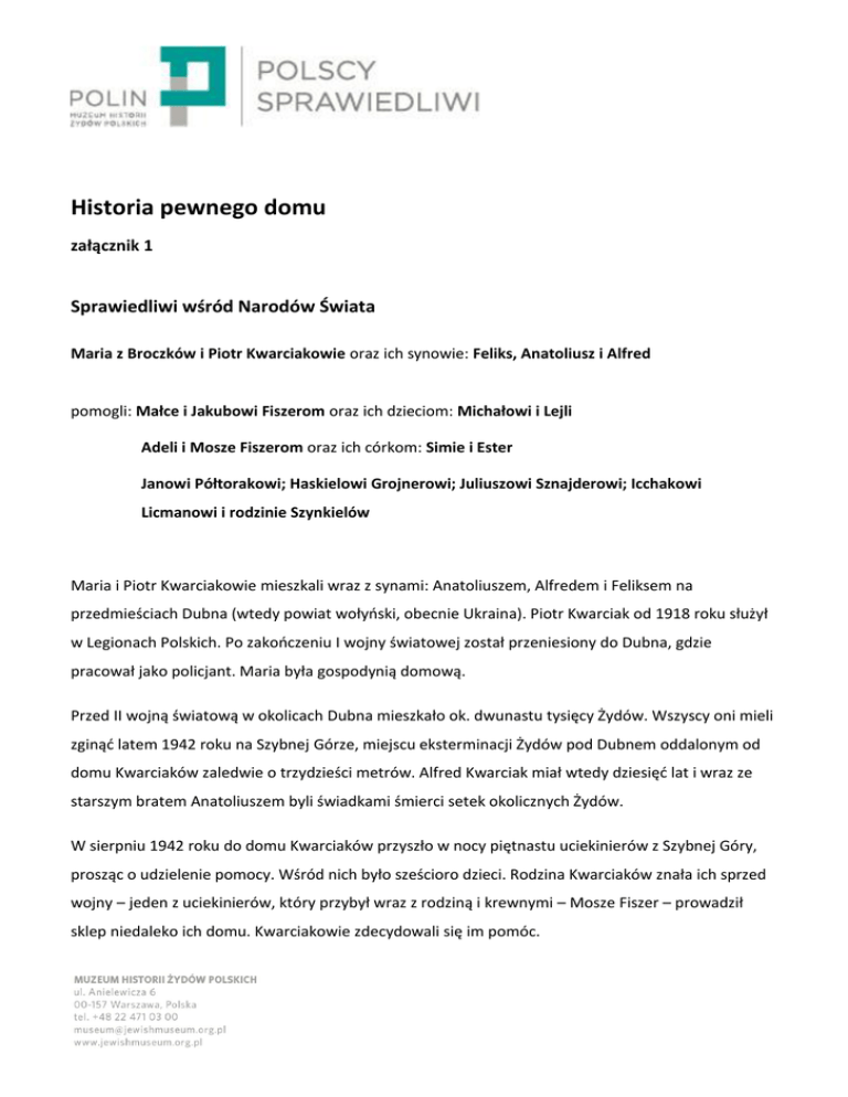 Historia pewnego domu załącznik 1 Sprawiedliwi wśród Narodów Świata Maria z Broczków i Piotr Kwarciakowie oraz ich synowie: Feliks, Anatoliusz i Alfred pomogli: Małce i Jakubowi Fiszerom oraz ich dzieciom: Michałowi i Lejli Adeli i Mosze Fiszerom oraz ich córkom: Simie i Ester Janowi Półtorakowi; Haskielowi Grojnerowi; Juliuszowi Sznajderowi; Icchakowi Licmanowi i rodzinie Szynkielów Maria i Piotr Kwarciakowie mieszkali wraz z synami: Anatoliuszem, Alfredem i Feliksem na przedmieściach Dubna (wtedy powiat wołyński, obecnie Ukraina). Piotr Kwarciak od 1918 roku służył w Legionach Polskich. Po zakończeniu I wojny światowej został przeniesiony do Dubna, gdzie pracował jako policjant. Maria była gospodynią domową. Przed II wojną światową w okolicach Dubna mieszkało ok. dwunastu tysięcy Żydów. Wszyscy oni mieli zginąć latem 1942 roku na Szybnej Górze, miejscu eksterminacji Żydów pod Dubnem oddalonym od domu Kwarciaków zaledwie o trzydzieści metrów. Alfred Kwarciak miał wtedy dziesięć lat i wraz ze starszym bratem Anatoliuszem byli świadkami śmierci setek okolicznych Żydów. W sierpniu 1942 roku do domu Kwarciaków przyszło w nocy piętnastu uciekinierów z Szybnej Góry, prosząc o udzielenie pomocy. Wśród nich było sześcioro dzieci. Rodzina Kwarciaków znała ich sprzed wojny – jeden z uciekinierów, który przybył wraz z rodziną i krewnymi – Mosze Fiszer – prowadził sklep niedaleko ich domu. Kwarciakowie zdecydowali się im pomóc. Dom Kwarciaków składał się z kuchni i trzech pokoi. Ponieważ jeden z nich był niewykończony i nie miał podłogi, Piotr Kwarciak zdecydował się skonstruować pod nim kryjówkę. Wraz z ukrywającymi się wykopał schron o głębokości czterech metrów. Na samym dole wykopu znajdowały się trzy tunele wyściełane słomą. Przygotowanie kryjówki odbywało się w tajemnicy przed ukraińskimi sąsiadami, którzy byli wrogo nastawieni do Polaków i Żydów. Ukrywający się spędzili w schronie około dwudziestu miesięcy, aż do wejścia Armii Radzieckiej do Dubna w marcu 1944 roku. Do zadań synów państwa Kwarciaków należało kupowanie i dostarczanie żywności z oddalonego od domu o cztery kilometry centrum miasta. Piotr i Maria unikali przebywania w mieście – Niemcy organizowali łapanki ludzi dorosłych, których wywozili na roboty do Niemiec. Chłopcy nosili żywność w plecakach. Wybierali zawsze inną drogę na powrót do domu, aby zmylić sąsiadów, którzy mówili, że chłopcy dobrze się uczą, skoro noszą tyle książek w plecakach. O obecności Żydów w domu Kwarciaków nie wiedział nikt. Rodzina dopiero po wojnie dowiedziała się, że również ojciec Marii Kwarciak, Franciszek Broczek i jego syn Leonard ukrywali w swoim domu Żydów. Od września 1943 do marca 1944 roku w domu mieszkało również dwunastu Niemców. W tym czasie rodzina Kwarciaków zeszła do kryjówki pod ziemią, bojąc się ostrzałów, a także wywozu do Niemiec. Z kryjówki wychodziła tylko pani Maria, która zdobywała jedzenie dla wszystkich. Niemcom mówiła, że cała rodzina przeniosła się do domu sąsiadów i że tam zanosi jedzenie. Obecność Żydów nie została nigdy przez nich odkryta. Po zajęciu tych terenów przez Armię Radziecką ukrywający się przez jakiś czas mieszkali jeszcze w Dubnie w domu pana Groinera – jednego z uratowanych Żydów. Potem wyjechali na tereny powojennej Polski, skąd udali się do Włoch. Stamtąd popłynęli do Izraela. Rodzina Fiszerów utrzymywała kontakt z rodziną Kwarciaków. Część ocalonych jednak nigdy więcej nie nawiązała z nimi kontaktu. Piotr Kwarciak został wezwany w 1944 roku do Wojska Polskiego i zginął w 1945 roku podczas wyzwalania Skierniewic. Po zakończeniu wojny rodzina została przymusowo przesiedlona na teren Polski. Zamieszkali w Bolesławcu.