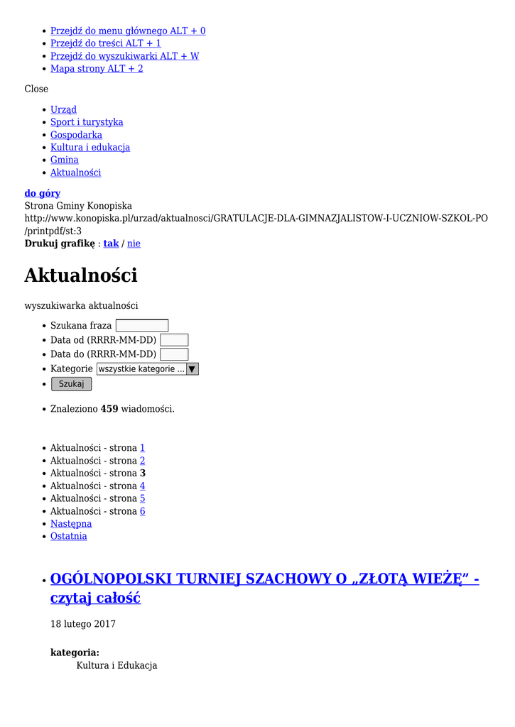 Przejdź do menu głównego ALT + 0 Przejdź do treści ALT + 1 Przejdź do wyszukiwarki ALT + W Mapa strony ALT + 2 Close Urząd Sport i turystyka Gospodarka Kultura i edukacja Gmina Aktualności do góry Strona Gminy Konopiska http://www.konopiska.pl/urzad/aktualnosci/GRATULACJE-DLA-GIMNAZJALISTOW-I-UCZNIOW-SZKOL-PO /printpdf/st:3 Drukuj grafikę : tak / nie Aktualności wyszukiwarka aktualności Szukana fraza Data od (RRRR-MM-DD) Data do (RRRR-MM-DD) Kategorie wszystkie kategorie ... ▼ Szukaj Znaleziono 459 wiadomości. Aktualności - strona 1 Aktualności - strona 2 Aktualności - strona 3 Aktualności - strona 4 Aktualności - strona 5 Aktualności - strona 6 Następna Ostatnia OGÓLNOPOLSKI TURNIEJ SZACHOWY O „ZŁOTĄ WIEŻĘ” czytaj całość 18 lutego 2017 kategoria: Kultura i Edukacja Organizatorami turnieju szachowego w eliminacjach powiatowych jest Powiatowe Zrzeszenie LZS w Częstochowie, Starostwo Powiatowe w Częstochowie, Gmina Konopiska i Gminne Centrum Kultury i Rekreacji w Konopiskach. Pierwsza runda zostanie rozstrzygnięta 26 lutego br. Serdecznie zapraszamy do udziału w turnieju! OGÓLNOPOLSKI TURNIEJ SZACHOWY O „ZŁOTĄ WIEŻ OGÓLNOPOLSKI TURNIEJ SZACHOWY O „ZŁOTĄ WIEŻĘ” - czytaj całość ŚWIAT SZKLANYCH WITRAŻY - czytaj całość 18 lutego 2017 kategoria: Kultura i Edukacja Gminne Centrum Kultury i Rekreacji w Konopiskach zaprasza na bezpłatne warsztaty rękodzieła dla młodzieży i osób dorosłych w ramach Mobilnego Uniwersytetu Kultury. Zapisy do 22 lutego 2017r. ŚWIAT SZKLANYCH WITRAŻY ŚWIAT SZKLANYCH WITRAŻY - czytaj całość Konopiska Cup 2017 - czytaj całość 17 lutego 2017 kategoria: Sport i Turystyka W niedziele 12 lutego br. odbył się kolejny turniej Konopiska Cup. Tym razem swojej mecze rozgrywali zawodnicy urodzeni 2006 i młodsi. Turniej wygrała Pogoń Ruda Śląska pokonując w finale po bardzo zaciętym meczu naszą drużynę Lotu Konopiska 3:2. W spotkaniu o trzecie miejsce Raków okazał się lepszy od Ajaksu Częstochowa. Konopiska Cup 2017 Konopiska Cup 2017 - czytaj całość OBÓZ ZIMOWY MAŁE CICHE 2017 - czytaj całość 17 lutego 2017 kategoria: Sport i Turystyka Jak co roku, Uczniowski Ludowy Klub Sportowy ALEX, działający przy Zespole Szkolno – Przedszkolnym im. Jana Kochanowskiego w Aleksandrii, zorganizował zimowy obóz narciarski w przepięknej tatrzańskiej miejscowości Małe Ciche. OBÓZ ZIMOWY MAŁE CICHE 2017 OBÓZ ZIMOWY MAŁE CICHE 2017 - czytaj całość Zawiadomienie - czytaj całość 17 lutego 2017 kategoria: Urząd Na podstawie art. 20 ust. 3 ustawy o samorządzie gminnym z dnia 8 marca 1990 r. (Dz. U. z 2016 poz. 446) zawiadamiam, że dnia 22 lutego 2017 r. (środa) o godz. 14.00 w sali konferencyjnej Urzędu Gminy w Konopiskach odbędzie się XXX sesja Rady Gminy Konopiska Zawiadomienie Zawiadomienie - czytaj całość WYMIANA KOTŁÓW / PIECÓW - Informacje wstępne - czytaj całość 17 lutego 2017 kategoria: Urząd W dniu 12 stycznia 2017r. Zarząd Województwa Śląskiego przyjął uchwałą nr 64/165/V/2017 projekt uchwały Sejmiku Województwa Śląskiego w sprawie wprowadzenia na obszarze województwa śląskiego ograniczeń w zakresie eksploatacji instalacji w których następuje spalanie paliw. WYMIANA KOTŁÓW / PIECÓW - Informacje wstępne WYMIANA KOTŁÓW / PIECÓW - Informacje wstępne - czytaj całość Kolejne wygrana w Wojewódzkiej Lidze Młodzików - czytaj całość 16 lutego 2017 kategoria: Sport i Turystyka Dwie kolejne wygrane odniosła drużyna AZS 2020 Konopiska w Wojewódzkiej Lidze Młodzików. Tym razem nasz zespół 11 lutego 2017 roku rozgrywał swoje mecze w Jaworznie. Hala, w której odbywają się siatkarskie zawody jest strasznie mała i bardzo niska, co bardzo utrudnia grę w siatkówkę. Kolejne wygrana w Wojewódzkiej Lidze Młodzików Kolejne wygrana w Wojewódzkiej Lidze Młodzików - czytaj całość Ogłoszenie - czytaj całość 14 lutego 2017 kategoria: Urząd 14 lutego 2017 roku, została złożona oferta przez Gminny Ludowy Klub Sportowy „LOT” Konopiska na realizację zadania publicznego z zakresu upowszechniania kultury fizycznej i sportu: pt. Finał, Finałów Konopiska Cup 2017 Ogłoszenie Ogłoszenie - czytaj całość Nadzwyczajna Sesja Rady Gminy Konopiska - czytaj całość 11 lutego 2017 kategoria: Urząd 10 lutego 2017 roku na nadzwyczajnej Sesji Rady Gminy Konopiska Stanisław Sączek na mocy Uchwały Rady został wpisany do Księgi Zasłużonych dla Gminy Konopiska. Radni podjęli też drugą uchwałę nadania nazwy rondu w Rększowicach imienia biskupa Franciszka Musiela. To bardzo ważne uchwały, które zostały podjęte. Nadzwyczajna Sesja Rady Gminy Konopiska Nadzwyczajna Sesja Rady Gminy Konopiska - czytaj całość Obwieszczenie - czytaj całość 10 lutego 2017 kategoria: Urząd Obwieszczenie Wójta Gminy Konopiska Obwieszczenie Obwieszczenie - czytaj całość Aktualności - strona 1 Aktualności - strona 2 Aktualności - strona 3 Aktualności - strona 4 Aktualności - strona 5 Aktualności - strona 6 Następna Ostatnia