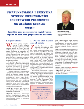 PRAKTYKA UWARUNKOWANIA I SPECYFIKA WYCENY NIERUCHOMOŒCI GRUNTOWYCH PO£O¯ONYCH NA Z£O¯ACH KOPALIN CZÊŒÆ I Specyfika prac geologicznych, wydobywania kopalin ze z³ó¿ oraz gospodarki ich zasobami 1. Wprowadzenie W Polsce grunty klasyfikowane w ewidencji gruntów i budynków jako kopalne (K) obejmuj¹ jedynie ok. 30 tys. ha, st¹d rzadko wystêpuj¹ w obrocie. Najwiêcej kopalin pozyskuje siê metodami odkrywkowymi - ponad 330 mln ton rocznie, z czego 60 mln ton to wêgiel brunatny, pozosta³e to tzw. surowce skalne. Górnictwo odkrywkowe stanowi 75 proc. wydobycia wszystkich krajowych kopalin sta³ych. W praktyce potrzeba szacowania nieruchomoœci gruntowych po³o¿onych na z³o¿ach kopalin wystêpuje najczêœciej do celów zwi¹zanych ze sprzeda¿¹, zabezpieczaniem wierzytelnoœci, sprawozdaniami finansowymi i aportami. Poniewa¿ omówienie problematyki i specyfiki wyceny nieruchomoœci po³o¿onych na z³o¿ach kopalin wymaga znajomoœci podstawowych zapisów wynikaj¹cych z ustawy prawo geologiczne i górnicze oraz z wielu przepisów wykonawczych, jak te¿, z uwagi na szeroki zakres tematyczny poruszanych zagadnieñ oraz mo¿liwoœci wydawniczych, omówienie to przedstawione zostanie w dwóch czêœciach: CZÊŒÆ I - Specyfika prac geologicznych, wydobywania kopalin ze z³ó¿ oraz gospodarki ich zasobami. CZÊŒÆ II - Specyfika i metodologia wyceny nieruchomoœci gruntowych po³o¿onych na z³o¿ach kopalin (czêœæ II zaprezentowana bêdzie w nastêpnym wydaniu Biuletynu). -4- Marzec 2013 2. Pojêcie z³ó¿ kopalin oraz ich podzia³ Z ³o¿e kopaliny jest to takie naturalne nagromadzenie minera³ów, ska³ oraz innych substancji, których wydobywanie mo¿e przynieœæ korzyœæ gospodarcz¹. Minera³y stanowi¹ pierwiastki lub zwi¹zki chemiczne o okreœlonym sk³adzie chemicznym i swoistych w³asnoœciach fizycznych powsta³e w skorupie ziemskiej wskutek dzia³ania procesów geologicznych. Pojêcie ska³ – oznacza naturalne skupienie kilku lub wiêcej minera³ów, powsta³e pod wp³ywem ró¿nych procesów geologicznych. Kopalinami nie s¹ wody, z wyj¹tkiem wód leczniczych, wód termalnych i solanek z odwadniania wyrobisk górniczych. Czynnikami decyduj¹cymi o uznaniu skupienia kopaliny za z³o¿e s¹: wielkoœæ zasobów, zawartoœæ sk³adnika u¿ytecznego w kopalinie, jej parametry jakoœciowe, budowa geologiczna terenu, forma utworów geologicznych zawieraj¹cych kopalinê, warunki eksploatacji górniczej, czynniki gospodarczo – ekonomiczne, po³o¿enie geograficzne, które wp³ywa na mo¿liwoœæ wykorzystania dr in¿. Janusz Jasiñski Rzeczoznawca Maj¹tkowy Nr 843 Uniwersytet Warmiñsko-Mazurski w Olsztynie z³o¿a. Ponadto wp³yw maj¹: warunki klimatyczne, zaludnienie obszaru i sieæ komunikacyjna, jak równie¿ warunki ochrony œrodowiska (parki, rezerwaty), g³êbokoœæ zalegania kopalin, mi¹¿szoœæ z³o¿a. Z³o¿e – winno spe³niaæ nastêpuj¹ce wymagania: iloœæ (zasoby) kwalifikuje je do eksploatacji poniewa¿ zapewnia rentowne wydobycie, jakoœæ spe³nia wymagania istniej¹cych technologii wydobycia i przeróbki, geologiczne œrodowisko wystêpowania gwarantuje ekonomicznie op³acaln¹ dostêpnoœæ graniczn¹, przeróbka i wykorzystanie jest realne i op³acalne w warunkach wspó³czesnych mo¿liwoœci technicznych i ekonomicznych. Kopaliny, ze wzglêdu na stan skupienia w jakim wystêpuj¹ dzieli siê na: ! sta³e (wêgiel, rudy, sole), ! ciek³e (ropa naftowa, wody mineralne) , ! gazowe (gaz ziemny). „Przyroda tworzy koncentracjê minera³ów i ska³ w skorupie ziemskiej, a myœl ludzka wyró¿nia w niej z³o¿a kopalin u¿ytecznych.” www.rzeczoznawcy-wielkopolska.pl PRAKTYKA Ze wzglêdu na sposób ich traktowania w toku eksploatacji wyodrêbnia siê: ! kopaliny g³ówne, ! kopaliny wspó³wystêpuj¹ce – s¹ to kopaliny wystêpuj¹ce obok siebie, kwalifikuj¹ce siê do jednoczesnego urobku, ! kopaliny towarzysz¹ce – wystêpuj¹ w z³o¿u kopaliny g³ównej, lecz nie kwalifikuj¹ siê do samodzielnego wydobywania (tworz¹ zwykle przerosty w z³o¿u kopaliny g³ównej lub w jej pobli¿u). W kopalniach odkrywkowych s¹ to równie¿ kopaliny w nadk³adzie, ! kopaliny odpadowe - stanowi¹ ska³y o nieznanej jeszcze przydatnoœci u¿ytkowej, towarzysz¹ce kopalinom u¿ytecznym, które s¹ (musz¹ byæ) urabiane i transportowane na powierzchniê, np. przy g³êbieniu szybów i prowadzeniu podziemnych robót udostêpniaj¹cych z³o¿e. Szczególnym rodzajem odpadów s¹ materia³y masowo uzyskiwane podczas przygotowywania z³o¿a do eksploatacji odkrywkowej. Ich iloœæ przewy¿sza zwykle wielokrotnie iloœæ kopaliny i uzyskiwanego z niej surowca mineralnego, np. w kopalniach wêgla brunatnego. Gromadzenie tego surowca na powierzchni powoduje niekorzystne zmiany w œrodowisku. Zasoby z³o¿a – wyodrêbnia siê: ! zasoby geologiczne z³o¿a – ca³kowita iloœæ kopaliny w z³o¿u (stanowi¹ je zasoby bilansowe i pozabilansowe); ! zasoby bilansowe – s¹ iloœci¹ kopaliny w granicach z³o¿a (w tysi¹cach ton, tysi¹cach metrów szeœciennych lub milionach metrów szeœciennych), której jakoœæ odpowiada aktualnym kryteriom gospodarczego wykorzystania, a z³o¿e spe³nia kryteria geologiczno– górnicze bilansowoœci umo¿liwiaj¹ce eksploatacjê; ! zasoby pozabilansowe – kopalina, która nie spe³nia aktualnie kryteriów bilansowoœci, znajduje siê w pozabilansowych warunkach geologiczno– górniczych, lecz ewentualnie w przysz³oœci mo¿e byæ gospodarczo wykorzystana; ! zasoby przemys³owe – czêœæ zasobów bilansowych, która przeznaczona jest do eksploatacji w projekcie zagospodarowania z³o¿a; ! zasoby nieprzemys³owe – czêœæ zasobów geologicznych, które okreœlone s¹ w projekcie zagospodarowania z³o¿a jako niemo¿liwe do wydobycia; ! zasoby operatywne - stanowi¹ zasoby przemys³owe pomniejszone o przewidywane straty w zasobach przemys³owych, bêd¹ce ich czêœci¹ przewidzian¹ do pozostawienia 