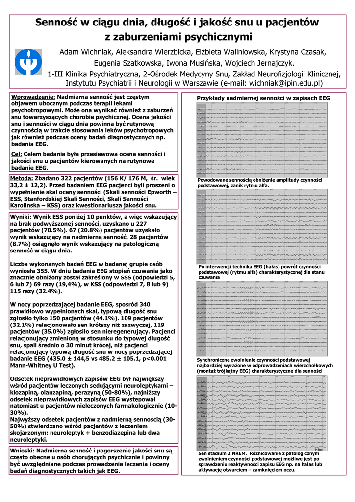 Senność w ciągu dnia, długość i jakość snu u pacjentów z zaburzeniami psychicznymi Adam Wichniak, Aleksandra Wierzbicka, Elżbieta Waliniowska, Krystyna Czasak, Eugenia Szatkowska, Iwona Musińska, Wojciech Jernajczyk. 1-III Klinika Psychiatryczna, 2-Ośrodek Medycyny Snu, Zakład Neurofizjologii Klinicznej, Instytutu Psychiatrii i Neurologii w Warszawie (e-mail: [email protected]) Wprowadzenie: Nadmierna senność jest częstym objawem ubocznym podczas terapii lekami psychotropowymi. Może ona wynikać również z zaburzeń snu towarzyszących chorobie psychicznej. Ocena jakości snu i senności w ciągu dnia powinna być rutynową czynnością w trakcie stosowania leków psychotropowych jak również podczas oceny badań diagnostycznych np. badania EEG. Przykłady nadmiernej senności w zapisach EEG Cel: Celem badania była przesiewowa ocena senności i jakości snu u pacjentów kierowanych na rutynowe badanie EEG. Metoda: Zbadano 322 pacjentów (156 K/ 176 M, śr. wiek 33,2 ± 12,2). Przed badaniem EEG pacjenci byli proszeni o wypełnienie skal oceny senności (Skali senności Epworth – ESS, Stanfordzkiej Skali Senności, Skali Senności Karolinska – KSS) oraz kwestionariusza jakości snu. Powodowane sennością obniżenie amplitudy czynności podstawowej, zanik rytmu alfa. Wyniki: Wynik ESS poniżej 10 punktów, a więc wskazujący na brak podwyższonej senności, uzyskano u 227 pacjentów (70.5%). 67 (20.8%) pacjentów uzyskało wynik wskazujący na nadmierną senność, 28 pacjentów (8.7%) osiągnęło wynik wskazujący na patologiczną senność w ciągu dnia. Liczba wykonanych badań EEG w badanej grupie osób wyniosła 355. W dniu badania EEG stopień czuwania jako znacznie obniżony został zakreślony w SSS (odpowiedzi 5, 6 lub 7) 69 razy (19,4%), w KSS (odpowiedzi 7, 8 lub 9) 115 razy (32.4%). W nocy poprzedzającej badanie EEG, spośród 340 prawidłowo wypełnionych skal, typową długość snu zgłosiło tylko 150 pacjentów (44.1%). 109 pacjentów (32.1%) relacjonowało sen krótszy niż zazwyczaj, 119 pacjentów (35.0%) zgłosiło sen nieregenerujący. Pacjenci relacjonujący zmienioną w stosunku do typowej długość snu, spali średnio o 30 minut krócej, niż pacjenci relacjonujący typową długość snu w nocy poprzedzającej badanie EEG (435.0 ± 144,5 vs 485.2 ± 105.1, p<0.001 Mann-Whitney U Test). Po interwencji technika EEG (hałas) powrót czynności podstawowej (rytmu alfa) charakterystycznej dla stanu czuwania Synchroniczne zwolnienie czynności podstawowej najbardziej wyrażone w odprowadzeniach wierzchołkowych (montaż trójkątny EEG) charakterystyczne dla senności Odsetek nieprawidłowych zapisów EEG był największy wśród pacjentów leczonych sedującymi neuroleptykami – klozapiną, olanzapiną, perazyną (50-80%), najniższy odsetek nieprawidłowych zapisów EEG występował natomiast u pacjentów nieleczonych farmakologicznie (1030%). Najwyższy odsetek pacjentów z nadmierną sennością (3050%) stwierdzano wśród pacjentów z leczeniem skojarzonym: neuroleptyk + benzodiazepina lub dwa neuroleptyki. Wnioski: Nadmierna senność i pogorszenie jakości snu są często obecne u osób chorujących psychicznie i powinny być uwzględniane podczas prowadzenia leczenia i oceny badań diagnostycznych takich jak EEG. Sen stadium 2 NREM. Różnicowanie z patologicznym zwolnieniem czynności podstawowej możliwe jest po sprawdzeniu reaktywności zapisu EEG np. na hałas lub aktywację otwarciem – zamknięciem oczu.