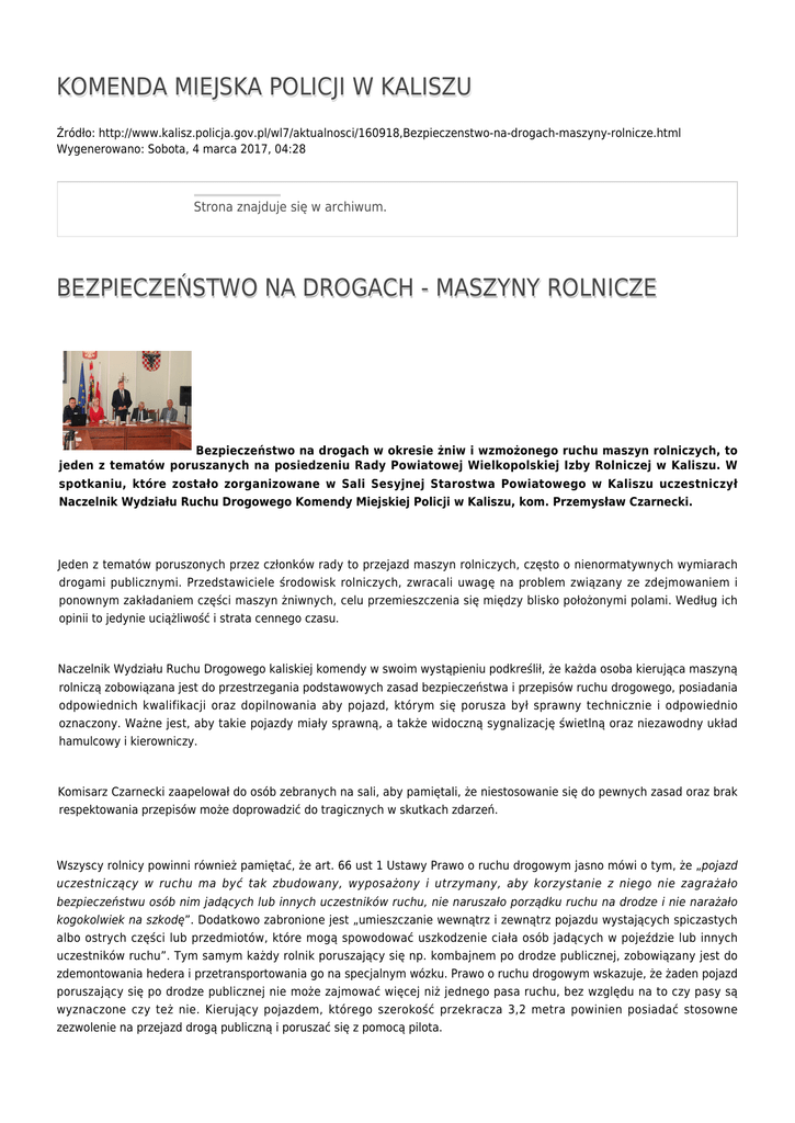 KOMENDA MIEJSKA POLICJI W KALISZU Źródło: http://www.kalisz.policja.gov.pl/wl7/aktualnosci/160918,Bezpieczenstwo-na-drogach-maszyny-rolnicze.html Wygenerowano: Sobota, 4 marca 2017, 04:28 Strona znajduje się w archiwum. BEZPIECZEŃSTWO NA DROGACH - MASZYNY ROLNICZE Bezpieczeństwo na drogach w okresie żniw i wzmożonego ruchu maszyn rolniczych, to jeden z tematów poruszanych na posiedzeniu Rady Powiatowej Wielkopolskiej Izby Rolniczej w Kaliszu. W spotkaniu, które zostało zorganizowane w Sali Sesyjnej Starostwa Powiatowego w Kaliszu uczestniczył Naczelnik Wydziału Ruchu Drogowego Komendy Miejskiej Policji w Kaliszu, kom. Przemysław Czarnecki. Jeden z tematów poruszonych przez członków rady to przejazd maszyn rolniczych, często o nienormatywnych wymiarach drogami publicznymi. Przedstawiciele środowisk rolniczych, zwracali uwagę na problem związany ze zdejmowaniem i ponownym zakładaniem części maszyn żniwnych, celu przemieszczenia się między blisko położonymi polami. Według ich opinii to jedynie uciążliwość i strata cennego czasu. Naczelnik Wydziału Ruchu Drogowego kaliskiej komendy w swoim wystąpieniu podkreślił, że każda osoba kierująca maszyną rolniczą zobowiązana jest do przestrzegania podstawowych zasad bezpieczeństwa i przepisów ruchu drogowego, posiadania odpowiednich kwalifikacji oraz dopilnowania aby pojazd, którym się porusza był sprawny technicznie i odpowiednio oznaczony. Ważne jest, aby takie pojazdy miały sprawną, a także widoczną sygnalizację świetlną oraz niezawodny układ hamulcowy i kierowniczy. Komisarz Czarnecki zaapelował do osób zebranych na sali, aby pamiętali, że niestosowanie się do pewnych zasad oraz brak respektowania przepisów może doprowadzić do tragicznych w skutkach zdarzeń. Wszyscy rolnicy powinni również pamiętać, że art. 66 ust 1 Ustawy Prawo o ruchu drogowym jasno mówi o tym, że „pojazd uczestniczący w ruchu ma być tak zbudowany, wyposażony i utrzymany, aby korzystanie z niego nie zagrażało bezpieczeństwu osób nim jadących lub innych uczestników ruchu, nie naruszało porządku ruchu na drodze i nie narażało kogokolwiek na szkodę”. Dodatkowo zabronione jest „umieszczanie wewnątrz i zewnątrz pojazdu wystających spiczastych albo ostrych części lub przedmiotów, które mogą spowodować uszkodzenie ciała osób jadących w pojeździe lub innych uczestników ruchu”. Tym samym każdy rolnik poruszający się np. kombajnem po drodze publicznej, zobowiązany jest do zdemontowania hedera i przetransportowania go na specjalnym wózku. Prawo o ruchu drogowym wskazuje, że żaden pojazd poruszający się po drodze publicznej nie może zajmować więcej niż jednego pasa ruchu, bez względu na to czy pasy są wyznaczone czy też nie. Kierujący pojazdem, którego szerokość przekracza 3,2 metra powinien posiadać stosowne zezwolenie na przejazd drogą publiczną i poruszać się z pomocą pilota. maszynyrol Fot. W.Przybylska - Starostwo Powiatowe Ocena: 0/5 (0) Tweetnij