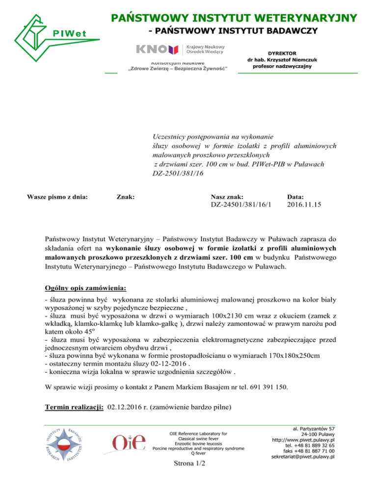 PAŃSTWOWY INSTYTUT WETERYNARYJNY - PAŃSTWOWY INSTYTUT BADAWCZY Konsorcjum Naukowe „Zdrowe Zwierzę – Bezpieczna Żywność” DYREKTOR dr hab. Krzysztof Niemczuk profesor nadzwyczajny Uczestnicy postępowania na wykonanie śluzy osobowej w formie izolatki z profili aluminiowych malowanych proszkowo przeszklonych z drzwiami szer. 100 cm w bud. PIWet-PIB w Puławach DZ-2501/381/16 Wasze pismo z dnia: Znak: Nasz znak: Data: DZ-24501/381/16/1 2016.11.15 Państwowy Instytut Weterynaryjny – Państwowy Instytut Badawczy w Puławach zaprasza do składania ofert na wykonanie śluzy osobowej w formie izolatki z profili aluminiowych malowanych proszkowo przeszklonych z drzwiami szer. 100 cm w budynku Państwowego Instytutu Weterynaryjnego – Państwowego Instytutu Badawczego w Puławach. Ogólny opis zamówienia: - śluza powinna być wykonana ze stolarki aluminiowej malowanej proszkowo na kolor biały wyposażonej w szyby pojedyncze bezpieczne , - śluza musi być wyposażona w drzwi o wymiarach 100x2130 cm wraz z okuciem (zamek z wkładką, klamko-klamkę lub klamko-gałkę ), drzwi należy zamontować w prawym narożu pod katem około 45o - śluza musi być wyposażona w zabezpieczenia elektromagnetyczne zabezpieczające przed jednoczesnym otwarciem obydwu drzwi , - śluza powinna być wykonana w formie prostopadłościanu o wymiarach 170x180x250cm - ostateczny termin montażu śluzy 02-12-2016 . - konieczna wizja lokalna w sprawie uzgodnienia szczegółów . W sprawie wizji prosimy o kontakt z Panem Markiem Basajem nr tel. 691 391 150. Termin realizacji: 02.12.2016 r. (zamówienie bardzo pilne) OIE Reference Laboratory for Classical swine fever Enzootic bovine leucosis Porcine reproductive and respiratory syndrome Q fever Strona 1/2 al. Partyzantów 57 24-100 Puławy http://www.piwet.pulawy.pl tel. +48 81 889 32 65 faks +48 81 887 71 00 [email protected] Osobami uprawnionymi przez zamawiającego do kontaktów są: Mgr Agata Wawer, mgr Aneta Kruk – tel. 081/889 31 00, Ofertę zawierającą: - formularz ofertowy wg załączonego druku, - rysunki oraz opis techniczny należy przesłać pocztą e-mail: [email protected] lub składać na adres Instytutu osobiście nie później niż do dnia 17.11.2016 r. do godz. 14.00. Strona 2/2
