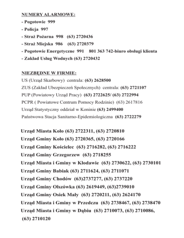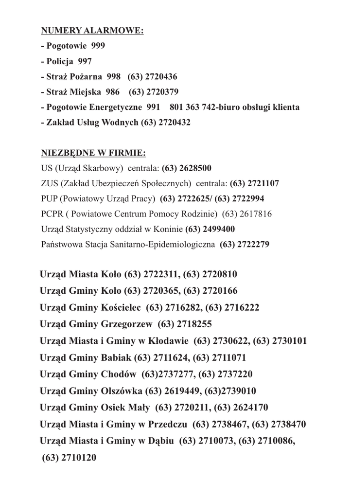 NUMERY ALARMOWE: - Pogotowie 999 - Policja 997 - Stra¿ Po¿arna 998 (63) 2720436 - Stra¿ Miejska 986 (63) 2720379 - Pogotowie Energetyczne 991 801 363 742-biuro obs³ugi klienta - Zak³ad Us³ug Wodnych (63) 2720432 NIEZBÊDNE W FIRMIE: US (Urz¹d Skarbowy) centrala: (63) 2628500 ZUS (Zak³ad Ubezpieczeñ Spo³ecznych) centrala: (63) 2721107 PUP (Powiatowy Urz¹d Pracy) (63) 2722625/ (63) 2722994 PCPR ( Powiatowe Centrum Pomocy Rodzinie) (63) 2617816 Urz¹d Statystyczny oddzia³ w Koninie (63) 2499400 Pañstwowa Stacja Sanitarno-Epidemiologiczna (63) 2722279 Urz¹d Miasta Ko³o (63) 2722311, (63) 2720810 Urz¹d Gminy Ko³o (63) 2720365, (63) 2720166 Urz¹d Gminy Koœcielec (63) 2716282, (63) 2716222 Urz¹d Gminy Grzegorzew (63) 2718255 Urz¹d Miasta i Gminy w K³odawie (63) 2730622, (63) 2730101 Urz¹d Gminy Babiak (63) 2711624, (63) 2711071 Urz¹d Gminy Chodów (63)2737277, (63) 2737220 Urz¹d Gminy Olszówka (63) 2619449, (63)2739010 Urz¹d Gminy Osiek Ma³y (63) 2720211, (63) 2624170 Urz¹d Miasta i Gminy w Przedczu (63) 2738467, (63) 2738470 Urz¹d Miasta i Gminy w D¹biu (63) 2710073, (63) 2710086, (63) 2710120 1. Gabinety lekarskie. 2. Zak³ady Opieki Zdrowotnej. 3. Pracownie rentgenowskie i USG, badania laboratoryjne. 4. Przychodnie i poradnie, pracwonie protetyczne. 5. Praktyka lekarska, po³oznicza, pielêgniarska, stomatologiczna. 6. Badania kierowców. 7. Oœrodki szkolenia kierowców. 8. Mechanika pojazdowa: - stacja diagnostyczna - sprzeda¿ hurtowa gazu, gaz butlowy - salon i serwis samochodowy - stacja paliw - blacharstwo i lakiernictwo - akcesoria samochodowe i artyku³y motoryzacyjne - us³ugi tapicerskie - sprzeda¿ opon - myjnia - autokomis - sprzeda¿, spedycja obs³ugi akumulatorów 9. Naprawa, produkcja oraz sprzeda¿: narzedzi, czêœci zamiennych, maszyn produkcyjnych i rolniczych, sprzetu po¿arniczego. 10. Taxi. 11. Transport krajowy, miêdzynarodowy i spedycja. 12. Handel obwoŸny: - bazar - artyku³y szkolne - bielizna - tekstylia i odzie¿ 13. Hurtownie: - farb i materia³ów budowlanych - nasion ogrodniczych - odzie¿y - kwiatów - odzie¿y u¿ywanej - artyku³y spo¿ywcze 14. Sklepy wielobran¿owe: - obuwniczy - bieliŸniarski - firankarnia - rybny - artyku³y poscielowe i tekstylia. - sportowy - wszystko dla go³êbi - alkohole - przyprawy 15. Artyku³y spo¿ywcze i ogólnoprzemys³owe. 16. Artyku³y chemiczne. 17. Sklepy odzie¿owe. 18. Produkcja odzie¿y roboczej. 19. Zak³ady miêsne, zak³ady wêdliniarskie, sklepy miêsne. 20. Cukiernie i piekarnie. 21. Kioski. 22. Jubilerstwo. 23. Produkcja, sprzeda¿ mebli. 24. Kwiaciarnie i upominki. 25. Handel: - artyku³y poœcielowe - odzie¿ - smalec - sprzeda¿ wêgla - stal - odzie¿ specjalistyczna - bi¿uteria - artyku³y szkolne, biurowe - p³ytki ceramiczne - znicze - nasiona rolnicze - stolarka okienna - Patrz: Stolarka okienna i drzwi; wyroby i monta¿ kominków i schodów - artyku³y budowlane i monta¿owe - Patrz: Budowlanka i wykoñczenia wnêtrz - czêœci samochodowe - Patrz: Akcesoria samochodowe i artyku³y Motoryzacyjne - ceramika ³azienkowa - Patrz: Instalacje sanitarne i ogrzewanie; instalacje gazowe 26. Wyroby hutnicze. 27. Stolarka i rymarstwo; zak³ady betoniarskie i kamieniarstwo. 28. Œlusarstwo, spawalnictwo i obróbka. 29. Instalacje sanitarne i ogrzewanie; instalacje gazowe. 30. Geodezja i kartografia. 31. Elektrycznoœæ: - elektryka - elektrotechnika, elektromechanika, elektronika 32. Budownictwo i wykoñczenia wnêtrz. 33. Biura projektów i kosztorysów, wycena, rzeczoznawstwo. 34. Poœrednictwo finansowe, biuro rachunkowe, nieruchomoœci. 35. Poœrednictwo ubezpieczeniowe, marketing. 36. Kancelarie prawne, notarialne, adwokackie. 37. Sieæ placówek bankowych; po¿yczki, inne formy udzielania kredytu. 38. Agencje reklamowe, reklamy, szyldy, poligrafia, grawerowanie. 39. Wydawnictwa; gazety. 40. Drukarnie 41. Edukacja. 42. Nauczanie jêzyków obcych; biura tlumaczeñ. 43. Szkolenia BHP, instrukcje przeciwpo¿arowe. 44. Wynajem pomieszczeñ biurowych. 45. Kompleksowe wyposa¿enie biur i sklepów. 46. Obs³ugi informatyczne i komputery: - sieci komputerowe i bazy danych - serwis komputerowy oraz zak³adanie stron - sprzeda¿ internetu 47. Studia video - filmowania i fotograficzne. 48. Rekreacje. 49. Gastronomia i puby. 50. Salony kosmetyczne; masa¿u (fizjoterapia). 51. Salony fryzjerskie. 52. Rolnictwo, centrum ogrodnicze, zak³¹danie i pielêgnacja ogrodów. 53. Dekoracje i planowanie wnêtrz. 54. Prace gospodarcze: (sprz¹tanie, us³ugi porz¹dkowe, pralnia); us³ugi komunalne: (czyszczenie kanalizacyjne, wywóz p³ynnych œrodków). 55. Stolarka okienna i drzwi; wyroby i monta¿ kominków i schodów. 56. Wyroby i materia³y œcierne. 57. Krawiectwo i przeróbki krawieckie. 58. Produkcja opakowañ 59. Us³ugi: - produkcja bielizny - biuro podatkowe - wyroby piecz¹tek - produkcja karmy dla psów - Hotel “SARA” - wyroby zdrowotne z gorczycy - skup metali kolorowych - skup z³omu - ekorecykling - przewóz ¿ywca - pakowanie prezentów - produkcja kwiatów - us³ugi na rzecz innych firm - poœrednictwo sprzeda¿y - produkcja proszku do polerowania - wyposa¿enie szkó³ w sprzêt multimedialny - energia odnawialna z wiatru - turbiny wiatrowe - projektowanie, sprzeda¿, monta¿ odkurzaczy - wyroby optyczne - dostarczanie naturalnej wody Ÿródlanej - bioenergoterapia - produkcja i renowacja pi³ tasmowych - (certyfikat rynków) poœrednictwo handlowe - organizowanie imprez turystycznych, przewóz - produkcja i handel tekstylii domowych - autoryzowana obs³uga pojazdów Scania - produkcja wyrobów mleczarskich - monta¿ i remont urz¹dzeñ ch³odniczych - kompleksowe sprz¹tanie obiektów - produkcja szk³a - produkcja zniczy - obs³uga cieplarniana - us³ugi mieszkaniowe - serwis i sprzeda¿ komputerów - taxi - Patrz: Taxi - transportowe - Patrz: Transport krajowy, miêdzynarodowy spedycja - hutnicze - Patrz: Wyroby hutnicze - stolarskie - Patrz: Stolarka i rymarstwo; zak³ad