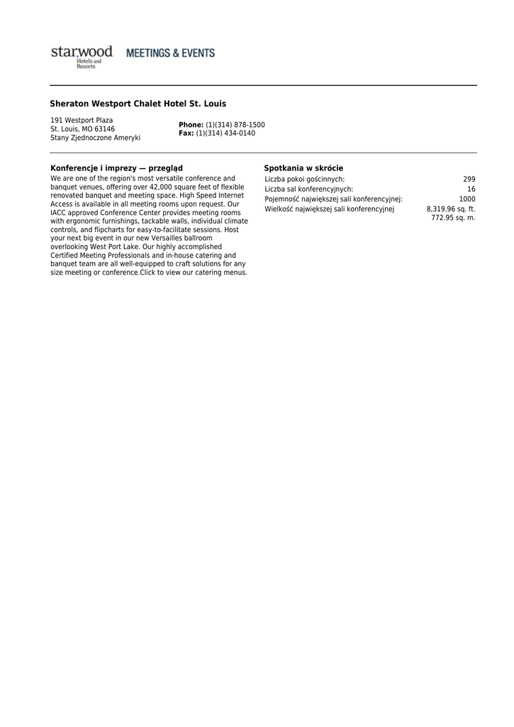 Sheraton Westport Chalet Hotel St. Louis 191 Westport Plaza St. Louis, MO 63146 Stany Zjednoczone Ameryki Phone: (1)(314) 878-1500 Fax: (1)(314) 434-0140 Konferencje i imprezy — przegląd Spotkania w skrócie We are one of the region's most versatile conference and banquet venues, offering over 42,000 square feet of flexible renovated banquet and meeting space. High Speed Internet Access is available in all meeting rooms upon request. Our IACC approved Conference Center provides meeting rooms with ergonomic furnishings, tackable walls, individual climate controls, and flipcharts for easy-to-facilitate sessions. Host your next big event in our new Versailles ballroom overlooking West Port Lake. Our highly accomplished Certified Meeting Professionals and in-house catering and banquet team are all well-equipped to craft solutions for any size meeting or conference.Click to view our catering menus. Liczba pokoi gościnnych: Liczba sal konferencyjnych: Pojemność największej sali konferencyjnej: Wielkość największej sali konferencyjnej 299 16 1000 8,319.96 sq. ft. 772.95 sq. m. Sheraton Westport Chalet Hotel St. Louis 191 Westport Plaza St. Louis, MO 63146 Stany Zjednoczone Ameryki Phone: (1)(314) 878-1500 Fax: (1)(314) 434-0140 Specyfikacja szczegółowa Nieruchomości Typ obiektu Suburban Liczba sal konferencyjnych 16 Rok budowy 1973 Całkowita wielkość sal konferencyjnych 3,901.93 sq. m. 42,000.02 sq. ft. Liczba budynków 1 Wielkość największej sali konferencyjnej 772.95 sq. m. 8,319.96 sq. ft. Liczba pięter 6 Pojemność największej sali konferencyjnej 1,000 Pojemność najmniejszej sali konferencyjnej 27.87 sq. m. Pojemność najmniejszej sali konferencyjnej 20 299.99 sq. ft. Pokoje gościnne Data zameldowania 3:00 PM Internet w pokoju Wireless High Speed Internet Access in All Guest Rooms Data wymeldowania 12:00 PM Liczba pokoi gościnnych 299 Udogodnienia Basen Yes Nazwa basenu Children's Pool Outdoor Pool (Seasonal) Lokalne & atrakcje Strefa czasowa C Pobliskie lotniska Lambert-St. Louis International Airport Kod lotniska STL Odległość od lotniska 9.14 Kilometers 5.68 Miles Obszar lokalny We are centrally located in St. Louis's popular West Port Plaza area, placing us just minutes from some of the city's most popular attractions. West Port Plaza offers access to more than 30 restaurants, exclusive shops, and entertainment. Love to shop? We are seven miles away from St. Louis Galleria and four miles from St. Louis Mills Shopping Center. Make your St. Louis trip complete with a visit to the Jefferson National Expansion Memorial, also known as the Gateway Arch. Experience the best sports city in the U.S. take in a St. Louis Cardinal baseball game, St. Louis Rams football game, or St. Louis Blues hockey game. You'll soon see why St. Louis sports fans love our teams so much! Transport & parkowanie Dowóz na lotnisko i z lotniska Advance Search: There is an Airport Shuttle service on-site from the hotel to the nearest airport. Consider only courtesy shuttle services. Opłaty & podatki Waluta lokalna United States Dollars Kod waluty USD Metody płatności • CARTE BLANCHE • DINERS/SUNDIN/AMOCO • JAPAN CREDIT BUREAU • DISCOVER NETWORK • AMEX / OPTIMA • MASTER CARD • VISA Sheraton Westport Chalet Hotel St. Louis 191 Westport Plaza St. Louis, MO 63146 Stany Zjednoczone Ameryki Phone: (1)(314) 878-1500 Fax: (1)(314) 434-0140 Email: Capacity Charts Room Name Key Dim. (l x w) Area Height Banq. Thtr. Alpine 1 - 13.11 m. x 10.67 m.43.01 ft. x 35.01 ft. 139.81 sq. m. 1,504.90 sq. ft. - 90 110 Alpine 2 - 12.50 m. x 8.53 m.41.01 ft. x 27.99 ft. 106.65 sq. m. 1,147.97 sq. ft. - 80 80 Basel - 11.58 m. x 6.71 m.37.99 ft. x 22.01 ft. 77.66 sq. m. 835.93 sq. ft. - 70 100 Bern - 13.72 m. x 9.75 m.45.01 ft. x 31.99 ft. 133.78 sq. m. 1,440.00 sq. ft. - 90 120 Davos - 9.14 m. x 5.79 m.29.99 ft. x 19.00 ft. 52.95 sq. m. 569.95 sq. ft. - 50 60 Geneva - 13.72 m. x 10.97 m.45.01 ft. x 35.99 ft. 150.50 sq. m. 1,619.97 sq. ft. - 120 200 Interlaken - 6.71 m. x 7.62 m.22.01 ft. x 25.00 ft. 24.53 sq. m. 264.04 sq. ft. - 40 50 Lugano - 9.14 m. x 6.10 m.29.99 ft. x 20.01 ft. 55.74 sq. m. 599.98 sq. ft. - 50 60 Matterhorn - 12.80 m. x 21.03 m.41.99 ft. x 69.00 ft. 269.22 sq. m. 2,897.86 sq. ft. - 220 280 St. Moritz - 14.63 m. x 9.75 m.48.00 ft. x 31.99 ft. 142.69 sq. m. 1,535.90 sq. ft. - 100 120 VERSAILLES BALLROOM - - - - - - Versailles 1 - 15.85 m. x 24.38 m.52.00 ft. x 79.99 ft. 386.46 sq. m. 4,159.82 sq. ft. - 400 500 Versailles 2 - 15.85 m. x 24.38 m.52.00 ft. x 79.99 ft. 386.46 sq. m. 4,159.82 sq. ft. - 400 500 Versailles Ballroom - 31.70 m. x 24.38 m.104.00 ft. x 79.99 ft. 772.93 sq. m. 8,319.75 sq. ft. - 800 1,000 ZURICH BALLROOM - - - - - - Zermatt - 8.23 m. x 6.40 m.27.00 ft. x 21.00 ft. 52.67 sq. m. 566.94 sq. ft. - 50 60 Zurich - 16.46 m. x 7.92 m.54.00 ft. x 25.98 ft. 130.43 sq. m. 1,403.94 sq. ft. - 100 150 Zurich Ballroom - 468.22 sq. m. 5,039.88 sq. ft. 21.95 m. x 21.34 m.72.01 ft. x 70.01 ft. - 380 600 Room Name Conf. Rec. Class U-Shp. H. Sq. Dinner Dance Zurich Ballroom 35 195 36 27 - - Zurich Ballroom 35 150 32 27 - - Zurich Ballroom 42 108 40 35 - - Zurich Ballroom 40 185 60 47 - - Zurich Ballroom 32 75 36 25 - - Zurich Ballroom 55 210 90 50 - - Zurich Ballroom 24 68 18 50 - - Zurich Ballroom 32 80 36 25 - - Zurich Ballroom - 350 130 60 - - Zurich Ballroom 40 200 60 47 - - Zurich Ballroom - - - - - - Zurich Ballroom - 550 290 - - - Zurich Ballroom - 550 290 - - - Zurich Ballroom - 1,100 580 - - - Zurich Ballroom - - - - - - Zurich Ballroom 32 75 36 25 - - Zurich Ballroom 50 180 75 42 - - Zurich Ballroom - 655 280 - - -