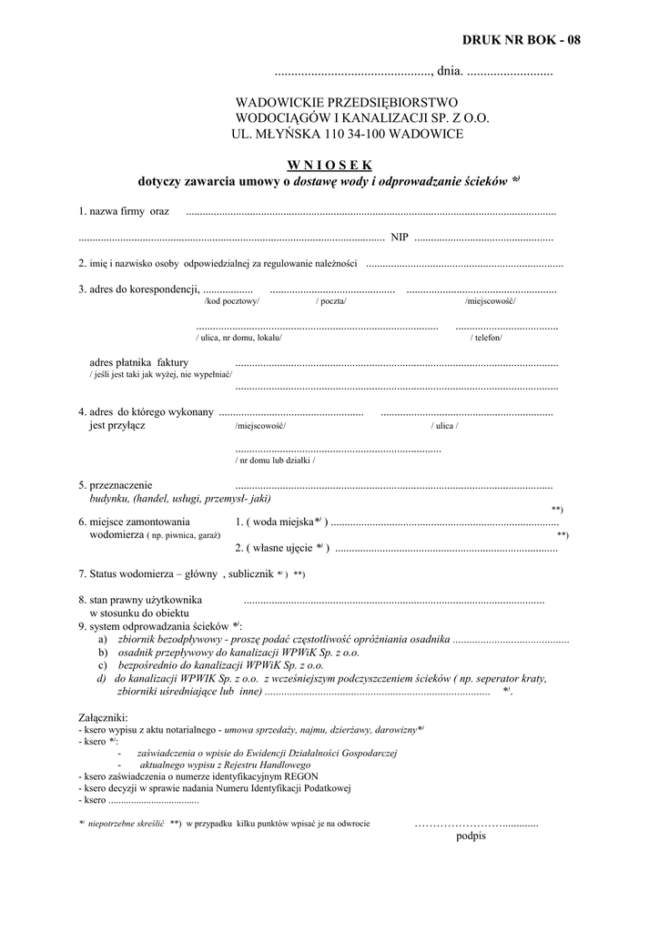 DRUK NR BOK - 08 ..............................................., dnia. .......................... WADOWICKIE PRZEDSIĘBIORSTWO WODOCIĄGÓW I KANALIZACJI SP. Z O.O. UL. MŁYŃSKA 110 34-100 WADOWICE WNIOSEK dotyczy zawarcia umowy o dostawę wody i odprowadzanie ścieków *) 1. nazwa firmy oraz ..................................................................................................................................... .............................................................................................................. NIP .................................................. 2. imię i nazwisko osoby odpowiedzialnej za regulowanie należności ....................................................................... 3. adres do korespondencji, .................. ............................................. /kod pocztowy/ ...................................................... / poczta/ /miejscowość/ ....................................................................................... ..................................... / ulica, nr domu, lokalu/ adres płatnika faktury / telefon/ .................................................................................................................... / jeśli jest taki jak wyżej, nie wypełniać/ .................................................................................................................... 4. adres do którego wykonany .................................................... jest przyłącz /miejscowość/ .............................................................. / ulica / .......................................................................... / nr domu lub działki / 5. przeznaczenie .................................................................................................................. budynku, (handel, usługi, przemysł- jaki) **) 6. miejsce zamontowania wodomierza ( np. piwnica, garaż) 1. ( woda miejska*) ) .................................................................................. **) 2. ( własne ujęcie *) ) ................................................................................ 7. Status wodomierza – główny , sublicznik *) ) **) 8. stan prawny użytkownika ............................................................................................................ w stosunku do obiektu 9. system odprowadzania ścieków *): a) zbiornik bezodpływowy - proszę podać częstotliwość opróżniania osadnika .......................................... b) osadnik przepływowy do kanalizacji WPWiK Sp. z o.o. c) bezpośrednio do kanalizacji WPWiK Sp. z o.o. d) do kanalizacji WPWIK Sp. z o.o. z wcześniejszym podczyszczeniem ścieków ( np. seperator kraty, zbiorniki uśredniające lub inne) ................................................................................. * ). Załączniki: - ksero wypisu z aktu notarialnego - umowa sprzedaży, najmu, dzierżawy, darowizny*) - ksero *): zaświadczenia o wpisie do Ewidencji Działalności Gospodarczej aktualnego wypisu z Rejestru Handlowego - ksero zaświadczenia o numerze identyfikacyjnym REGON - ksero decyzji w sprawie nadania Numeru Identyfikacji Podatkowej - ksero .................................... *) niepotrzebne skreślić **) w przypadku kilku punktów wpisać je na odwrocie ……………………............. podpis