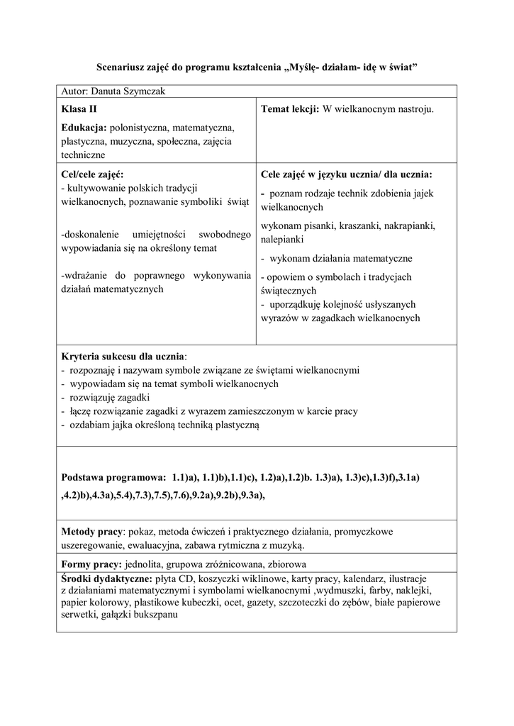 Scenariusz zajęć do programu kształcenia „Myślę- działam- idę w świat” Autor: Danuta Szymczak Klasa II Temat lekcji: W wielkanocnym nastroju. Edukacja: polonistyczna, matematyczna, plastyczna, muzyczna, społeczna, zajęcia techniczne Cel/cele zajęć: - kultywowanie polskich tradycji wielkanocnych, poznawanie symboliki świąt Cele zajęć w języku ucznia/ dla ucznia: - poznam rodzaje technik zdobienia jajek wielkanocnych wykonam pisanki, kraszanki, nakrapianki, -doskonalenie umiejętności swobodnego nalepianki wypowiadania się na określony temat - wykonam działania matematyczne -wdrażanie do poprawnego wykonywania - opowiem o symbolach i tradycjach działań matematycznych świątecznych - uporządkuję kolejność usłyszanych wyrazów w zagadkach wielkanocnych Kryteria sukcesu dla ucznia: - rozpoznaję i nazywam symbole związane ze świętami wielkanocnymi - wypowiadam się na temat symboli wielkanocnych - rozwiązuję zagadki - łączę rozwiązanie zagadki z wyrazem zamieszczonym w karcie pracy - ozdabiam jajka określoną techniką plastyczną Podstawa programowa: 1.1)a), 1.1)b),1.1)c), 1.2)a),1.2)b. 1.3)a), 1.3)c),1.3)f),3.1a) ,4.2)b),4.3a),5.4),7.3),7.5),7.6),9.2a),9.2b),9.3a), Metody pracy: pokaz, metoda ćwiczeń i praktycznego działania, promyczkowe uszeregowanie, ewaluacyjna, zabawa rytmiczna z muzyką. Formy pracy: jednolita, grupowa zróżnicowana, zbiorowa Środki dydaktyczne: płyta CD, koszyczki wiklinowe, karty pracy, kalendarz, ilustracje z działaniami matematycznymi i symbolami wielkanocnymi ,wydmuszki, farby, naklejki, papier kolorowy, plastikowe kubeczki, ocet, gazety, szczoteczki do zębów, białe papierowe serwetki, gałązki bukszpanu Przebieg zajęć „Drogowskazy” -wskazówki i uwagi o realizacji Centra Aktywnej Edukacji 1.Muzyczna loteryjka- zabawa muzyczno-ruchowa na dobry początek. artystyczno- Uczniowie tańczą dowolnie w rytm muzyki. Nauczyciel po pewnej ruchowe chwili wyłącza muzykę i poleca jednemu z uczestników wyciągnąć los z pojemnika. Na losie napisane jest polecenie, według którego uczestnicy tańczą dalej po ponownym włączeniu muzyki. Np. :"Tańczymy jak motyle", "Tańczymy klaszcząc nad głową", "Tańczymy na palcach" itp. Po przetańczeniu jednego polecenia muzyka zostaje wyłączona i wyciągany jest następny los. 2.Nauczyciel demonstruje uczniom koszyczek wiklinowy polonistyczno- i worek św. Mikołaja Prosi, aby dzieci podały nazwę świąt, z którymi komunikacyjne związane są te przedmioty. 3.Nauczyciel przypina na tablicy wyraz „WIELKANOC” polonistyczno- Prosi uczniów, aby podali i zapisali na kartkach skojarzenia komunikacyjne związane z tym słowem. Następnie tworzymy słoneczko skojarzeń. Po wykonaniu zadania odczytujemy zapis i analizujemy wyrazy, które powtarzają się najczęściej. 4.Sformułowanie wspólnie z uczniami celów zajęć, określenie polonistyczno- kryterium sukcesu. komunikacyjne 5.Nauczyciel rozdaje uczniom kartę pracy, na której zapisane są wyrazy, rozwiązania zagadek. Uczniowie słuchają tekst czytany przez polonistyczno- lektora komunikacyjne http://www.superkid.pl/zagadki-wielkanoc odszukują odpowiedni wyraz i zapisują przy nim cyfrę oznaczającą kolejność rozwiązania zagadek. Biały barszcz polonistyczno- Jajko komunikacyjne Bazie kotki Zajączek wielkanocny Śmigus - dyngus Kurczątko Baranek Zajączek wielkanocny Święconka Baba wielkanocna Życzenia 6. Uczniowie odszukują w kalendarzach z minionych 3 lat daty świąt matematyczno- wielkanocnych i daty świąt Bożego Narodzenia. przyrodnicze Porównywanie czasu obchodów świąt. Zwrócenie uwagi na daty świąt wielkanocnych. 7. Nauczyciel przekazuje uczniom informacje na temat Wielkanocy. ŚWIĘTA WIELKANOCNE To najważniejsze święto chrześcijańskie. Obchodzi się je na pamiątkę Zmartwychwstania Chrystusa. Są to święta ruchome (nie ma wyznaczonej konkretnej daty), ale zawsze obchodzimy je w okresie wiosennym. Wielkanoc poprzedzona jest 40-dniowym Wielkim Postem oraz Wielkim Tygodniem. polonistycznokomunikacyjne 8.Praca w parach- rozmowa o symbolach wielkanocnych. polonistyczno- Nauczyciel rozkłada na dywanie kartoniki. Z jednej strony zapisane są komunikacyjne działania matematyczne, z drugiej przedstawione są ilustracje symboli świąt. Uczniowie chodzą w rytm muzyki, zabierają z dywanika po jednym kartoniku, wykonują działania matematyczne, odszukują partnera z tym samym wynikiem. Łączą się w pary i rozmawiają na temat przedstawionych ilustracji. Wypowiedzi powinny być skupione wokół doświadczeń uczniów, np.: jeśli uczeń ma na swojej ilustracji pisankę to opowiada koledze o niej, czy w domu istnieje zwyczaj zdobienia jajek, czy podczas śniadania wielkanocnego rodzina dzieli się święconym jajkiem itd. 9.Co powinno znaleźć się w koszyku wielkanocnym? artystyczno- Uczniowie wkładają do koszyczka odpowiednie ilustracje. Opisują co ruchowe powinno zdobić koszyk (biała serwetka, gałązki bukszpanu). 10.Zdobienie jajek przez uczniów. Nauczyciel demonstruje pisanki, kraszanki, nakrapianki i nalepianki. artystyczno- Uczniowie wypowiadają się na temat techniki ich wykonania, podają co ruchowe użyto do ich ozdoby. Kraszanka to jajko malowane lub barwione gładko, na jeden kolor. Pisanki to jajka na, których umieszcza się wzorki i ornamenty. Nalepianki -nakleja się na jajka różne emblematy np. kwiatki, zwierzątka, włóczkę. Nakrapianki powstają przez skrapianie jajek farbą(załącznik nr 1) Uczniowie dzielą się na grupy, według przyjętych w klasie kryteriów. Każda grupa wykonuje inny rodzaj zdobienia jajek. Nauczyciel objaśnia sposób wykonania pracy, zachęca dzieci do pobudzania własnej wyobraźni, przypomina o zachowaniu zasad bezpieczeństwa podczas wykonywania pracy oraz konieczności utrzymania ładu i porządku na stanowisku pracy. Dzieci wykonują prace według własnych pomysłów, wykorzystując przygotowane wydmuszki z jaje
