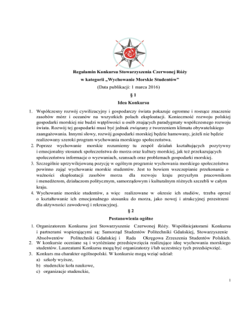 Regulamin Konkursu Stowarzyszenia Czerwonej Róży w kategorii „Wychowanie Morskie Studentów” (Data publikacji: 1 marca 2016) §1 Idea Konkursu 1. Współczesny rozwój cywilizacyjny i gospodarczy świata pokazuje ogromne i rosnące znaczenie zasobów mórz i oceanów na wszystkich polach eksploatacji. Konieczność rozwoju polskiej gospodarki morskiej nie budzi wątpliwości u osób znających paradygmaty współczesnego rozwoju świata. Rozwój tej gospodarki musi być jednak związany z tworzeniem klimatu obywatelskiego zaangażowania. Innymi słowy, rozwój gospodarki morskiej będzie hamowany, jeżeli nie będzie realizowany szeroki program wychowania morskiego społeczeństwa. 2. Poprzez wychowanie morskie rozumiemy tu zespół działań kształtujących pozytywny i emocjonalny stosunek społeczeństwa do morza oraz kultury morskiej, jak też przekazujących społeczeństwu informacje o wyzwaniach, szansach oraz problemach gospodarki morskiej. 3. Szczególnie uprzywilejowaną pozycję w ogólnym programie wychowania morskiego społeczeństwa powinno zająć wychowanie morskie studentów. Jest to bowiem wszczepianie przekonania o ważności eksploatacji zasobów morza dla rozwoju kraju przyszłym pracownikom i menedżerom, działaczom politycznym, samorządowym i kulturalnym różnych szczebli w całym kraju. 4. Wychowanie morskie studentów, a więc realizowane w okresie ich studiów, trzeba oprzeć o kształtowanie ich emocjonalnego stosunku do morza, jako nowej i atrakcyjnej przestrzeni dla aktywności zawodowej i rekreacyjnej. §2 Postanowienia ogólne 1. Organizatorem Konkursu jest Stowarzyszenie Czerwonej Róży. Współinicjatorami Konkursu i partnerami wspierającymi są: Samorząd Studentów Politechniki Gdańskiej, Stowarzyszenie Absolwentów Politechniki Gdańskiej i Rada Okręgowa Zrzeszenia Studentów Polskich. 2. W konkursie oceniane są i wyróżniane przedsięwzięcia realizujące ideę wychowania morskiego studentów. Laureatami Konkursu mogą być organizatorzy i/lub uczestnicy tych przedsięwzięć. 3. Konkurs ma charakter ogólnopolski. W konkursie mogą wziąć udział: a) szkoły wyższe, b) studenckie koła naukowe, c) organizacje studenckie, 1 d) kluby uczelniane i środowiskowe, e) kluby i stowarzyszenia absolwenckie, f) osoby indywidualne (studenci, pracownicy i absolwenci szkół wyższych). 4. Do Konkursu mogą być zgłaszane przedsięwzięcia, które zostały przygotowane i zrealizowane niekomercyjnie, w okresie ostatnich trzech lat. Przedsięwzięcia te mogą korzystać ze sponsoringu wynikającego z reklam firm i instytucji, ale uczestnicy i organizatorzy tych przedsięwzięć nie mogą traktować tych przychodów jako źródeł swojego utrzymania, czy zysków. 5. Wyboru laureatów konkursu dokonuje siedmioosobowa Kapituła Konkursu powołana przez Zarząd Stowarzyszenia Czerwonej Róży. 6. Posiedzenia Kapituły Konkursowej, którym przewodniczy Prezes lub upoważniony przez niego członek Stowarzyszenia Czerwonej Róży, zwołuje Zarząd Stowarzyszenia Czerwonej Róży. §3 Zasady Konkursu 1. Konkurs jest ogłaszany przez Zarząd Stowarzyszenia Czerwonej Róży. 2. W Konkursie oceniane i wyróżniane będą następujące rodzaje przedsięwzięć: a) imprezy promujące kulturę i gospodarkę morską organizowane w środowiskach akademickich, b) zloty turystyczne i towarzyskie regaty na akwenach morskich i rzecznych integrujące studentów uczelni nadbałtyckich, c) rejsy i wyprawy żeglarskie i wioślarskie na akwenach mórz i oceanów oraz na szlakach śródlądowych, d) wyprawy turystyki podwodnej na obszarach mórz i oceanów oraz ujść rzek, e) wyprawy turystyki poznawczej na obszarach wysp, wybrzeży mórz i oceanów oraz ujść rzek, f) konferencje i seminaria naukowe organizowane na pokładach żaglowców, g) szkoły pod żaglami dla studentów na pokładach żaglowców, h) kompleksowe programy wychowania morskiego studentów realizowane na polskich szkołach wyższych, i) wybitne osiągnięcia akademickich klubów i sekcji żeglarskich, klubów wioślarskich oraz klubów nurkowych, j) wybitne projekty studenckich kół naukowych dotyczące wykorzystania zasobów morza, transportu morskiego i intermodalnego dla rozwoju kraju, k) inne spełniające misję Konkursu. 3. Warunkiem prawidłowego zgłoszenia się do Konkursu jest wypełnienie łącznie poniższych obowiązków: a. wypełnienie formularza dostępnego na stronie Stowarzyszenia Czerwonej Róży (www.czerwonaroza.org.pl), b. przygotowanie elektronicznej prezentacji zgłoszonego przedsięwzięcia w formacie PDF, prezentacja może zawierać maksymalnie 4 strony w formacie A4, celem prezentacji jest w sposób jednoznaczny i wyczerpujący przedstawienie kandydatury przedsięwzięcia, w zakresie merytorycznym adekwatnym do kategorii, o której mowa w ust 1. 2 c. załączenie rekomendacji uczelni wyższej, z której kandydat się wywodzi lub z którą współpracuje d. przesłanie kompletu dokumentów na adres e-mail [email protected] oraz w formie papierowej na adres: Kancelaria notarialna Piotra Lisa, ul. Traugutta 111, 80980 Gdańsk, z dopiskiem „Wychowanie morskie studentów” do dnia 22 kwietnia 2016 r. e. załączenie co najmniej jednej fotografii kandydata, w wersji elektronicznej ( format jpg, rozdzielczość min. 300 dpi). 4. Zasady wyłonienia nominowanych do Konkursu: a. Kapituła Konkursu w oparciu o prezentacje, o których mowa w ust 2 pkt b) wybierze przedsięwzięcia nominowane do ostatecznej klasyfikacji Konkursu w terminie do 10 maja 2016 r., b. do ostatecznej klasyfikacji dopuszczonych zostaje maksymalnie 15 przedsięwzięć. Klasyfikacja ta opierać się będzie o przyjęte przez Kapitułę zasady punktacji. 5. Zasady wyłonienia laureatów Konkursu: a. nominowani zaprezentują przedsięwzięcie podczas otwartej prezentacji przed Kapitułą Konkursu w dniu 20 maja 2016 r. w Narodowym Muzeum Morskim w Gdańsku, b. po prezentacji Kapituła Konkursu, na zamkniętym po