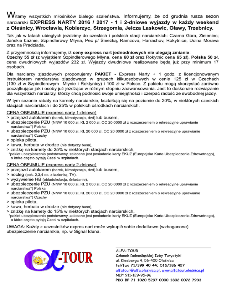 Witamy wszystkich miłośników białego szaleństwa. Informujemy, że od grudnia rusza sezon narciarski EXPRESS NARTY 2016 / 2017 - 1 i 2-dniowe wyjazdy w każdy weekend z Oleśnicy, Wrocławia, Kobierzyc, Strzegomia, Jelcza Laskowic, Oławy, Trzebnicy. Tak jak w latach ubiegłych jeździmy do czeskich i polskich stacji narciarskich: Czarna Góra, Zieleniec; Jańskie Łaźnie, Szpindlerowy Młyna, Pec p/ Śnieżką, Ramzova, Harrachov, Rokytnice, Dolna Morava oraz na Pradziada. Z przyjemnością informujemy, iż ceny express nart jednodniowych nie ulegają zmianie: Czechy 55 zł (z wyjątkiem Szpindlerowego Młyna, cena 60 zł oraz Rokytnic cena 65 zł), Polska 50 zł, cena dwudniowych wyjazdów 232 zł. Wyjazdy dwudniowe realizowane będą już przy minimum 17 osobach. Dla narciarzy zjazdowych proponujemy PAKIET - Express Narty + 1 godz. z licencjonowanym instruktorem narciarstwa zjazdowego w grupach kilkuosobowych w cenie 125 zł w Czechach (130 zł w Szpindlerowym Młynie i Roktynicy) i 100 zł w Polsce. Z pakietu mogą skorzystać zarówno początkujące jak i osoby już jeżdżące w różnym stopniu zaawansowania. Jest to doskonałe rozwiązanie dla wszystkich narciarzy, którzy chcą podnosić swoje umiejętności i czerpać radość ze swobodnej jazdy. W tym sezonie rabaty na karnety narciarskie, kształtują się na poziomie do 20%, w niektórych czeskich stacjach narciarskich i do 25% w polskich ośrodkach narciarskich. CENA OBEJMUJE (express narty 1-dniowe) > przejazd autokarem (barek, klimatyzacja, dvd) lub busem, > ubezpieczenie PZU (NNW 10 000 zł, KL 2 000 zł, OC 20 0000 zł z rozszerzeniem o rekreacyjne uprawianie narciarstwa*) Polska > ubezpieczenie PZU (NNW 10 000 zł, KL 20 000 zł, OC 20 0000 zł z rozszerzeniem o rekreacyjne uprawianie narciarstwa*) Czechy > opieka pilota, > kawa, herbata w drodze (nie dotyczy busa), > zniżkę na karnety do 25% w niektórych stacjach narciarskich, *pakiet ubezpieczenia podstawowy, zalecane jest posiadanie karty EKUZ (Europejska Karta Ubezpieczenia Zdrowotnego), o które często pytają Czesi w szpitalach. CENA OBEJMUJE (express narty 2-dniowe) > przejazd autokarem (barek, klimatyzacja, dvd) lub busem, > nocleg (pok. 2,3,4 os. z łazienką, TV), > wyżywienie HB (obiadokolacja, śniadanie), > ubezpieczenie PZU (NNW 10 000 zł, KL 2 000 zł, OC 20 0000 zł z rozszerzeniem o rekreacyjne uprawianie narciarstwa*) Polska > ubezpieczenie PZU (NNW 10 000 zł, KL 20 000 zł, OC 20 0000 zł z rozszerzeniem o rekreacyjne uprawianie narciarstwa*) Czechy > opieka pilota, > kawa, herbata w drodze (nie dotyczy busa), > zniżkę na karnety do 15% w niektórych stacjach narciarskich, *pakiet ubezpieczenia podstawowy, zalecane jest posiadanie karty EKUZ (Europejska Karta Ubezpieczenia Zdrowotnego), o które często pytają Czesi w szpitalach. UWAGA: Każdy z uczestników expres nart może wykupić sobie dodatkowe (wzbogacone) ubezpieczenie narciarskie, np. w Signal Iduna. ALFA-TOUR Członek Dolnośląskiej Izby Turystyki ul. Kleeberga 4, 56-400 Oleśnica tel/fax 71/399 40 44; 515/186 427 [email protected], www.alfatour.olesnica.pl NIP: 911-129-95-96 PKO BP 71 1020 5297 0000 1802 0072 7933 Godziny odjazdów i przystanki (Jańskie Łaźnie, Pec pod Śnieżką, Harrachov): 6.00-Oleśnica Hotel Perła; 6.25-Wrocław Korona parking nad przystankiem MPK; 6.35-Wrocław Urząd Wojewódzki; 6.45-Wrocław zatoczka autobusowa za rogiem Hallera i Powstańców Śl.; 7.30-Strzegom stacja paliw Shell al. Wojska Polskiego; Godziny odjazdów i przystanki (Zieleniec, Czarna Góra, Dolna Morava): 6.00-Oleśnica Hotel Perła; 6.25-Wrocław Korona parking nad przystankiem MPK; 6.35-Wrocław Urząd Wojewódzki; 6.45-Wrocław zatoczka autobusowa za rogiem Hallera i Powstańców Śl.; 7.00-Kobierzyce stacja paliw Shell ul. Witosa; Godziny odjazdów i przystanki (Ramzova): 6.00-Oleśnica Hotel Perła; 6.25-Wrocław Korona parking nad przystankiem MPK; 6.35-Wrocław Urząd Wojewódzki; 6.55 Oława stacja paliw Shell ul. Kutrowskiego; Godziny odjazdów i przystanki (Pradziad): 5.30-Oleśnica Hotel Perła; 5.55-Wrocław Korona parking nad przystankiem MPK; 6.05-Wrocław Urząd Wojewódzki; 6.25 Oława stacja paliw Shell ul. Kutrowskiego; Godziny odjazdów i przystanki (Szpindlerowy Młyn, Harrachov-Rokytnice 2-dniowe,Rokytnice): 5.30-Oleśnica Hotel Perła; 5.55-Wrocław Korona parking nad przystankiem MPK; 6.15-Wrocław zatoczka autobusowa za rogiem Hallera i Powstańców Śl.; 7.00-Strzegom stacja paliw Shell Al. Wojska Polskiego; Promocja co czwarty wyjazd gratis pozostaje bez zmian (3 wyjazdy pełnopłatne - 4 gratis). Promocje i zniżki pakietowe, grupowe itp. nie sumują i nie nakładają się, dotyczą tylko i wyłącznie pełnopłatnych wyjazdów 1-dniowych. Z w/w promocji wyłączone są wyjazdy 2-dniowe, będą one zaliczane tylko i wyłącznie do puli wyjazdów gratisowych 1-dniowych (np. wyjazd 2-dniowy + wyjazd 1-dniowy, kolejny jednodniowy GRATIS). Gratisy nie przechodzą na przyszły sezon 2017/2018, tym samym nie przechodzą z poprzedniego sezonu na sezon obecny, a także nie można przerzucić gratisu na inną osobę. Prosimy nie czekać z wykorzystaniem gratisu do końca sezonu, ponieważ wyjazdy na express narty są wyjazdami z wolnego naboru i w przypadku braku wymaganego minimum, wyjazd zostaje odwołany, wówczas nie będzie możliwości wykorzystania gratisu, ani przeniesienie go na sezon następny. PAKIET grupa od 7 osób, ósma jedzie Free (48 zł/ os. Czechy, 44 zł/os. Polska) Pakiet grupowy obowiązuje przy pełnej wpłacie za 7 osób, przez jedną osobę. Przy rezygnacji jednej i więcej osób obowiązuje dopłata do pełnej kwoty (8 zł Czechy, 6 zł Polska). W pakiecie grupowym nie obowiązuje promocja „czwarty wyjazd gratis” PAKIET RODZINA (2+1, 1 +2): rodzice + dzieci w wieku szkolnym do lat 13, cena: 39 zł/os. (pakiet rodzina dotyczy Czarnej Góry i Zieleńca). Przy rezygnacji jednej i więcej osób obowiązuje dopłata do pełnej kwoty 