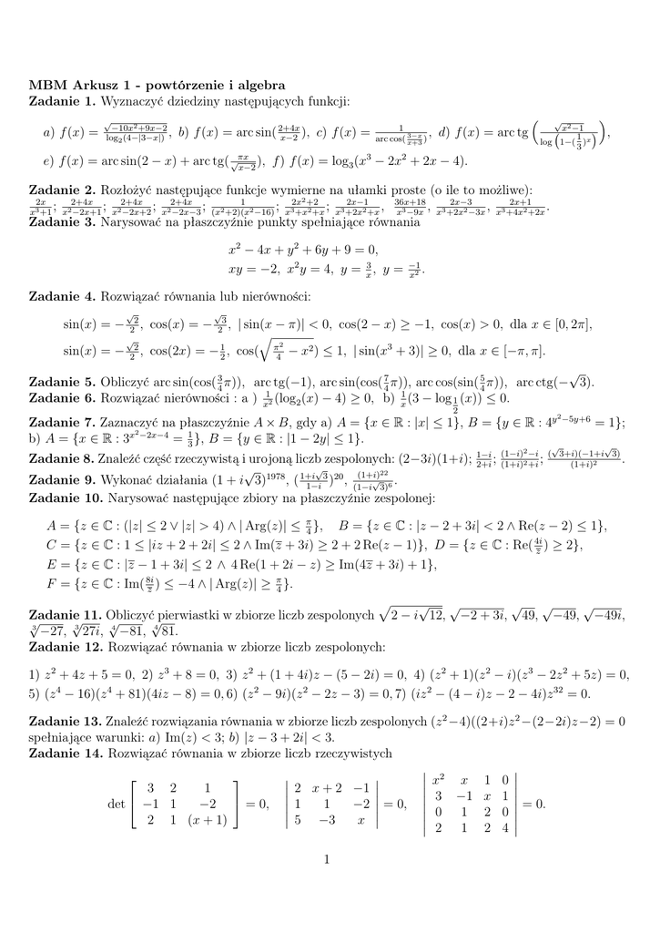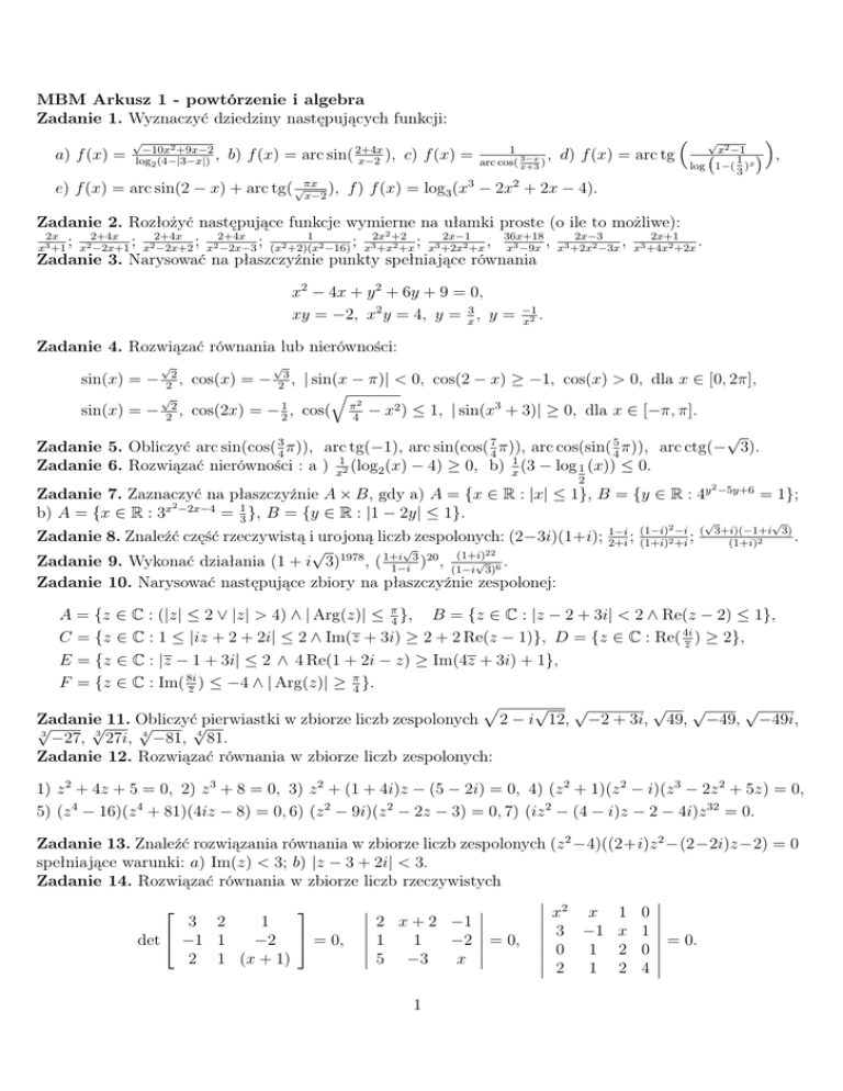 MBM Arkusz 1 - powtórzenie i algebra Zadanie 1. Wyznaczyć