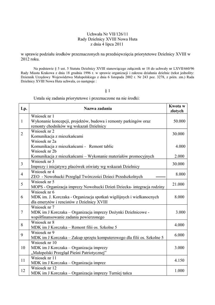 Uchwała Nr VII/126/11 Rady Dzielnicy XVIII Nowa Huta z dnia 4 lipca 2011 w sprawie podziału środków przeznaczonych na przedsięwzięcia priorytetowe Dzielnicy XVIII w 2012 roku. Na podstawie § 5 ust. 5 Statutu Dzielnicy XVIII stanowiącego załącznik nr 18 do uchwały nr LXVII/660/96 Rady Miasta Krakowa z dnia 18 grudnia 1996 r. w sprawie organizacji i zakresu działania dzielnic (tekst jednolity: Dziennik Urzędowy Województwa Małopolskiego z dnia 6 listopada 2002 r. Nr 243 poz. 3278, z późn. zm.) Rada Dzielnicy XVIII Nowa Huta uchwala, co następuje : §1 Ustala się zadania priorytetowe i przeznaczone na nie środki: Lp. 1 2 3 4 5 6 7 8 9 10 11 12 Nazwa zadania Wniosek nr 1 Wykonanie koncepcji, projektów, budowa i remonty parkingów oraz remonty chodników wg wskazań Dzielnicy Wniosek nr 2 Komunikacja z mieszkańcami Wniosek nr 2a Komunikacja z mieszkańcami - Remont tablic Wniosek nr 2b Komunikacja z mieszkańcami – Wykonanie materiałów promocyjnych Wniosek nr 3 Imprezy i inicjatywy placówek oświaty wg wskazań Dzielnicy Wniosek nr 4 ZEO - Nowohucki Przegląd Twórczości Dzieci Przedszkolnych Wniosek nr 5 MOPS - Organizacja imprezy Nowohucki Dzień Dziecka- integracja rodziny Wniosek nr 6 MDK im. J. Korczaka - Organizacja spotkań wigilijnych i wielkanocnych dla emerytów i rencistów z Dzielnicy XVIII Wniosek nr 7 MDK im J Korczaka – Organizacja imprezy Dożynki Dzielnicowe współfinansowanie zadania powierzonego Wniosek nr 8 MDK im J Korczaka – Remont filii os. Szkolne 5 Wniosek nr 9 MDK im J Korczaka – Zakup sprzętu komputerowego dla filii os. Szkolne 5 Wniosek nr 10 MDK im J Korczaka – Organizacja imprezy „Małopolski Przegląd Pieśni Patriotycznej” Wniosek nr 11 MDK im J Korczaka – Organizacja imprez Wniosek nr 12 MDK im J Korczaka – Organizacja imprezy Turniej tańca Kwota w złotych 50.000 30.000 4.000 2.000 30.000 8.000 21.000 8.000 3.000 4.000 6.000 3.000 4.150 1.000 13 14 15 16 17 18 19 20 21 22 23 24 25 26 27 28 29 30 31 32 Wniosek nr 13 MDK im J Korczaka – Organizacja imprezy Międzynarodowy Festiwal Muzyczny „Guitarra Galante” Wniosek nr 14 Ośrodek Kultury im. C.K. Norwida – Organizacja konkursu Od Wandy do Sendzimira Wniosek nr 15 Ośrodek Kultury im. C.K. Norwida – Organizacja koncertów ECCE HOMO – OTO CZŁOWIEK Wniosek nr 16 Ośrodek Kultury im. C.K. Norwida – Imprezy dla dzieci „Zima w mieście i lato w mieście” Wniosek nr 17 Ośrodek Kultury Kraków-Nowa Huta - Koncert pn „Nowa Huta Dlaczego nie?!” Wniosek nr 18 Ośrodek Kultury Kraków-Nowa Huta - Organizacja imprez Wniosek nr 19 MDK Fort 49 – Organizacja Turnieju Szkół Nowohuckich Wniosek nr 20 ZBK – wymiana okien w budynku komunalnym os. Górali 23 Wniosek nr 21 ZSS nr 14 os. Sportowe 28 – XI Międzynarodowy Konkurs Cukierniczy Wniosek nr 22 Imprezy sportowe placówek oświaty wg wskazań Dzielnicy Wniosek nr 23 MOS – Organizacja imprez Wniosek nr 24 Przedszkole Samorządowe nr 96 – II Nowohucki Turniej Szachowy Przedszkolaków Wniosek nr 25 MOS – Nowohucka Liga Mistrzów – turniej piłki nożnej Wniosek nr 26 ZSOI nr 5 – VI Międzynarodowy turniej rugby Nowa Huta 7s Wniosek nr 27 MDK im. A. Bursy Nowohuckie Zawody Sportów Ekstremalnych – zawody deskorolkowe, trialowe Wniosek nr 28 MOS – Organizacja Turnieju Piłki Siatkowej Plażowej Wniosek nr 29 Zakup urządzeń zabawowych dla Przedszkoli wg wskazań Dzielnicy Wniosek nr 30 Żłobek Samorządowy nr 5 os Willowe – dofinansowanie remontu Wniosek nr 31 Żłobek Samorządowy nr 7 os Zielone – dofinansowanie remontu Wniosek nr 32 Żłobek Samorządowy nr 13 os Centrum A – dofinansowanie remontu 1.000 1.500 1.500 4.000 10.000 6.000 1.000 5.000 2.000 5.000 4.000 2.000 4.000 2.000 3.000 5.000 12.000 5.000 5.000 5.000 33 34 35 36 37 38 39 40 41 42 43 44 45 Wniosek nr 33 Poradnia Psychologiczno-Pedagogiczna Nr 4 os Szkolne – Zakup pomocy dydaktycznych Wniosek nr 34 Doposażenie dziennego ośrodka terapii os. Górali 19 Wniosek nr 35 Dofinansowanie remontów w placówkach oświatowych wg wskazań Dzielnicy Wniosek nr 36 Ochotnicze Straże Pożarne – zakup sprzętu i umundurowania Wniosek nr 37 Straż Miejska – zakup sprzętu komputerowego Wniosek nr 38 Straż Miejska – zakup materiałów eksploatacyjnych Wniosek nr 39 Straż Miejska – dodatkowe patrole na terenie Dzielnicy XVIII Wniosek nr 40 Komenda Miejska Policji - zakup radiowozu oznakowanego Wniosek nr 41 MOPS - Kolonie dla dzieci objętych pomocą MOPS Wniosek nr 42 Organizacja spotkań wigilijnych dla dzieci niepełnosprawnych Wniosek nr 43 MOPS - Organizacji spotkań wielkanocnych dla rodzin objętych pomocą MOPS Wniosek nr 44 MOPS – Realizacja projektów socjalnych Wniosek nr 45 MOPS - Organizacja wigilii 2.000 2.000 30.000 10.000 3.000 1.000 6.000 35.000 30.000 5.000 5.000 7.000 3.000 §2 Uchwała wchodzi w życie z dniem podjęcia. Przewodniczący Rady i Zarządu Dzielnicy XVIII Nowa Huta Stanisław Moryc Uzasadnienie: Po szczegółowej analizie potrzeb i rozpatrzeniu wniosków o dofinansowanie złożonych przez jednostki z terenu Dzielnicy XVIII Rada Dzielnicy przydzieliła środki na w/w zadania priorytetowe.