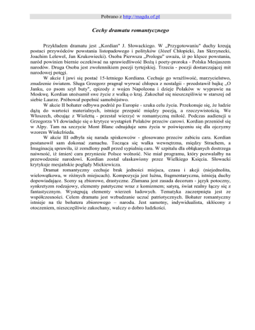 Pobrano z http://magda.of.pl Cechy dramatu romantycznego Przykładem dramatu jest „Kordian" J. Słowackiego. W „Przygotowaniu" duchy kreują postaci przywódców powstania listopadowego i polityków (Józef Chłopicki, Jan Skrzynecki, Joachim Lelewel, Jan Krukowiecki). Osoba Pierwsza „Prologu" uwaŜa, iŜ po klęsce powstania, naród powinien biernie oczekiwać na sprawiedliwość BoŜą i poety-proroka - Polska Mesjaszem narodów. Druga Osoba jest zwolennikiem poezji tyrtejskiej. Trzecia - poezji dostarczającej mit narodowej potęgi. W akcie I jawi się postać 15-letniego Kordiana. Cechuje go wraŜliwość, marzycielstwo, znudzenie światem. Sługa Grzegorz pragnął wyrwać chłopca z nostalgii - przedstawił bajkę „O Janku, co psom szył buty", epizody z wojen Napoleona i dzieje Polaków w wyprawie na Moskwę. Kordian utoŜsamił swe Ŝycie z walką o kraj. Zakochał się nieszczęśliwie w starszej od siebie Laurze. Próbował popełnić samobójstwo. W akcie II bohater odbywa podróŜ po Europie - szuka celu Ŝycia. Przekonuje się, Ŝe ludzie dąŜą do wartości materialnych, istnieje przepaść między poezją, a rzeczywistością. We Włoszech, obcując z Wiolettą - przestał wierzyć w romantyczną miłość. Podczas audiencji u Grzegorza VI dowiaduje się o krytyce wystąpień Polaków przeciw carowi. Kordian przeniósł się w Alpy. Tam na szczycie Mont Blanc odnajduje sens Ŝycia w poświęceniu się dla ojczyzny wzorem Winkelrieda. W akcie III odbyła się narada spiskowców - głosowano przeciw zabiciu cara. Kordian postanowił sam dokonać zamachu. Tocząca się walka wewnętrzna, między Strachem, a Imaginacją sprawiła, iŜ zemdlony padł przed sypialnią cara. W szpitalu dla obłąkanych dostrzega naiwność, iŜ śmierć cara przyniesie Polsce wolność. Nie miał programu, który pozwalałby na przewodzenie narodowi. Kordian został ułaskawiony przez Wielkiego Księcia. Słowacki krytykuje mesjańskie poglądy Mickiewicza. Dramat romantyczny cechuje brak jedności miejsca, czasu i akcji (niejednolita, wielowątkowa, w róŜnych miejscach). Kompozycja jest luźna, fragmentaryczna, istnieją duchy dopowiadające. Sceny są zbiorowe, drastyczne. Złamana jest zasada decorum - język potoczny, synkretyzm rodzajowy, elementy patetyczne wraz z komizmem; satyrą, świat realny łączy się z fantastycznym. Występują elementy wierzeń ludowych. Tematyka zaczerpnięta jest ze współczesności. Celem dramatu jest wzbudzanie uczuć patriotycznych. Bohater romantyczny istnieje na tle bohatera zbiorowego – narodu. Jest samotny, indywidualista, skłócony z otoczeniem, nieszczęśliwie zakochany, walczy o dobro ludzkości.