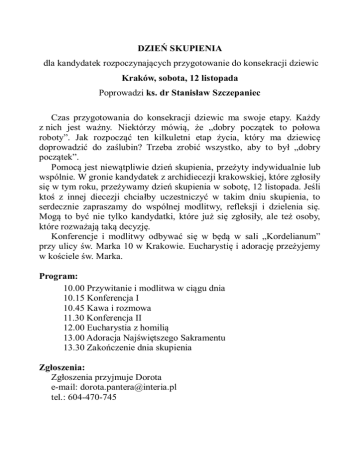DZIEŃ SKUPIENIA dla kandydatek rozpoczynających przygotowanie do konsekracji dziewic Kraków, sobota, 12 listopada Poprowadzi ks. dr Stanisław Szczepaniec Czas przygotowania do konsekracji dziewic ma swoje etapy. Każdy z nich jest ważny. Niektórzy mówią, że „dobry początek to połowa roboty”. Jak rozpocząć ten kilkuletni etap życia, który ma dziewicę doprowadzić do zaślubin? Trzeba zrobić wszystko, aby to był „dobry początek”. Pomocą jest niewątpliwie dzień skupienia, przeżyty indywidualnie lub wspólnie. W gronie kandydatek z archidiecezji krakowskiej, które zgłosiły się w tym roku, przeżywamy dzień skupienia w sobotę, 12 listopada. Jeśli ktoś z innej diecezji chciałby uczestniczyć w takim dniu skupienia, to serdecznie zapraszamy do wspólnej modlitwy, refleksji i dzielenia się. Mogą to być nie tylko kandydatki, które już się zgłosiły, ale też osoby, które rozważają taką decyzję. Konferencje i modlitwy odbywać się w będą w sali „Kordelianum” przy ulicy św. Marka 10 w Krakowie. Eucharystię i adorację przeżyjemy w kościele św. Marka. Program: 10.00 Przywitanie i modlitwa w ciągu dnia 10.15 Konferencja I 10.45 Kawa i rozmowa 11.30 Konferencja II 12.00 Eucharystia z homilią 13.00 Adoracja Najświętszego Sakramentu 13.30 Zakończenie dnia skupienia Zgłoszenia: Zgłoszenia przyjmuje Dorota e-mail: [email protected] tel.: 604-470-745