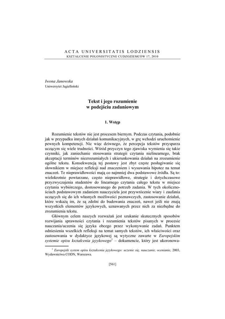 ACTA UNIVERSITATIS LODZIENSIS KSZTAŁCENIE POLONISTYCZNE CUDZOZIEMCÓW 17, 2010 Iwona Janowska Uniwersytet Jagielloński Tekst i jego rozumienie w podejściu zadaniowym 1. Wstęp Rozumienie tekstów nie jest procesem biernym. Podczas czytania, podobnie jak w przypadku innych działań komunikacyjnych, w grę wchodzi uruchomienie pewnych kompetencji. Nic więc dziwnego, że percepcja tekstów przysparza uczącym się wiele trudności. Wśród przyczyn tego zjawiska wymienia się takie czynniki, jak zaniechanie stosowania strategii czytania nielinearnego, brak akceptacji terminów niezrozumiałych i ukierunkowania działań na zrozumienie ogólne tekstu. Konsekwencją tej postawy jest zbyt częste posługiwanie się słownikiem w miejsce refleksji nad znaczeniem i wysuwania hipotez na temat znaczeń. Te nieprawidłowości mają co najmniej dwa podstawowe źródła. Są to: wielokrotnie powtarzane, często nieprawidłowe, strategie i dotychczasowe przyzwyczajenia studentów do linearnego czytania całego tekstu w miejsce czytania wybiórczego, dostosowanego do potrzeb zadania. W tych okolicznościach podstawowym zadaniem nauczyciela jest przywrócenie wiary i zaufania uczących się do ich własnych możliwości poznawczych, zastosowanie działań, które wskażą im, że są zdolni do budowania znaczeń, nawet jeśli nie znają wszystkich elementów językowych, uznawanych przez nich za niezbędne do zrozumienia tekstu. Głównym celem naszych rozważań jest szukanie skutecznych sposobów rozwijania sprawności czytania i rozumienia tekstów pisanych w procesie nauczania/uczenia się języka obcego przez wykonywanie zadań. Punktem odniesienia wszelkich refleksji na temat samych tekstów, ich właściwości oraz zastosowania w dydaktyce językowej są wytyczne zawarte w Europejskim systemie opisu kształcenia językowego1 – dokumencie, który jest ukoronowa1 Europejski system opisu kształcenia językowego: uczenie się, nauczanie, ocenianie, 2003, Wydawnictwa CODN, Warszawa. [561] 562 Iwona Janowska niem wieloletnich prac Rady Europy nad ustanowieniem wspólnej polityki językowej i określeniem zasad podejścia zadaniowego. 2. ‘Tekst’ według Europejskiego systemu opisu kształcenia językowego Pojęcie tekstu pojawia się bardzo często w zapisach Europejskiego systemu opisu... i należy do kluczowych terminów opisu językowego, a tym samym także podejścia zadaniowego. Tekst to każdy dyskurs (ustny lub pisemny), odnoszący się do danej sfery życia, który podczas wykonywania zadania komunikacyjnego staje się przyczynkiem do działania językowego, stanowiąc jego wsparcie lub cel, a więc funkcjonując jako element procesu realizacji lub jako produkt końcowy tego działania (ESOKJ 2003: 21). W innym miejscu autorzy ponownie podkreślają, że termin ‘tekst’ jest używany „do określenia każdej wypowiedzi, zarówno ustnej, jak i pisemnej, tworzonej lub wymienianej przez użytkowników/uczących się języka” (ESOKJ 2003: 87). W dydaktyce zadaniowej więc tekst to pojęcie centralne, o bardzo szerokim zakresie, służące jako określenie każdej wypowiedzi, niezależnie od tego kto, gdzie, kiedy oraz w jakiej formie (pisemnej czy ustnej) ją wytworzył. Teksty pełnią różne funkcje społeczne i przekazywane są przez różne media, z czego wynika ich zróżnicowanie w formie i treści. Podstawowe środki przekazu to mowa (akustyczne fale dźwiękowe) i pismo (druk). Medium i tekst są ze sobą ściśle związane niezależnie od funkcji, jaką pełnią. 3. O doborze tekstów Najistotniejszym problemem w pracy z tekstem (pisanym) jest jego właściwy dobór. Metodycy i badacze (zob. np. Dakowska 2001) zwracają uwagę na konieczność występowania interakcji między strukturą bodźca a procesami uruchamianymi przez mechanizm przetwarzania informacji. Tekst niewłaściwie dobrany nie prowadzi do przetwarzania informacji i powstania reprezentacji mentalnych. Przy doborze tekstów do celów dydaktycznych kryteria sprecyzowane w Europejskim systemie opisu... każą nam sięgać, w pierwszej kolejności, po teksty autentyczne, by móc odtworzyć w sali lekcyjnej sytuacje recepcji, zbliżone do rzeczywistych. Teksty narzucają najczęściej sposoby ich czytania z racji pełnionych przez nie funkcji społecznych. Wybór tekstów autentycznych przyczynia się do odtworzenia lub symulacji sytuacji komunikacyjnych, których autentyczność nie ogranicza się do używanego języka lub typu dyskursu, ale Tekst i jego rozumienie w podejściu zadaniowym 563 zawiera również elementy socjolingwistyczne, co naznacza realizmem proces czytania w sali lekcyjnej. Drugie podstawowe kryterium doboru tekstu dotyczy wiedzy uczących się w zakresie dziedziny i tematu, co wpisuje się w ich ogólną wiedzę o świecie i doświadczenia w komunikowaniu się. Dotyczy to również rodzaju dyskursu, który może występować lub nie w kulturze komunikacyjnej uczących się. Inne kryteria, które – według J.-C. Beacco (2007: 186) – należy uwzględnić to stopień przewidywalności treści, długość tekstu (raczej kilka krótszych tekstów niż jeden długi), jego struktura, np. luźne fragmenty lub tekst o jednolitej strukturze (opis wydarzenia), jego prezentacja (z ilustracjami lub bez), osoby wypowiadające się (dziennikarze, politycy etc.), nośnik (papier, CD), cechy afektywne (teksty interesujące, motywujące). Autorzy Europejskiego systemu opisu... proponują rodzaje tekstów, którymi uczący się powinien umieć się posługiwać receptywnie, produktywnie, jako uczestnik interakcji oraz jako prowadzący działania mediacyjne na różnych poziomach biegłości językowej, od A1 do C2 (ESOKJ 2003: 89). Są to: – książki – literatura piękna i literatura faktu wraz z czasopismami literackimi, – czasopisma, – gazety, – poradniki („zrób to sam”, książki kucharskie itp.), – podręczniki, – komiksy, – broszury, prospekty, – ulotki, foldery, – materia