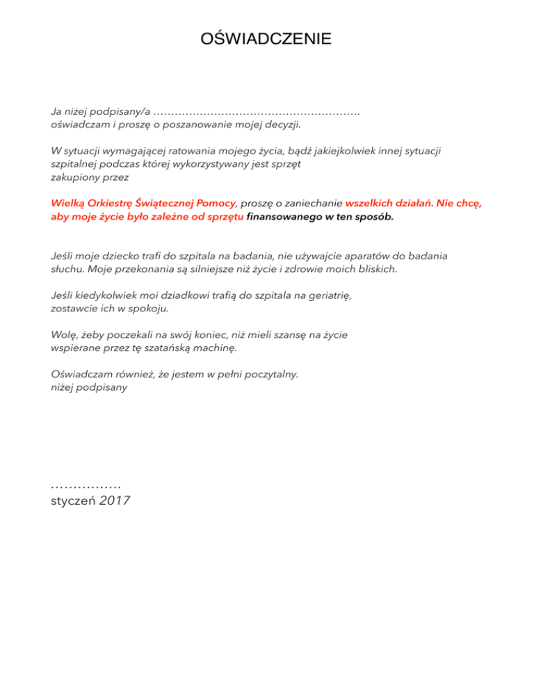 OŚWIADCZENIE Ja niżej podpisany/a …………………………………………………. oświadczam i proszę o poszanowanie mojej decyzji. W sytuacji wymagającej ratowania mojego życia, bądź jakiejkolwiek innej sytuacji szpitalnej podczas której wykorzystywany jest sprzęt zakupiony przez Wielką Orkiestrę Świątecznej Pomocy, proszę o zaniechanie wszelkich działań. Nie chcę, aby moje życie było zależne od sprzętu finansowanego w ten sposób. Jeśli moje dziecko trafi do szpitala na badania, nie używajcie aparatów do badania słuchu. Moje przekonania są silniejsze niż życie i zdrowie moich bliskich. Jeśli kiedykolwiek moi dziadkowi trafią do szpitala na geriatrię, zostawcie ich w spokoju. Wolę, żeby poczekali na swój koniec, niż mieli szansę na życie wspierane przez tę szatańską machinę. Oświadczam również, że jestem w pełni poczytalny. niżej podpisany ……………. styczeń 2017