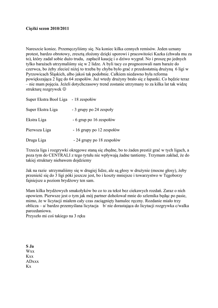 Ciężki sezon 2010/2011 Nareszcie koniec. Przemęczyliśmy się. Na koniec kilka cennych remisów. Jeden uznany protest, bardzo obrotowy, zresztą złożony dzięki uporowi i pracowitości Kazka (chwała mu za to), który zadał sobie dużo trudu, zapłacił kaucję i o dziwo wygrał. No i proszę po jednych tylko barażach utrzymaliśmy się w 2 lidze. A byli tacy co prognozowali nam baraże do czerwca, bo żeby zlecieć niżej to trzeba by chyba było grać z przedostatnią drużyną 6 ligi w Pyrzowicach Śląskich, albo jakoś tak podobnie. Całkiem niedawno była reforma powiększająca 2 ligę do 64 zespołów. Już wtedy drużyny brało się z łapanki. Co będzie teraz – nie mam pojęcia. Jeżeli dotychczasowy trend zostanie utrzymany to za kilka lat tak widzę strukturę rozgrywek ☺ Super Ekstra Bool Liga - 18 zespołów Super Ekstra Liga - 3 grupy po 24 zespoły Ekstra Liga - 6 grup po 16 zespołów Pierwsza Liga - 16 grupy po 12 zespołów Druga Liga - 24 grupy po 18 zespołów Trzecia liga i rozgrywki okręgowe staną się zbędne, bo to żaden prestiż grać w tych ligach, a poza tym do CENTRALI z tego tytułu nie wpływają żadne tantiemy. Trzymam zakład, że do takiej struktury niebawem dojdziemy Jak na razie utrzymaliśmy się w drugiej lidze, ale są głosy w drużynie (mocne głosy), żeby przenieść się do 3 ligi póki jeszcze jest, bo i koszty mniejsze i towarzystwo w Tęgoborzy fajniejsze a poziom brydżowy ten sam. Mam kilka brydżowych smakołyków bo co to za tekst bez ciekawych rozdań. Zaraz o nich opowiem. Pierwsze jest o tym jak mój partner doholował mnie do szlemika będąc po pasie, mimo, że w licytacji miałem cały czas zaciągnięty hamulec ręczny. Rozdanie miało trzy oblicza – a/ bardzo przemyślana licytacja b/ nie dorastająca do licytacji rozgrywka c/walka parozdaniowa. Przyszło mi coś takiego na 3 ręku S Ja Wxx Kxx ADxxx Kx W N Bodek E S pas 2 pas pas pas pas 3 pas 5 6 pas 3 4 5 pasy 1 4 X pas Założenia my po oni przed. Z grubsza podam co myślałem o licytacji – 3 kier Bodka jako niezła ręka z kierami i fitem karowym. Kontrę na 4 pik dałem w intencji informacji, że mam normalne otwarcie bez aspiracji szlemikowych, pas na 5 pik – partnerze widzę, że masz jakąś ekstremalną kartę więc informuję Cię, że nie mam nic w pikach. Bodek postawił mnie przed zadaniem dość trudnym, choć Deep Finnes z lekkością motyla skasował w tym rozdaniu 12 lew. W drugiej lewie wykonałem po dojrzałym namyśle ruch, który już w 3 chciałem cofnąć. Mimo to dalej dało się wygrać, tylko trzeba było mocniej uruchomić szare komórki i cofnąć się do licytacji. Brakowało niestety możliwości popatrzenia na przeciwnika z lewej (siedział za deską) i nie mogłem poprawnie ocenić jego odzywki 2 pik. Wariantów było kilka: a/ pik mu się schował, b/ figura mu się schowała, c/ robi jakiś zajazd?, d/ może ma 6 pików i 4 kiery i stąd nie otworzył blokiem f/ albo zdrzemnął sobie (była późna pora). Niby mogłem się tego z prawej podpytać co o tym sądzi, ale minę miał niezbyt zachęcającą i nie sądziłem, że udzieli sensownej odpowiedzi. -AD9xx KWxx xxxx AWxxxx W10xx 9 Dx KDxx x 10xx AW10xx Wxx Kxx ADxxx Kx Wist pikowy zabiłem karem, myślałem kilka minut ale co najmniej o minutę za krótko. Zagrałem K karo ucieszyłem się, że kara się nie dzielą 4-0 i pomknąłem w trefla . E wbił się asem i wyjątkowo wrednie odszedł karem. Kontrakt dalej się dało wygrać na impasie podwójnym W10 kier , gdybym tylko mógł (co już wyżej napisałem ☺) popatrzeć na przeciwnika z lewej. Niestety nie mogłem. Ale jako, że „dobrego gracza” szczęście nie opuszcza zawodnik E w 4-ro kartowej końcówce do K kier dołożył trefla, kiera zostawiając na później. Nie było to rozsądne, skończyło się nieprzyjemną scysją przy stole ale ostatecznie po odwołaniach zapisaliśmy sobie popartyjnego szlemika wartego aż 4 Victory. Niby utrzymaliśmy się z przewagą 6 VP ale kto wie czy ciśnienie nie byłoby większe. Dla porządku na drugim stole grano 4 karo za 150, nasi ambitni partnerzy nie spróbowali zagrać górnej końcówki pikowej lub iść w tanią obronę. A teraz rozdanie w którym stawiam piwo każdemu kto bez grania w kierki przewróci się na kontrakt 4 kier z ręki S po wiście w małego pika. Mam wrażenie, że jest to zadanie prawie niewykonalne bo po 1 wiście i po 2 następnych lewach 10 lew jest na honory. A jednak. Jest taki jeden zdolniaczek ☺. Proszę zadanie xxx Axx x KDxxxx K10xx x Kxxx A9xx Wxxx 109xx W109x x AD KDWxx ADxx W10 Wist W w małego pika, gramy waleta trefl, W wbija się asem i ponawia pika. Liczymy lewy: 5 kierowych, 2 pikowe, 2 treflowe, 1 karowa. Tyle jest grając najprościej (w końcu to mecz) byle się kiery podzieliły nie gorzej jak 4-1. Łatwo możemy wzmocnić nasze szanse wygrania grając asa karo, przebijając karo w stole i teraz dopiero ściągając kiery. Jak się podzielą 4-1 mamy co najmniej 11 lew. Dociekliwy zauważy, że w tym wariancie zawodnik W w końcówce stanie w przymusie karowo treflowym i 12 lew samo wpadnie nam do worka. Powiedzmy, że jest późna pora, kontrakt wydaje się 100% i gramy niechlujnie zapominając, że to mecz i warto bez pudła takiego chlapańca wygrać. Gramy zatem w 4-ej lewie K kier w 5 –tej damę kier i robi się nam trochę nieświeżo. No to teraz 10 trefl. Złośliwy wróg na E puszcza 10 trefl a przecież mógł zabić, „prosto świnia”. Konsekwentnie wyłączamy szare komórki i gramy na ostatnie 2 szanse!! Może się pomylą albo fałszywkę zrobią…. Kiera (kolejne beznadziejne zagranie)??? bijemy Asem w stole i znów trefla tyle, że E bije kierem i … dramat. Zrzucamy karo z rozpaczy, gość bezczelnie podgrywa kara i bez jednej. Jak tu ludziom w oczy popatrzeć po meczu. Piwa nie postawię, bo w końcu pokazałem jak się można się przewrócić. A przecież po wykonaniu tylu beznadziejnych ruc