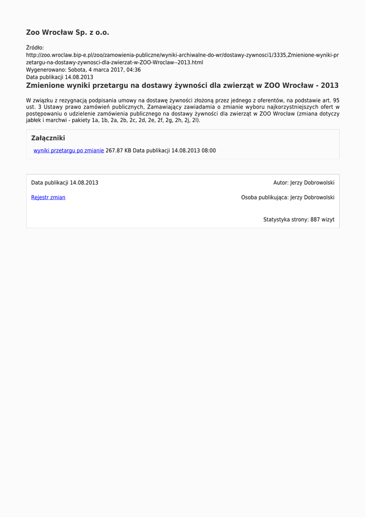 Zoo Wrocław Sp. z o.o. Źródło: http://zoo.wroclaw.bip-e.pl/zoo/zamowienia-publiczne/wyniki-archiwalne-do-wr/dostawy-zywnosci1/3335,Zmienione-wyniki-pr zetargu-na-dostawy-zywnosci-dla-zwierzat-w-ZOO-Wroclaw--2013.html Wygenerowano: Sobota, 4 marca 2017, 04:36 Data publikacji 14.08.2013 Zmienione wyniki przetargu na dostawy żywności dla zwierząt w ZOO Wrocław - 2013 W związku z rezygnacją podpisania umowy na dostawę żywności złożoną przez jednego z oferentów, na podstawie art. 95 ust. 3 Ustawy prawo zamówień publicznych, Zamawiający zawiadamia o zmianie wyboru najkorzystniejszych ofert w postępowaniu o udzielenie zamówienia publicznego na dostawy żywności dla zwierząt w ZOO Wrocław (zmiana dotyczy jabłek i marchwi - pakiety 1a, 1b, 2a, 2b, 2c, 2d, 2e, 2f, 2g, 2h, 2j, 2l). Załączniki wyniki przetargu po zmianie 267.87 KB Data publikacji 14.08.2013 08:00 Data publikacji 14.08.2013 Rejestr zmian Autor: Jerzy Dobrowolski Osoba publikująca: Jerzy Dobrowolski Statystyka strony: 887 wizyt