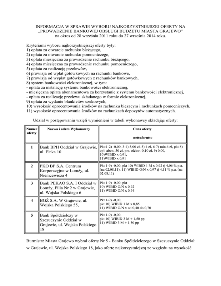 INFORMACJA W SPRAWIE WYBORU NAJKORZYSTNIEJSZEJ OFERTY NA „PROWADZENIE BANKOWEJ OBSŁUGI BUDŻETU MIASTA GRAJEWO” na okres od 28 września 2011 roku do 27 września 2014 roku. Kryteriami wyboru najkorzystniejszej oferty były: 1) opłata za otwarcie rachunku bieżącego, 2) opłata za otwarcie rachunku pomocniczego, 3) opłata miesięczna za prowadzenie rachunku bieżącego, 4) opłata miesięczna za prowadzenie rachunku pomocniczego, 5) opłata za realizację przelewów, 6) prowizja od wpłat gotówkowych na rachunki bankowe, 7) prowizja od wypłat gotówkowych z rachunków bankowych, 8) system bankowości elektronicznej, w tym: - opłata za instalację systemu bankowości elektronicznej, - miesięczna opłata abonamentowa za korzystanie z systemu bankowości elektronicznej, - opłata za realizację przelewu składanego w formie elektronicznej, 9) opłata za wydanie blankietów czekowych, 10) wysokość oprocentowania środków na rachunku bieżącym i rachunkach pomocniczych, 11) wysokość oprocentowania środków na rachunkach depozytów automatycznych. Udział w postępowaniu wzięli wymienieni w tabeli wykonawcy składając oferty: Numer oferty Nazwa i adres Wykonawcy Cena oferty netto/brutto 1 Bank BPH Oddział w Grajewie, Pkt:1-2) -0,00, 3-4) 5,00 zł, 5) 4 zł, 6-7) min.6 zł, pkt 8) opł. abon. 50 zł, prz. elektr.-0,10 zł, 9) 0,00, ul. Ełcka 10 10)WIBID x 0,91, 11)WIBID x 0,91 Pkt 1-9) -0,00, pkt 10) WIBID 1 M x 0,92 tj 4,06 % p.a. (na 02.08.11), 11) WIBID O/N x 0,97 tj 4,11 % p.a. (na 02.08.11) 2 PKO BP S.A. Centrum Korporacyjne w Łomży, ul. Niemcewicza 4 3 Bank PEKAO S.A. I Oddział w Pkt 1-9) -0,00, pkt Łomży, Filia Nr 2 w Grajewie, 10) WIBID O/N x 0,92 11) WIBID O/N x 0,94 ul. Wojska Polskiego 6 4 BGŻ S.A. W Grajewie, ul. Wojska Polskiego 55, 5 Pkt 1-9) -0,00, Bank Spółdzielczy w pkt 10) WIBID 3 M + 1,50 pp Szczuczynie Oddział w 11) WIBID 3 M + 1,50 pp Grajewie, ul. Wojska Polskiego 18 Pkt 1-9) -0,00, pkt 10) WIBID 1 M x 0,85 11) WIBID O/N x od 0,40 do 0,70 Burmistrz Miasta Grajewo wybrał ofertę Nr 5 - Banku Spółdzielczego w Szczuczynie Oddział w Grajewie, ul. Wojska Polskiego 18, jako ofertę najkorzystniejszą ze względu na wysokość oprocentowania środków na rachunku bieżącym i rachunkach pomocniczych oraz wysokość oprocentowania środków na rachunkach depozytów automatycznych.