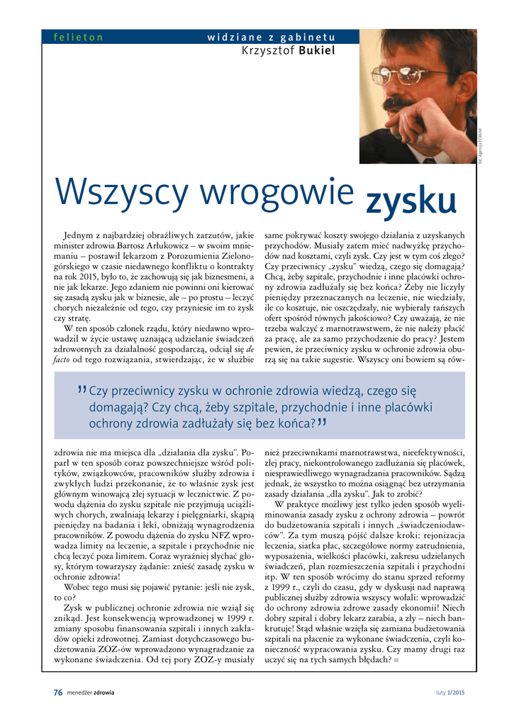 f e l i e t o n widziane z gabinetu fot. Agencja FORUM Krzysztof Bukiel Wszyscy wrogowie zysku Jednym z najbardziej obraźliwych zarzutów, jakie minister zdrowia Bartosz Arłukowicz – w swoim mniemaniu – postawił lekarzom z Porozumienia Zielonogórskiego w czasie niedawnego konfliktu o kontrakty na rok 2015, było to, że zachowują się jak biznesmeni, a nie jak lekarze. Jego zdaniem nie powinni oni kierować się zasadą zysku jak w biznesie, ale – po prostu – leczyć chorych niezależnie od tego, czy przyniesie im to zysk czy stratę. W ten sposób członek rządu, który niedawno wprowadził w życie ustawę uznającą udzielanie świadczeń zdrowotnych za działalność gospodarczą, odciął się de facto od tego rozwiązania, stwierdzając, że w służbie ” same pokrywać koszty swojego działania z uzyskanych przychodów. Musiały zatem mieć nadwyżkę przychodów nad kosztami, czyli zysk. Czy jest w tym coś złego? Czy przeciwnicy „zysku” wiedzą, czego się domagają? Chcą, żeby szpitale, przychodnie i inne placówki ochrony zdrowia zadłużały się bez końca? Żeby nie liczyły pieniędzy przeznaczanych na leczenie, nie wiedziały, ile co kosztuje, nie oszczędzały, nie wybierały tańszych ofert spośród równych jakościowo? Czy uważają, że nie trzeba walczyć z marnotrawstwem, że nie należy płacić za pracę, ale za samo przychodzenie do pracy? Jestem pewien, że przeciwnicy zysku w ochronie zdrowia oburzą się na takie sugestie. Wszyscy oni bowiem są rów- zy przeciwnicy zysku w ochronie zdrowia wiedzą, czego się C domagają? Czy chcą, żeby szpitale, przychodnie i inne placówki ochrony zdrowia zadłużały się bez końca? zdrowia nie ma miejsca dla „działania dla zysku”. Poparł w ten sposób coraz powszechniejsze wśród polityków, związkowców, pracowników służby zdrowia i zwykłych ludzi przekonanie, że to właśnie zysk jest głównym winowajcą złej sytuacji w lecznictwie. Z powodu dążenia do zysku szpitale nie przyjmują uciążliwych chorych, zwalniają lekarzy i pielęgniarki, skąpią pieniędzy na badania i leki, obniżają wynagrodzenia pracowników. Z powodu dążenia do zysku NFZ wprowadza limity na leczenie, a szpitale i przychodnie nie chcą leczyć poza limitem. Coraz wyraźniej słychać głosy, którym towarzyszy żądanie: znieść zasadę zysku w ochronie zdrowia! Wobec tego musi się pojawić pytanie: jeśli nie zysk, to co? Zysk w publicznej ochronie zdrowia nie wziął się znikąd. Jest konsekwencją wprowadzonej w 1999 r. zmiany sposobu finansowania szpitali i innych zakładów opieki zdrowotnej. Zamiast dotychczasowego budżetowania ZOZ-ów wprowadzono wynagradzanie za wykonane świadczenia. Od tej pory ZOZ-y musiały 76 menedżer zdrowia ” nież przeciwnikami marnotrawstwa, nieefektywności, złej pracy, niekontrolowanego zadłużania się placówek, niesprawiedliwego wynagradzania pracowników. Sądzą jednak, że wszystko to można osiągnąć bez utrzymania zasady działania „dla zysku”. Jak to zrobić? W praktyce możliwy jest tylko jeden sposób wyeliminowania zasady zysku z ochrony zdrowia – powrót do budżetowania szpitali i innych „świadczeniodawców”. Za tym muszą pójść dalsze kroki: rejonizacja leczenia, siatka płac, szczegółowe normy zatrudnienia, wyposażenia, wielkości placówki, zakresu udzielanych świadczeń, plan rozmieszczenia szpitali i przychodni itp. W ten sposób wrócimy do stanu sprzed reformy z 1999 r., czyli do czasu, gdy w dyskusji nad naprawą publicznej służby zdrowia wszyscy wołali: wprowadzić do ochrony zdrowia zdrowe zasady ekonomii! Niech dobry szpital i dobry lekarz zarabia, a zły – niech bankrutuje! Stąd właśnie wzięła się zamiana budżetowania szpitali na płacenie za wykonane świadczenia, czyli konieczność wypracowania zysku. Czy mamy drugi raz uczyć się na tych samych błędach? n luty 1/2015
