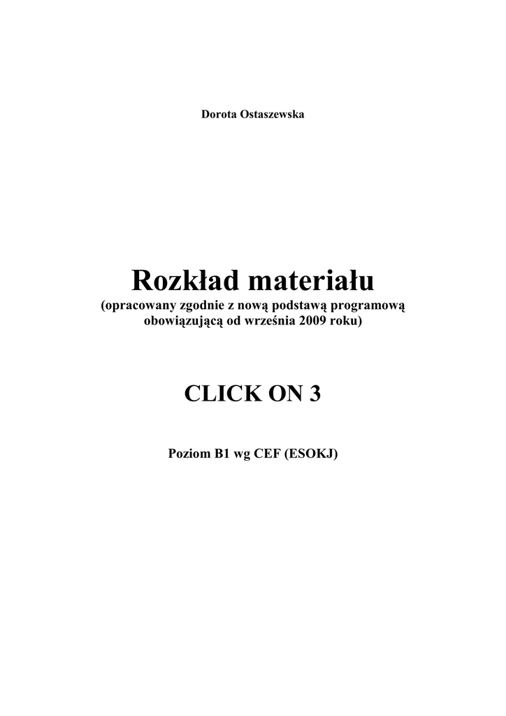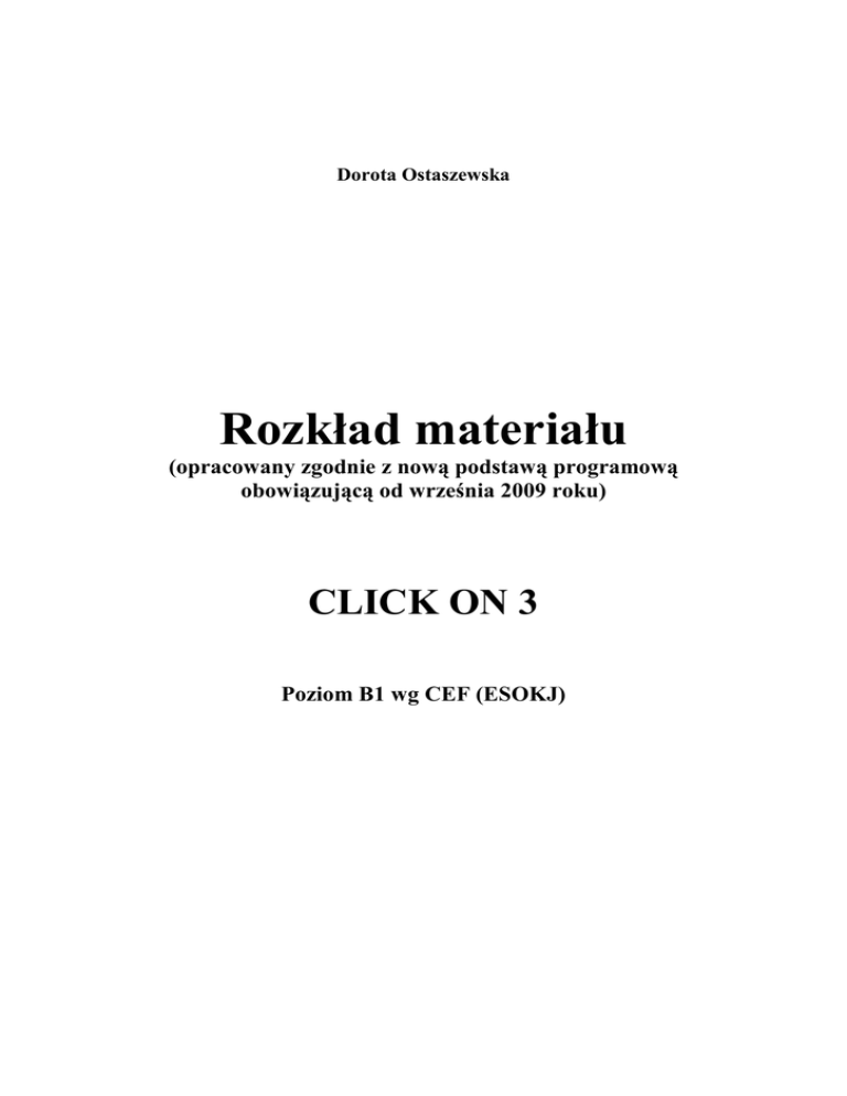 Dorota Ostaszewska Rozkład materiału (opracowany zgodnie z nową podstawą programową obowiązującą od września 2009 roku) CLICK ON 3 Poziom B1 wg CEF (ESOKJ) Wstęp Click On 3 jest podręcznikiem przeznaczonym dla uczniów gimnazjum i odpowiada poziomowi B1 w Europejskim Systemie Opisu Kształcenia Językowego. Zgodnie z nową podstawą programową, zajęcia z języka prowadzone będą na poziomie III.1. Podręcznik Click On 3 przypomina strukturą dwa poprzedzające go podręczniki – Click On 1 i Click On 2. KsiąŜkę podzielono na pięć części – modułów, z których kaŜdy zawiera dwa rozdziały (Units). Poza dziesięcioma rozdziałami podstawowymi, w podręczniku znajduje się pięć rozdziałów powtórzeniowych (na zakończenie kaŜdego z modułów) oraz dziesięć części komiksu opartego na Przygodach Hucka Finna Marka Twaina (po kaŜdym rozdziale podstawowym). Warto zauwaŜyć, iŜ powieść ta naleŜy do anglojęzycznego kanonu literackiego, dzięki czemu komiks jest nie tylko ćwiczeniem językowym, ale takŜe okazją do poszerzenia wiedzy o historii i literaturze Stanów Zjednoczonych. KaŜdy z dziesięciu rozdziałów podstawowych Click On 3 rozpoczyna się lekcją wprowadzającą ucznia w tematykę rozdziału i prezentującą realizowany w nim materiał gramatyczny. Podstawę tych lekcji stanowią trzy dialogi aktywizujące dotychczasową wiedzę ucznia na dany temat i sygnalizujące kierunki jej rozwoju. Zgodnie z teorią nauczania za pomocą technik indukcyjnych, takie podejście ułatwia uczniowi opanowanie i słownictwa, i materiału gramatycznego. Jednocześnie dialogi te stanowią podstawę ćwiczeń doskonalących rozumienie ze słuchu i czytanie ze zrozumieniem. Autorzy Click On 3 konsekwentnie stosują zasadę, która mówi, Ŝe wszystkie sprawności językowe powinny być rozwijane jednocześnie. KaŜdy z rozdziałów podręcznika zawiera ćwiczenia doskonalące umiejętności czytania i słuchania ze zrozumieniem, mówienia i pisania. Istotne jest, Ŝe forma wspomnianych zadań odpowiada testom, z jakich składa się egzamin gimnazjalny (np. dobieranie nagłówków do odpowiednich fragmentów tekstu czy określanie intencji nadawcy tekstu) oraz egzamin maturalny (np. tworzenie dialogów, w których naleŜy uzasadnić swoją opinię i przekonać do niej rozmówcę czy pisanie rozprawki). Nie brak w podręczniku takŜe ćwiczeń typowo gramatycznych – podnoszenie kompetencji gramatycznych ucznia zapewnia stały progres jakości tworzonych przez niego wypowiedzi – tak pisemnych, jak i ustnych. Wreszcie w kaŜdym rozdziale Click On 3 znajduje się zadanie doskonalące wymowę – a właściwie jej najtrudniejsze aspekty – akcent i intonację. Kurs Click On 3 składa się jednak nie tylko z podręcznika (Student’s Book); uczniowie 2 mogą korzystać takŜe z: Zeszytu ćwiczeń – składającego się z trzech części: • właściwej, czyli dziesięciu rozdziałów podstawowych (odpowiadających rozdziałom podręcznika), umoŜliwiającej utrwalenie i poszerzenie materiału podręcznikowego (do wykorzystania jako uzupełnienie lekcji lub jako praca domowa), • gramatycznej, czyli dziesięciu rozdziałów dostarczających dodatkowych zadań sprawdzających opanowanie zagadnień gramatycznych, omawianych w poszczególnych rozdziałach podręcznika), • zbioru dziesięciu testów przeznaczonych do sprawdzenia postępów uczniów po zakończeniu pracy nad kaŜdym rozdziałem części pierwszej; dwustronnej broszurki zawierającej materiały do ćwiczeń typu guided writing (Writing Projects – po jednym do kaŜdego rozdziału podręcznika) i teksty o tematyce kulturowej (Around the English-Speaking World); płyty CD (Student’s CD) do indywidualnej pracy w domu. Z myślą o nauczycielach autorzy stworzyli: podręcznik wraz z KsiąŜką dla nauczyciela (Teacher’s Book) – zawierającą klucz do ćwiczeń, zapisy nagrań i sugestie dotyczące prowadzenia poszczególnych lekcji; wersję Zeszytu ćwiczeń z kluczem (Teacher’s Workbook); broszurę z testami (Test Booklet); płyty CD (Class CDs) z nagraniami do wykorzystania na lekcji. Wśród komponentów kursu – oprócz wymienionych powyŜej – znajdują się: DVD; zeszyt ćwiczeń do DVD (DVD Activity Book); Companion oraz portfolio językowe (My Language Portfolio). Prezentowany rozkład materiału podzielono, podobnie jak w przypadku pierwszej i drugiej części kursu, na następujące rubryki: Sprawności produktywne (mówienie i pisanie); Sprawności receptywne (słuchanie i czytanie); 3 Słownictwo; Gramatyka; Wymowa. W pierwszej rubryce nauczyciel znajdzie listę funkcji językowych, które uczeń ma opanować w mowie bądź w piśmie. W rubryce uwzględniono ćwiczenia związane z broszurką Writing Projects (oznaczone w podręczniku jako Project), mimo iŜ ich celem jest raczej utrwalenie gramatyki i słownictwa niŜ rozwijanie umiejętności pisania. Rubryka druga zawiera opis ćwiczeń rozwijających umiejętności rozumienia ze słuchu oraz rozumienia tekstu czytanego. W rubryce nie uwzględniono zadań związanych z rozpoczynającymi kaŜdy rozdział dialogami, gdyŜ pełnią one głównie funkcję prezentacji materiału zawartego w rozdziale. Zawartość trzeciej rubryki stanowi zbiór dziedzin, z którymi związane jest słownictwo wprowadzane w danej części podręcznika, a w rubryce czwartej znajdują się zagadnienia gramatyczne. Osobną rubrykę poświęcono ćwiczeniom fonetycznym. Dodatkowym elementem rozkładu materiału jest ogólny opis zadań znajdujących się w pierwszych dziesięciu rozdziałach Zeszytu ćwiczeń (w rubrykach zatytułowany jako Zeszyt ćwiczeń). W rozkładzie materiału załoŜono, Ŝe realizacja materiału zawartego w kaŜdym z rozdziałów podręcznika wymaga sześciu jednostek lekcyjnych. 4 ROZKŁAD MATERIAŁU – CLICK ON 3 Sprawności produktywne (mówienie i pisanie) Jednostka Sprawności receptywne (słuchanie i czytanie) Słownictwo Gr