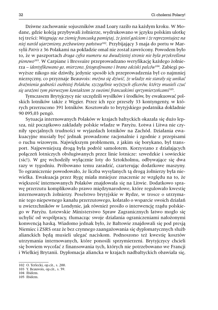 Ci cholerni Polacy! 32 Dziwne zachowanie sojuszników znad Loary raziło na każdym kroku. W Modane, gdzie koleją przybywali żołnierze, wydrukowano w języku polskim ulotkę tej treści: Wstępując na ziemię francuską pamiętaj, że jesteś gościem i że reprezentujesz na niej naród ujarzmiony, pozbawiony państwa102. Przybijający 3 maja do portu w Marsylii Patris z 36 Polakami na pokładzie omal nie został zawrócony. Powodem było to, że w paszportach druga cyfra numeru na dwudziestej stronie nie była przekreślona pionowo103. W Carpiane i Bressuire przeprowadzano weryfikację każdego żołnierza – identyfikowano go, mierzono, fotografowano i brano odciski palców104. Zabiegi powyższe nikogo nie dziwiły, jedynie sposób ich przeprowadzenia był co najmniej niezręczny, co przyznaje Beauvois: można się dziwić, że władze nie starały się unikać drażnienia godności osobistej Polaków, szczególnie wyższych oficerów, którzy musieli czuć się urażeni tym pierwszym kontaktem ze swoimi francuskimi sprzymierzeńcami105. Tymczasem Brytyjczycy nie szczędzili wysiłków i środków, by ewakuować polskich lotników także z Węgier. Przez ich ręce przeszły 33 kontyngenty, w których przerzucono 391 lotników. Kosztowało to brytyjskiego podatnika dokładnie 90 095,03 pengö. Sytuacja internowanych Polaków w krajach bałtyckich okazała się dużo lepsza, niż początkowo zakładały polskie władze w Paryżu. Łotwa i Litwa nie czyniły specjalnych trudności w wyjazdach lotników na Zachód. Działania ewakuacyjne musiały być jednak prowadzone racjonalnie i zgodnie z przepisami o ruchu wizowym. Największym problemem, z jakim się borykano, był transport. Najpewniejszą drogą była podróż samolotem. Korzystano z działających połączeń lotniczych obsługiwanych przez linie lotnicze: szwedzkie i sowieckie (sic!). W grę wchodziły wyłącznie loty do Sztokholmu, odbywające się dwa razy w tygodniu. Próbowano temu zaradzić, czarterując dodatkowe maszyny. To ograniczenie powodowało, że liczba wysyłanych tą drogą żołnierzy była niewielka. Ewakuacja przez Rygę miała mniejsze znaczenie ze względu na to, że większość internowanych Polaków znajdowała się na Litwie. Dodatkowo sprawę przerzutu komplikowało prawo międzynarodowe, które regulowało kwestię internowanych żołnierzy. Poselstwo brytyjskie w Rydze, w trosce o utrzymanie tego niepewnego kanału przerzutowego, kołatało o wsparcie swoich działań u zwierzchników w Londynie, jak również prosiło o interwencję rządu polskiego w Paryżu. Łotewskie Ministerstwo Spraw Zagranicznych łatwo mogło się uchylić od współpracy, tłumacząc swoje działania ograniczeniami nałożonymi konwencją haską. Wiadomo jednak było, że Bałtowie znajdowali się pod presją Niemiec i ZSRS oraz że bez czynnego zaangażowania się dyplomatycznych służb alianckich będą musieli ulegać naciskom. Podnoszono też kwestię kosztów utrzymania internowanych, które ponosili sprzymierzeni. Brytyjczycy chcieli się bowiem wycofać z finansowania tych, których nie potrzebowano we Francji i Wielkiej Brytanii. Dyplomacja aliancka w krajach nadbałtyckich obawiała się, 102 103 104 105 O. Terlecki, op.cit., s. 200. Y. Beauvois, op.cit., s. 59. Ibidem. Ibidem. Ci cholerni Polacy! 33 że taki krok może pociągnąć za sobą zablokowanie dalszej ewakuacji. Wobec tego Brytyjczycy w Rydze nalegali na kontynuowanie finansowania wszystkich internowanych żołnierzy106. 7 maja 1940 roku Brytyjczycy rozesłali do swoich przedstawicielstw w Bukareszcie, Belgradzie, Atenach i Rydze zapytanie o znajdujący się jeszcze w tamtych krajach polski personel lotniczy. Okazało się, że w Rumunii pozostało 2341 lotników, w Grecji 27, na Litwie 200, na Węgrzech 682. Z tej liczby w Rumunii nie było nikogo z personelu latającego. Na Węgrzech ani jednego pilota. Na Litwie i w Grecji personel uznano za mało interesujący. Biorąc pod uwagę, że nie był to personel latający, zastanawiano się, czy nie powinien zasilić Polskiej Armii we Francji lub przemysłu w krajach alianckich. Mimo że Brytyjczycy nie byli zainteresowani zatrudnianiem pozostałego na Bałkanach personelu, postanowiono nie pozostawiać polskich żołnierzy własnemu losowi. Inwazja Niemców na Zachód z 10 maja 1940 roku uniemożliwiła dalszą ewakuację. 1.5. Konferencja w Paryżu – 25 października 1939 r. Kiedy wydawało się, że sprawy odbudowy lotnictwa polskiego w Wielkiej Brytanii zależą tylko od decyzji Polaków, do sprawy włączyli się, dotąd niezainteresowani, Francuzi. 11 października 1939 roku generał Victor Denain zasugerował generałowi Zającowi konieczność odłożenia na później kwestii przerzucenia lotników polskich do Wielkiej Brytanii107. Figurujący na powyższym dokumencie odręczny dopisek świadczy o determinacji, jak i wściekłości Francuzów: Jest jasne, że o ile nie zostanie znalezione jakieś zadowalające rozwiązanie, to nie widzę powodu, dla którego mielibyśmy trzymać polski rząd i wojsko. Beauvois, w cytowanej już książce, tak komentuje zachowanie Francuzów: Czy wchodziła tu w grę chęć obrony integralności polskich sił zbrojnych, czy też może za motywacją Denaina kryła się mieszanina po prostu zawiści i anglofobii, powszechnie, według Pertinaxa108, spotykana u wyższych urzędników francuskich? Dalszy rozwój wypadków skłania nas raczej do przyjęcia drugiej hipotezy109. Z polskiej perspektywy inaczej widział to ppłk Kwieciński w swoim referacie z 1944 roku: Są wszelkie powody do przypuszczenia, że władze francuskie zaniepokojone zostały głównie myślą, że Lotnictwo Polskie przeszedłszy na stronę angielską dostanie się siłą rzeczy pod silny wpływ brytyjski i że w konsekwencji teren polski może być po wojnie, jeżeli chodzi o lotnictwo, stracony dla Francji i jej przemysłu110. Wobec tych faktów przylot do Wielkiej Brytanii generała Zają