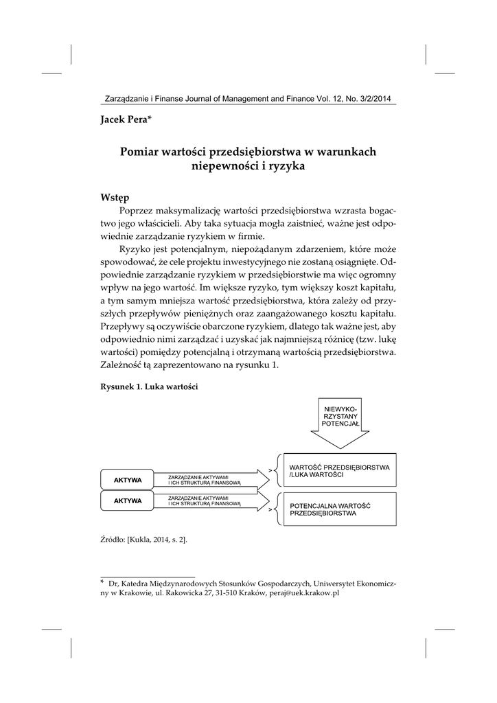 Zarz¹dzanie i Finanse Journal of Management and Finance Vol. 12, No. 3/2/2014 Jacek Pera* Jacek Pera Pomiar wartoœci przedsiêbiorstwa w warunkach niepewnoœci i ryzyka Pomiar wartoœci przedsiêbiorstwa w warunkach niepewnoœci i ryzyka Wstêp Poprzez maksymalizacjê wartoœci przedsiêbiorstwa wzrasta bogactwo jego w³aœcicieli. Aby taka sytuacja mog³a zaistnieæ, wa¿ne jest odpowiednie zarz¹dzanie ryzykiem w firmie. Ryzyko jest potencjalnym, niepo¿¹danym zdarzeniem, które mo¿e spowodowaæ, ¿e cele projektu inwestycyjnego nie zostan¹ osi¹gniête. Odpowiednie zarz¹dzanie ryzykiem w przedsiêbiorstwie ma wiêc ogromny wp³yw na jego wartoœæ. Im wiêksze ryzyko, tym wiêkszy koszt kapita³u, a tym samym mniejsza wartoœæ przedsiêbiorstwa, która zale¿y od przysz³ych przep³ywów pieniê¿nych oraz zaanga¿owanego kosztu kapita³u. Przep³ywy s¹ oczywiœcie obarczone ryzykiem, dlatego tak wa¿ne jest, aby odpowiednio nimi zarz¹dzaæ i uzyskaæ jak najmniejsz¹ ró¿nicê (tzw. lukê wartoœci) pomiêdzy potencjaln¹ i otrzyman¹ wartoœci¹ przedsiêbiorstwa. Zale¿noœæ t¹ zaprezentowano na rysunku 1. Rysunek 1. Luka wartoœci ród³o: [Kukla, 2014, s. 2]. * Dr, Katedra Miêdzynarodowych Stosunków Gospodarczych, Uniwersytet Ekonomiczny w Krakowie, ul. Rakowicka 27, 31-510 Kraków, [email protected] 6 Jacek Pera Warto tak¿e pamiêtaæ, ¿e dla ci¹g³oœci funkcjonowania przedsiêbiorstwa wa¿ne jest, aby d¹¿yæ do osi¹gniêcia akceptowalnego poziomu ryzyka i aby by³o ono na bie¿¹co identyfikowane [Kukla, 2014, s. 2]. Celem opracowania jest prezentacja problemu tworzenia wartoœci przedsiêbiorstwa w kontekœcie procesu zarz¹dzania ryzykiem. Opracowanie sk³ada siê z dwóch zasadniczych czêœci: pierwsza prezentuje zagadnienie wartoœci przedsiêbiorstwa w kontekœcie ryzyka i niepewnoœci; czêœæ druga dotyczy analizy zarz¹dzania ryzykiem w tworzeniu wartoœci przedsiêbiorstwa na przyk³adzie przedsiêbiorstwa „ALFA” Sp. z o.o. 1. Wartoœæ przedsiêbiorstwa a ryzyko i niepewnoœæ Jednym z podstawowych celów ka¿dego przedsiêbiorstwa jest maksymalizacja wartoœci przedsiêbiorstwa 1. Niektórzy autorzy, jak A.A. Berle czy M. Dood, uwa¿aj¹, ¿e przedsiêbiorstwo istnieje tylko po to, by powiêkszaæ bogactwo w³aœcicieli [Brycz, 2005, s. 27]. Cel prowadzenia dzia³alnoœci gospodarczej wyjaœnia równie¿ teoria racjonalnych oczekiwañ, wed³ug której inwestorzy zachowuj¹ siê na rynku racjonalnie, d¹¿¹c do maksymalizacji w³asnych korzyœci. Firma nie jest instytucj¹ charytatywn¹ i zasadniczym celem jest pomna¿anie kapita³u jej w³aœcicieli, a nastêpnie zaspokajanie wielu, czêsto sprzecznych interesów interesariuszy [Dobiega³a-Korona, Herman, 2006, s. 20]. Najogólniej mówi¹c, ryzyko jest wskaŸnikiem stanu lub zdarzenia, które mo¿e prowadziæ do strat. Jest ono proporcjonalne do prawdopodobieñstwa wyst¹pienia tego zdarzenia i do wielkoœci strat, które mo¿e spowodowaæ [Ciszek, 2010, s. 264]. Niepewnoœæ wystêpuje, gdy wszystkie zdarzenia s¹ dopuszczalne, ale nie jest znane prawdopodobieñstwo, które siê z jego elementami wi¹¿e. Nie jest te¿ mo¿liwe okreœlenie prawdopodobieñstwa wyst¹pienia zdarzenia losowego. 1 Kwestia celu przedsiêbiorstwa jest jednym z najbardziej spornych problemów w teorii przedsiêbiorstwa i teorii ekonomii. Wed³ug teorii neoklasycznej celem przedsiêbiorstwa jest maksymalizacja zysku, zaœ warunkiem maksymalizacji zysku zrównanie kosztów krañcowych z przychodem krañcowym. Jednak teoria neoklasyczna spotka³a siê z szeregiem zastrze¿eñ. Posiada ona wiele teorii alternatywnych, np. mened¿erskie teorie firmy czy teorie behawioralne. Teorie te jako nadrzêdny cel przedsiêbiorstwa stawiaj¹ sobie: maksymalizacjê sprzeda¿y, maksymalizacjê u¿ytecznoœci dla mened¿erów oraz maksymalizacjê wzrostu – powiêkszenie aktywów. Pomiar wartoœci przedsiêbiorstwa w warunkach niepewnoœci i ryzyka 7 ród³em niepewnoœci jest nie losowoœæ zdarzeñ, ale fakt, ¿e o wyst¹pieniu zdarzeñ jednostkowych decyduje wiele czynników, z których tylko czêœæ jest znana i mo¿liwa do uwzglêdnienia [Mises, 2007, s. 51]. Te, które mo¿na sparametryzowaæ, powinny podlegaæ dalszej mitygacji. W przypadku drugiej grupy czynników – a wiêc tych, których sparametryzowaæ nie mo¿na – nale¿y d¹¿yæ do ich maksymalnego wzglêdnego oszacowania, po to, by pozostawiæ jak najmniejsz¹ liczbê tych, które bêd¹ niemierzalne i które bêd¹ okreœlaæ niepewnoœæ w wymiarze rynkowym (a wiêc takim, na który ma wp³yw szeroko rozumiany rynek, z charakterem swojej zmiennoœci). Im bardziej niepewnoœæ bêdzie oszacowana i sparametryzowana, tym mniejsze bêdzie generowaæ ryzyko. Niepewnoœæ jest wiêc miar¹ ekspozycji na ryzyko. Precyzyjne okreœlenie tej ekspozycji jest podstaw¹ do dalszej mitygacji ryzyka. Z uwagi na fakt – o czym ju¿ wspomniano wczeœniej – ¿e ryzyko wystêpuje w dzia³alnoœci gospodarczej ka¿dego przedsiêbiorstwa – wa¿ne jest, aby w³aœciwe nim zarz¹dziæ. Od tego procesu zale¿¹ przysz³e straty, zyski i wartoœæ wszystkich podmiotów na rynku. Ryzyko jest funkcj¹ niepewnoœci, przy czym funkcja ta ma charakter zale¿noœci prostej: im wiêkszy zakres niepewnoœci, tym wiêksze ryzyko – i odwrotnie – w miarê zmniejszania siê czynników nieokreœlonych i niepewnych maleje równie¿ ryzyko. Wnioskowaæ mo¿na zatem, ¿e ryzyka nie ma tam, gdzie nie ma niepewnoœci i gdzie nie zaanga¿owano jakiegoœ kapita³u. Oczywiste jest, ¿e ryzyko wzrasta wraz z wielkoœci¹ zaanga¿owanego kapita³u. Nale¿y równie¿ zauwa¿yæ, i¿ skoro g³ównym atrybutem ryzyka jest niepewnoœæ, to na wartoœæ ryzyka zasadniczy wp³yw bêdzie mia³ te¿ czas. Oznacza to, ¿e wraz z wyd³u¿eniem horyzontu czasowego przewidywañ bêdzie ros³a ich niepewnoœæ. Ryzyko jest wiêc rezultatem niepewnoœci [Olkiewicz, 2005, s. 19–20]. Istotny wp³yw w procesie