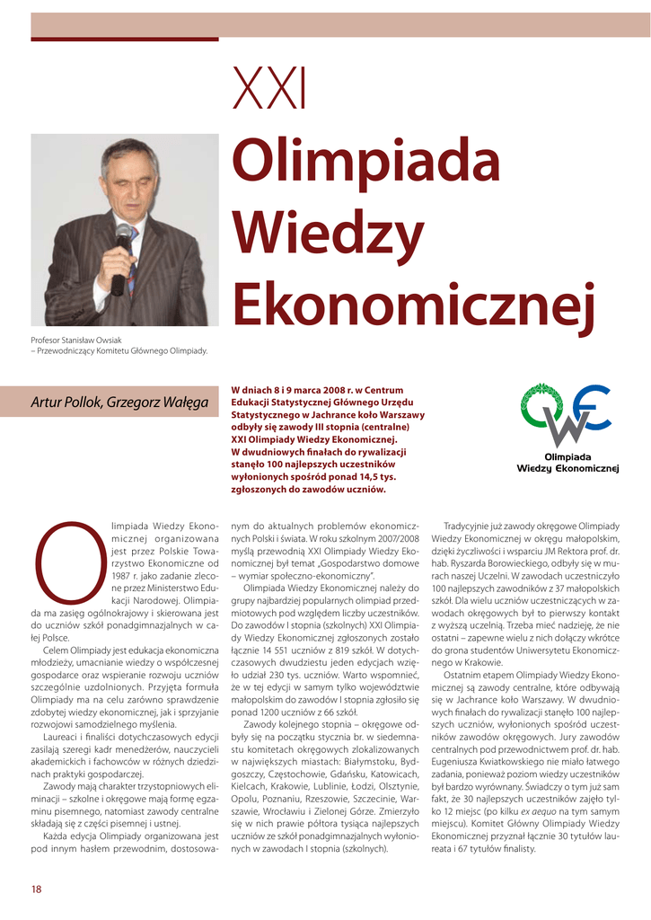 Profesor Stanisław Owsiak – Przewodniczący Komitetu Głównego Olimpiady. Artur Pollok, Grzegorz Wałęga O limpiada Wiedzy Ekonomic znej organizowana jest przez Polskie Towarzystwo Ekonomiczne od 1987 r. jako zadanie zlecone przez Ministerstwo Edukacji Narodowej. Olimpiada ma zasięg ogólnokrajowy i skierowana jest do uczniów szkół ponadgimnazjalnych w całej Polsce. Celem Olimpiady jest edukacja ekonomiczna młodzieży, umacnianie wiedzy o współczesnej gospodarce oraz wspieranie rozwoju uczniów szczególnie uzdolnionych. Przyjęta formuła Olimpiady ma na celu zarówno sprawdzenie zdobytej wiedzy ekonomicznej, jak i sprzyjanie rozwojowi samodzielnego myślenia. Laureaci i finaliści dotychczasowych edycji zasilają szeregi kadr menedżerów, nauczycieli akademickich i fachowców w różnych dziedzinach praktyki gospodarczej. Zawody mają charakter trzystopniowych eliminacji – szkolne i okręgowe mają formę egzaminu pisemnego, natomiast zawody centralne składają się z części pisemnej i ustnej. Każda edycja Olimpiady organizowana jest pod innym hasłem przewodnim, dostosowa- 18 XXI Olimpiada Wiedzy Ekonomicznej W dniach 8 i 9 marca 2008 r. w Centrum Edukacji Statystycznej Głównego Urzędu Statystycznego w Jachrance koło Warszawy odbyły się zawody III stopnia (centralne) XXI Olimpiady Wiedzy Ekonomicznej. W dwudniowych finałach do rywalizacji stanęło 100 najlepszych uczestników wyłonionych spośród ponad 14,5 tys. zgłoszonych do zawodów uczniów. nym do aktualnych problemów ekonomicznych Polski i świata. W roku szkolnym 2007/2008 myślą przewodnią XXI Olimpiady Wiedzy Ekonomicznej był temat „Gospodarstwo domowe – wymiar społeczno-ekonomiczny”. Olimpiada Wiedzy Ekonomicznej należy do grupy najbardziej popularnych olimpiad przedmiotowych pod względem liczby uczestników. Do zawodów I stopnia (szkolnych) XXI Olimpiady Wiedzy Ekonomicznej zgłoszonych zostało łącznie 14 551 uczniów z 819 szkół. W dotychczasowych dwudziestu jeden edycjach wzięło udział 230 tys. uczniów. Warto wspomnieć, że w tej edycji w samym tylko województwie małopolskim do zawodów I stopnia zgłosiło się ponad 1200 uczniów z 66 szkół. Zawody kolejnego stopnia – okręgowe odbyły się na początku stycznia br. w siedemnastu komitetach okręgowych zlokalizowanych w największych miastach: Białymstoku, Bydgoszczy, Częstochowie, Gdańsku, Katowicach, Kielcach, Krakowie, Lublinie, Łodzi, Olsztynie, Opolu, Poznaniu, Rzeszowie, Szczecinie, Warszawie, Wrocławiu i Zielonej Górze. Zmierzyło się w nich prawie półtora tysiąca najlepszych uczniów ze szkół ponadgimnazjalnych wyłonionych w zawodach I stopnia (szkolnych). Tradycyjnie już zawody okręgowe Olimpiady Wiedzy Ekonomicznej w okręgu małopolskim, dzięki życzliwości i wsparciu JM Rektora prof. dr. hab. Ryszarda Borowieckiego, odbyły się w murach naszej Uczelni. W zawodach uczestniczyło 100 najlepszych zawodników z 37 małopolskich szkół. Dla wielu uczniów uczestniczących w zawodach okręgowych był to pierwszy kontakt z wyższą uczelnią. Trzeba mieć nadzieję, że nie ostatni – zapewne wielu z nich dołączy wkrótce do grona studentów Uniwersytetu Ekonomicznego w Krakowie. Ostatnim etapem Olimpiady Wiedzy Ekonomicznej są zawody centralne, które odbywają się w Jachrance koło Warszawy. W dwudniowych finałach do rywalizacji stanęło 100 najlepszych uczniów, wyłonionych spośród uczestników zawodów okręgowych. Jury zawodów centralnych pod przewodnictwem prof. dr. hab. Eugeniusza Kwiatkowskiego nie miało łatwego zadania, ponieważ poziom wiedzy uczestników był bardzo wyrównany. Świadczy o tym już sam fakt, że 30 najlepszych uczestników zajęło tylko 12 miejsc (po kilku ex aequo na tym samym miejscu). Komitet Główny Olimpiady Wiedzy Ekonomicznej przyznał łącznie 30 tytułów laureata i 67 tytułów finalisty. Zwycięzcą XXI Olimpiady Wiedzy Ekonomicznej został Piotr Dworczak z I Liceum Ogólnokształcącego im. M. Kopernika w Łodzi. Z okręgu małopolskiego do zawodów centralnych zakwalifikowanych zostało 8 osób. Tytuł laureata zdobyli: Kalina Rogalska, Karolina Walaszek – obydwie z V Liceum Ogólnokształcącego im. A. Witkowskiego w Krakowie, Jacek Galiszewski z I Liceum Ogólnokształcącego im. M. Kromera w Gorlicach oraz Łukasz Toczek z III Liceum Ogólnokształcącego im. A. Mickiewicza w Tarnowie. Podczas finałowych zawodów rozstrzygnięto także konkurs o nagrodę specjalną Izby Zarządzających Funduszami i Aktywami (www. izfa.pl). Wyróżnienie w tym konkursie otrzymał, reprezentujący okręg małopolski, Jacek Galiszewski z I Liceum Ogólnokształcącego im. M. Kromera w Gorlicach. Prezes Polskiego Towarzystwa Ekonomicznego prof. dr hab. Elżbieta Mączyńska przyznała mu nagrodę za połączenie poezji z ekonomią w popularyzacji problematyki rynku funduszy inwestycyjnych. Uczestnicy Olimpiady rywalizują o wiele cennych nagród. Wśród nich, jak co roku, znajdą się: indeksy na najlepsze uczelnie w Polsce (do wyboru aż 38 uczelni!), nagrody pieniężne, stypendia naukowe, wyjazdy zagraniczne oraz szereg nagród rzeczowych. Również dla nauczycieli oraz najlepszych szkół przygotowywane są atrakcyjne nagrody ufundowane przez sponsorów Olimpiady. Warto podkreślić, że stosowanie do uchwały Senatu Uniwersytetu Ekonomicznego w Krakowie laureaci Olimpiady Wiedzy Ekonomicznej przyjmowani są na dowolny kierunek z pominięciem postępowania rekrutacyjnego. Należy mieć nadzieję, że wielu z nich wybierze studia właśnie na naszej Uczelni. Uroczyste zakończenie XXI Olimpiady Wiedzy Ekonomicznej połączone z wręczeniem nagród odbędzie się w Warszawie na spotkaniu w Kancelarii Prezesa Rady Ministrów z udziałem zaproszonych gości – laureatów, opiekunów młodzieży, dyrektorów szkół oraz przedstawicieli sponsorów. W prace przy organizacji Olimpiady Wiedzy Ekonomicznej zaangażowanych jest wielu pracowników U