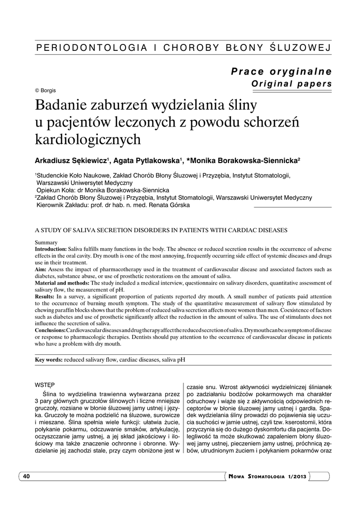 PERIODONTOLOGIA I CHOROBY BŁONY ŚLUZOWEJ Prace oryginalne © Borgis Original papers Badanie zaburzeń wydzielania śliny u pacjentów leczonych z powodu schorzeń kardiologicznych Arkadiusz Sękiewicz1, Agata Pytlakowska1, *Monika Borakowska-Siennicka2 Studenckie Koło Naukowe, Zakład Chorób Błony Śluzowej i Przyzębia, Instytut Stomatologii, Warszawski Uniwersytet Medyczny Opiekun Koła: dr Monika Borakowska-Siennicka 2 Zakład Chorób Błony Śluzowej i Przyzębia, Instytut Stomatologii, Warszawski Uniwersytet Medyczny Kierownik Zakładu: prof. dr hab. n. med. Renata Górska 1 A STUDY OF SALIVA SECRETION DISORDERS IN PATIENTS WITH CARDIAC DISEASES Summary Introduction: Saliva fulfills many functions in the body. The absence or reduced secretion results in the occurrence of adverse effects in the oral cavity. Dry mouth is one of the most annoying, frequently occurring side effect of systemic diseases and drugs use in their treatment. Aim: Assess the impact of pharmacotherapy used in the treatment of cardiovascular disease and associated factors such as diabetes, substance abuse, or use of prosthetic restorations on the amount of saliva. Material and methods: The study included a medical interview, questionnaire on salivary disorders, quantitative assessment of salivary flow, the measurement of pH. Results: In a survey, a significant proportion of patients reported dry mouth. A small number of patients paid attention to the occurrence of burning mouth symptom. The study of the quantitative measurement of salivary flow stimulated by chewing paraffin blocks shows that the problem of reduced saliva secretion affects more women than men. Coexistence of factors such as diabetes and use of prosthetic significantly affect the reduction in the amount of saliva. The use of stimulants does not influence the secretion of saliva. Conclusions: Cardiovascular diseases and drug therapy affect the reduced secretion of saliva. Dry mouth can be a symptom of disease or response to pharmacologic therapies. Dentists should pay attention to the occurrence of cardiovascular disease in patients who have a problem with dry mouth. Key words: reduced salivary flow, cardiac diseases, saliva pH WSTĘP Ślina to wydzielina trawienna wytwarzana przez 3 pary głównych gruczołów ślinowych i liczne mniejsze gruczoły, rozsiane w błonie śluzowej jamy ustnej i języka. Gruczoły te można podzielić na śluzowe, surowicze i mieszane. Ślina spełnia wiele funkcji: ułatwia żucie, połykanie pokarmu, odczuwanie smaków, artykulację, oczyszczanie jamy ustnej, a jej skład jakościowy i ilościowy ma także znaczenie ochronne i obronne. Wydzielanie jej zachodzi stale, przy czym obniżone jest w 40 czasie snu. Wzrost aktywności wydzielniczej ślinianek po zadziałaniu bodźców pokarmowych ma charakter odruchowy i wiąże się z aktywnością odpowiednich receptorów w błonie śluzowej jamy ustnej i gardła. Spadek wydzielania śliny prowadzi do pojawienia się uczucia suchości w jamie ustnej, czyli tzw. kserostomii, która przyczynia się do dużego dyskomfortu dla pacjenta. Dolegliwość ta może skutkować zapaleniem błony śluzowej jamy ustnej, pieczeniem jamy ustnej, próchnicą zębów, utrudnionym żuciem i połykaniem pokarmów oraz N OWA S TOMATOLOGIA 1/2013 Badanie zaburzeń wydzielania śliny u pacjentów leczonych z powodu schorzeń kardiologicznych zaburzeniami mowy. Kserostomia stanowi więc poważną dolegliwość, którą należy leczyć, a przede wszystkim jej zapobiegać (1, 2). W dobie XXI wieku schorzenia kardiologiczne są istotnym problemem zdrowia publicznego. Mimo rozwoju nauk farmaceutycznych oraz technologii produkcji leków, farmakoterapia stosowana w przebiegu chorób serca i układu krążenia wywiera szereg działań niepożądanych. Schorzenia te dotykają najczęściej osoby po 60 roku życia, w której to grupie obserwuje się zwiększone występowanie suchości jamy ustnej. Zmiany związane z wiekiem wraz z koniecznością stosowania terapii leczniczej przez długi okres czasu potęgują negatywny wpływ stosowanych leków (3). Badania epidemiologiczne wskazują, że problem ten dotyczy od 12,7 do 27,3% populacji, dlatego też nie powinien być lekceważony (4). nych przez pacjentów, jak tytoń, alkohol, mocna kawa, herbata i inne, stosowanej higienie jamy ustnej (szczotkowanie zębów – jak często i jaką pastą, stosowanie płukanek do jamy ustnej lub też innych preparatów), informacje na temat stosowanej przez pacjenta diety oraz użytkowania uzupełnień protetycznych. Oceny ilościowej wydzielania śliny dokonywano poprzez pomiar objętości śliny stymulowanej żuciem kostki parafinowej przez 5 min, w naczyniu z odpowiednią skalą objętości podaną w mililitrach (5, 6). Za normę ilości wydzielanej śliny stymulowanej przyjęto 1-2 ml/ min (2). Badanie pH przeprowadzano, posługując się paskami lakmusowymi o zakresie czułości pH 0-14. Papierek wskaźnikowy umieszczano w naczyniu z pobraną śliną i po upływie minuty odczytywano wartość pH, porównując zabarwienie paska z umieszczoną na opakowaniu skalą. CEL WYNIKI Celem pracy było zbadanie zależności między schorzeniami kardiologicznymi i stosowaną w ich leczeniu terapią farmakologiczną, a zaburzeniami wydzielania śliny, oraz dokonanie oceny wpływu dodatkowych czynników, takich jak: współwystępujące schorzenia, użytkowanie uzupełnień protetycznych czy stosowanie używek na ilość wydzielanej śliny. W poprzedzającej badanie kliniczne ankiecie, aż 61% pacjentów chorych na schorzenia kardiologiczne zgłaszało suchość jamy ustnej. Pacjenci zwracali uwagę, że problem pojawił się wraz z rozpoczęciem terapii farmakologicznej (ryc. 1). Wyniki badania wydzielania śliny stymulowanej wykazują, że aż u 74% pacjentów ilość wydzielonej śliny była niższa niż wskazuje norma. U 26% badanych wskaźnik był prawidłowy, a u żadnego z pacjentów nie zaobserwowano zwiększonego 
