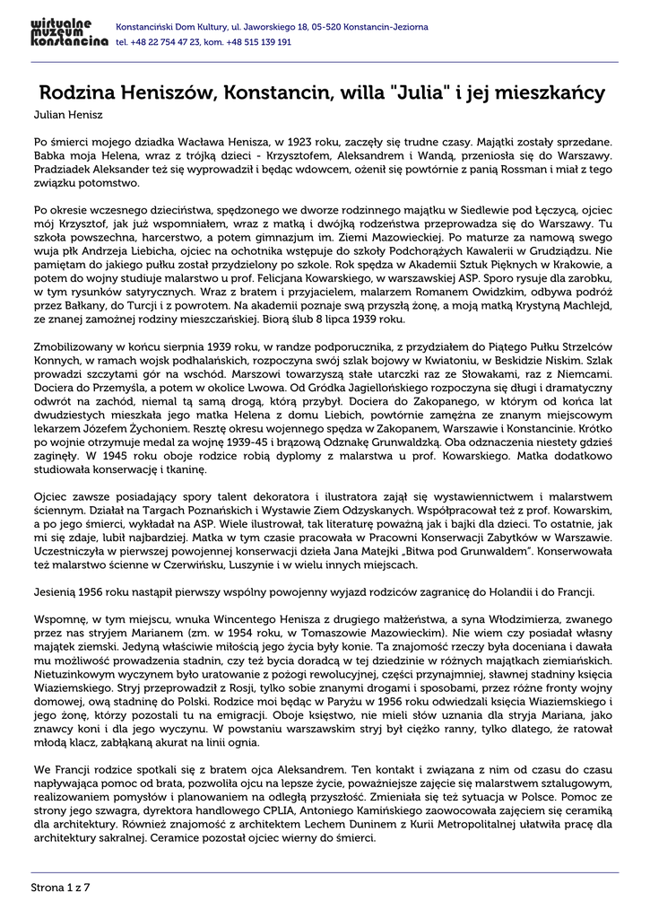 Konstanciński Dom Kultury, ul. Jaworskiego 18, 05-520 Konstancin-Jeziorna tel. +48 22 754 47 23, kom. +48 515 139 191 Rodzina Heniszów, Konstancin, willa "Julia" i jej mieszkańcy Julian Henisz Po śmierci mojego dziadka Wacława Henisza, w 1923 roku, zaczęły się trudne czasy. Majątki zostały sprzedane. Babka moja Helena, wraz z trójką dzieci - Krzysztofem, Aleksandrem i Wandą, przeniosła się do Warszawy. Pradziadek Aleksander też się wyprowadził i będąc wdowcem, ożenił się powtórnie z panią Rossman i miał z tego związku potomstwo. Po okresie wczesnego dzieciństwa, spędzonego we dworze rodzinnego majątku w Siedlewie pod Łęczycą, ojciec mój Krzysztof, jak już wspomniałem, wraz z matką i dwójką rodzeństwa przeprowadza się do Warszawy. Tu szkoła powszechna, harcerstwo, a potem gimnazjum im. Ziemi Mazowieckiej. Po maturze za namową swego wuja płk Andrzeja Liebicha, ojciec na ochotnika wstępuje do szkoły Podchorążych Kawalerii w Grudziądzu. Nie pamiętam do jakiego pułku został przydzielony po szkole. Rok spędza w Akademii Sztuk Pięknych w Krakowie, a potem do wojny studiuje malarstwo u prof. Felicjana Kowarskiego, w warszawskiej ASP. Sporo rysuje dla zarobku, w tym rysunków satyrycznych. Wraz z bratem i przyjacielem, malarzem Romanem Owidzkim, odbywa podróż przez Bałkany, do Turcji i z powrotem. Na akademii poznaje swą przyszłą żonę, a moją matką Krystyną Machlejd, ze znanej zamożnej rodziny mieszczańskiej. Biorą ślub 8 lipca 1939 roku. Zmobilizowany w końcu sierpnia 1939 roku, w randze podporucznika, z przydziałem do Piątego Pułku Strzelców Konnych, w ramach wojsk podhalańskich, rozpoczyna swój szlak bojowy w Kwiatoniu, w Beskidzie Niskim. Szlak prowadzi szczytami gór na wschód. Marszowi towarzyszą stałe utarczki raz ze Słowakami, raz z Niemcami. Dociera do Przemyśla, a potem w okolice Lwowa. Od Gródka Jagiellońskiego rozpoczyna się długi i dramatyczny odwrót na zachód, niemal tą samą drogą, którą przybył. Dociera do Zakopanego, w którym od końca lat dwudziestych mieszkała jego matka Helena z domu Liebich, powtórnie zamężna ze znanym miejscowym lekarzem Józefem Żychoniem. Resztę okresu wojennego spędza w Zakopanem, Warszawie i Konstancinie. Krótko po wojnie otrzymuje medal za wojnę 1939-45 i brązową Odznakę Grunwaldzką. Oba odznaczenia niestety gdzieś zaginęły. W 1945 roku oboje rodzice robią dyplomy z malarstwa u prof. Kowarskiego. Matka dodatkowo studiowała konserwację i tkaninę. Ojciec zawsze posiadający spory talent dekoratora i ilustratora zajął się wystawiennictwem i malarstwem ściennym. Działał na Targach Poznańskich i Wystawie Ziem Odzyskanych. Współpracował też z prof. Kowarskim, a po jego śmierci, wykładał na ASP. Wiele ilustrował, tak literaturę poważną jak i bajki dla dzieci. To ostatnie, jak mi się zdaje, lubił najbardziej. Matka w tym czasie pracowała w Pracowni Konserwacji Zabytków w Warszawie. Uczestniczyła w pierwszej powojennej konserwacji dzieła Jana Matejki „Bitwa pod Grunwaldem”. Konserwowała też malarstwo ścienne w Czerwińsku, Luszynie i w wielu innych miejscach. Jesienią 1956 roku nastąpił pierwszy wspólny powojenny wyjazd rodziców zagranicę do Holandii i do Francji. Wspomnę, w tym miejscu, wnuka Wincentego Henisza z drugiego małżeństwa, a syna Włodzimierza, zwanego przez nas stryjem Marianem (zm. w 1954 roku, w Tomaszowie Mazowieckim). Nie wiem czy posiadał własny majątek ziemski. Jedyną właściwie miłością jego życia były konie. Ta znajomość rzeczy była doceniana i dawała mu możliwość prowadzenia stadnin, czy też bycia doradcą w tej dziedzinie w różnych majątkach ziemiańskich. Nietuzinkowym wyczynem było uratowanie z pożogi rewolucyjnej, części przynajmniej, sławnej stadniny księcia Wiaziemskiego. Stryj przeprowadził z Rosji, tylko sobie znanymi drogami i sposobami, przez różne fronty wojny domowej, ową stadninę do Polski. Rodzice moi będąc w Paryżu w 1956 roku odwiedzali księcia Wiaziemskiego i jego żonę, którzy pozostali tu na emigracji. Oboje księstwo, nie mieli słów uznania dla stryja Mariana, jako znawcy koni i dla jego wyczynu. W powstaniu warszawskim stryj był ciężko ranny, tylko dlatego, że ratował młodą klacz, zabłąkaną akurat na linii ognia. We Francji rodzice spotkali się z bratem ojca Aleksandrem. Ten kontakt i związana z nim od czasu do czasu napływająca pomoc od brata, pozwoliła ojcu na lepsze życie, poważniejsze zajęcie się malarstwem sztalugowym, realizowaniem pomysłów i planowaniem na odległą przyszłość. Zmieniała się też sytuacja w Polsce. Pomoc ze strony jego szwagra, dyrektora handlowego CPLIA, Antoniego Kamińskiego zaowocowała zajęciem się ceramiką dla architektury. Również znajomość z architektem Lechem Duninem z Kurii Metropolitalnej ułatwiła pracę dla architektury sakralnej. Ceramice pozostał ojciec wierny do śmierci. Strona 1 z 7 Konstanciński Dom Kultury, ul. Jaworskiego 18, 05-520 Konstancin-Jeziorna tel. +48 22 754 47 23, kom. +48 515 139 191 Matka po wyjściu z Pracowni Konserwacji Zabytków, zaczęła pracować przez lata na warszawskiej Akademii Sztuk Pięknych, jako wykładowca rysunku, na Wydziale Konserwacji. Później, aż do emerytury, pracowała w Muzeum Etnograficznym. Pełniła wiele funkcji w Związku Polskich Artystów Plastyków, najdłużej chyba w sądzie koleżeńskim. Otrzymała dyplom i złotą odznakę tego związku. Mam wrażenie, że była powszechnie lubianą osobą, tak w pracy jak i w rodzinnym Konstancinie. Niektórzy mawiali, że pani Krystyna „to chyba na modzie chowana”. Matka zawsze cicha, skrupulatna aż do przesady, niezwykle przywiązana do męża i całej rodziny, ciągle coś zapisywała. Jak się później okazało zostawiła po sobie stertę zeszytów, zwanych przez nią dzienniczkami, w których zapisywała wszystkie codzienne sprawy. Było w nich zapisane